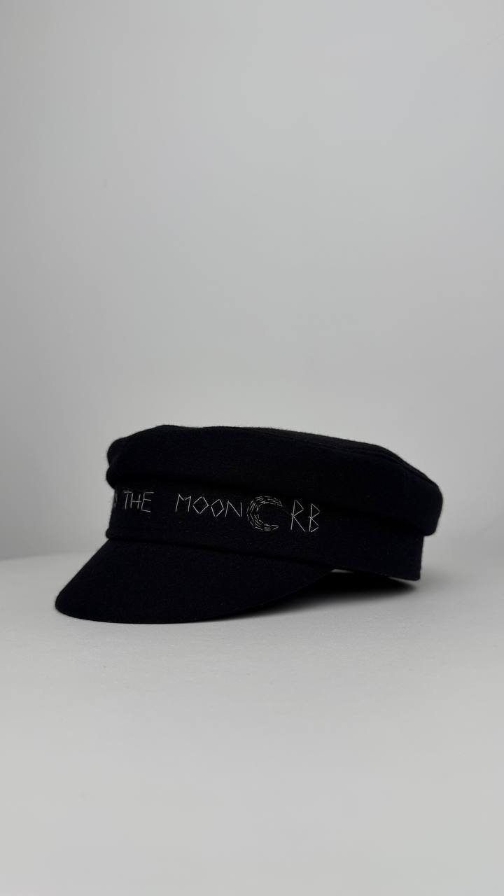 Стильна чорна кашкетка з щільної вовняної тканини з вишитим написом спереду. Класична форма з коротким козирком і м’яким об’ємом додає образу елегантного міського шарму з ноткою ретро