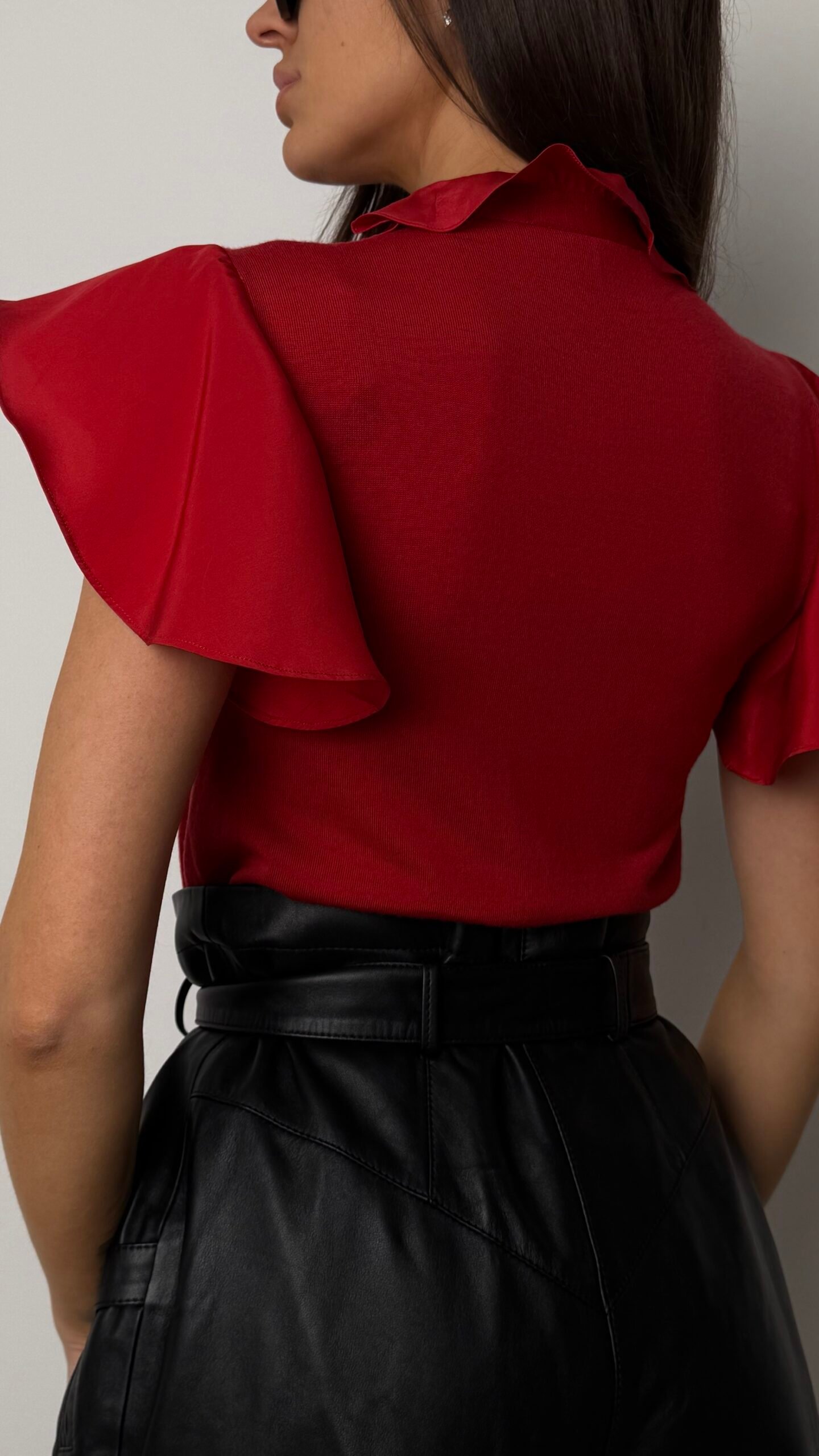 Елегантна блуза у насиченому червоному відтінку. Модель виконана з м’якої вовни, а рукави — зі шовку, що додає легкості та делікатного блиску. Акуратний виріз із тонким шкіряним шнурком створює вишуканий акцент, надаючи образу сучасності