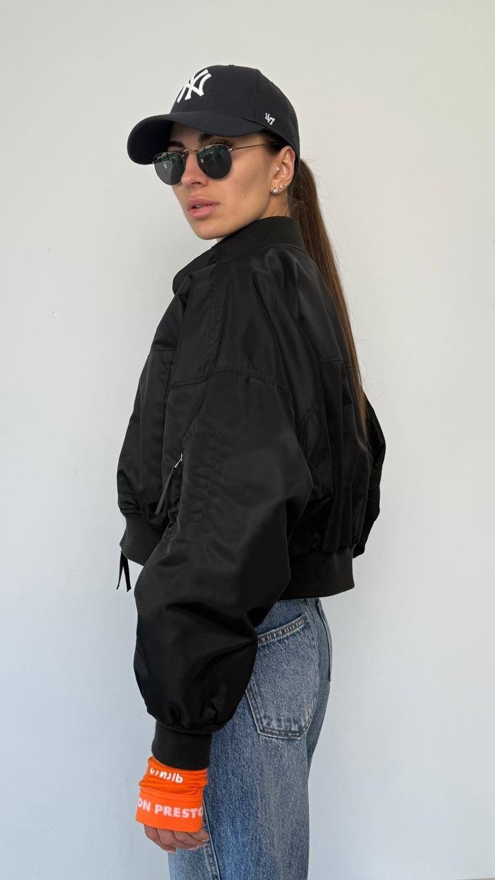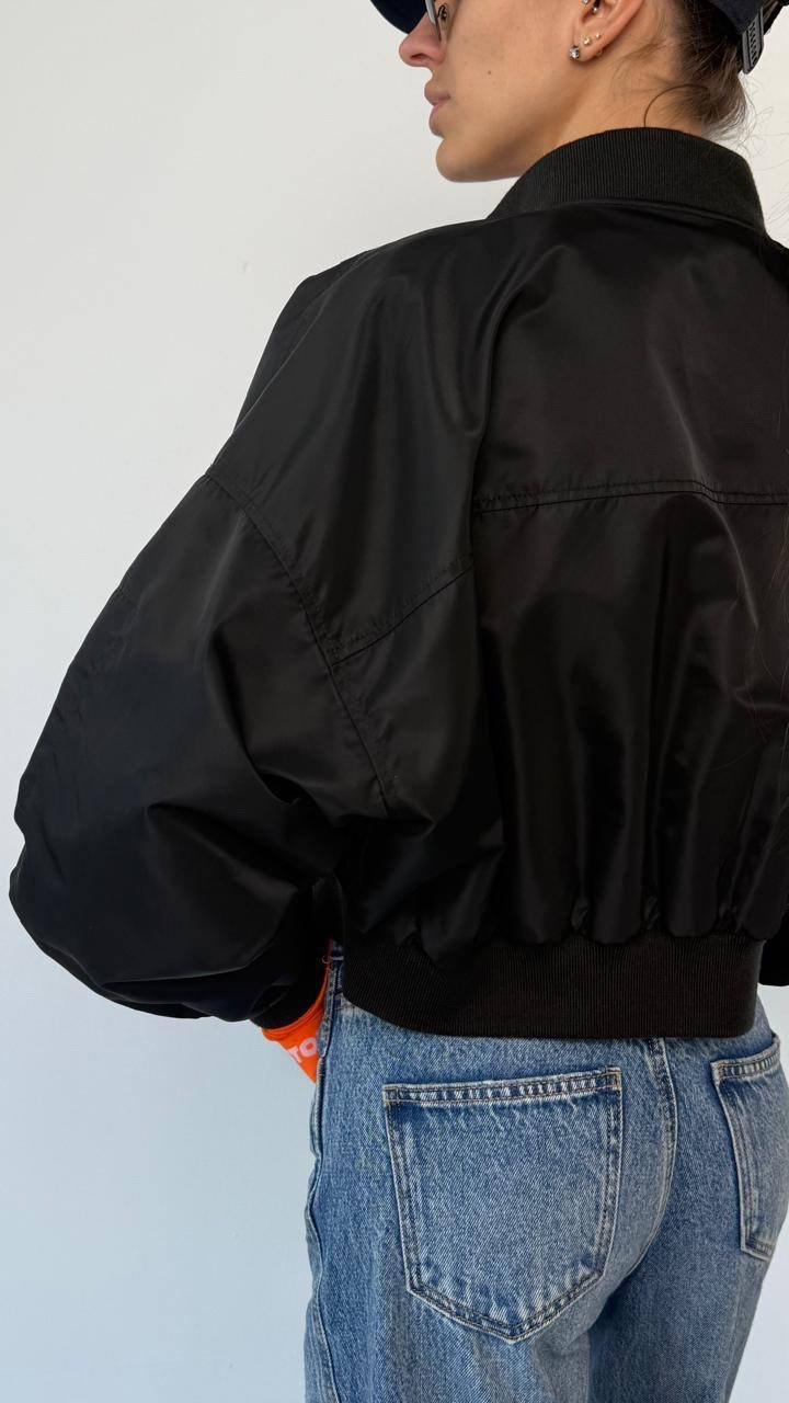 Лаконічний чорний бомбер з легким об’ємом і яскравою контрастною підкладкою