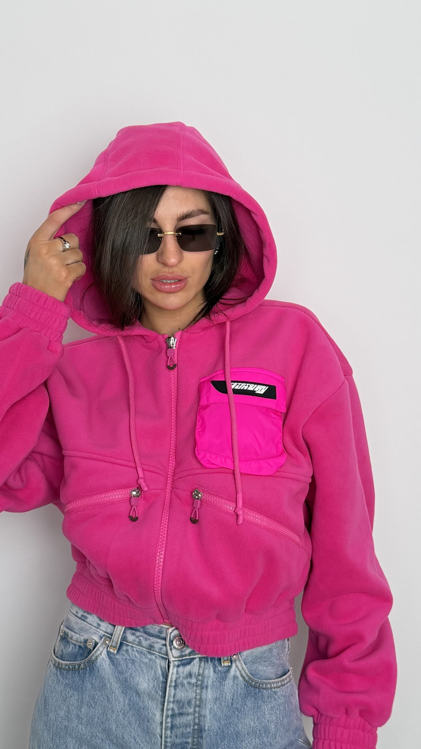 Яскрава фуксійна куртка Rotate Birger Christensen, яка одразу привертає увагу. Коротка модель з капюшоном і спортивними деталями створює сміливий fashion-statement та чудово доповнює street-style образи