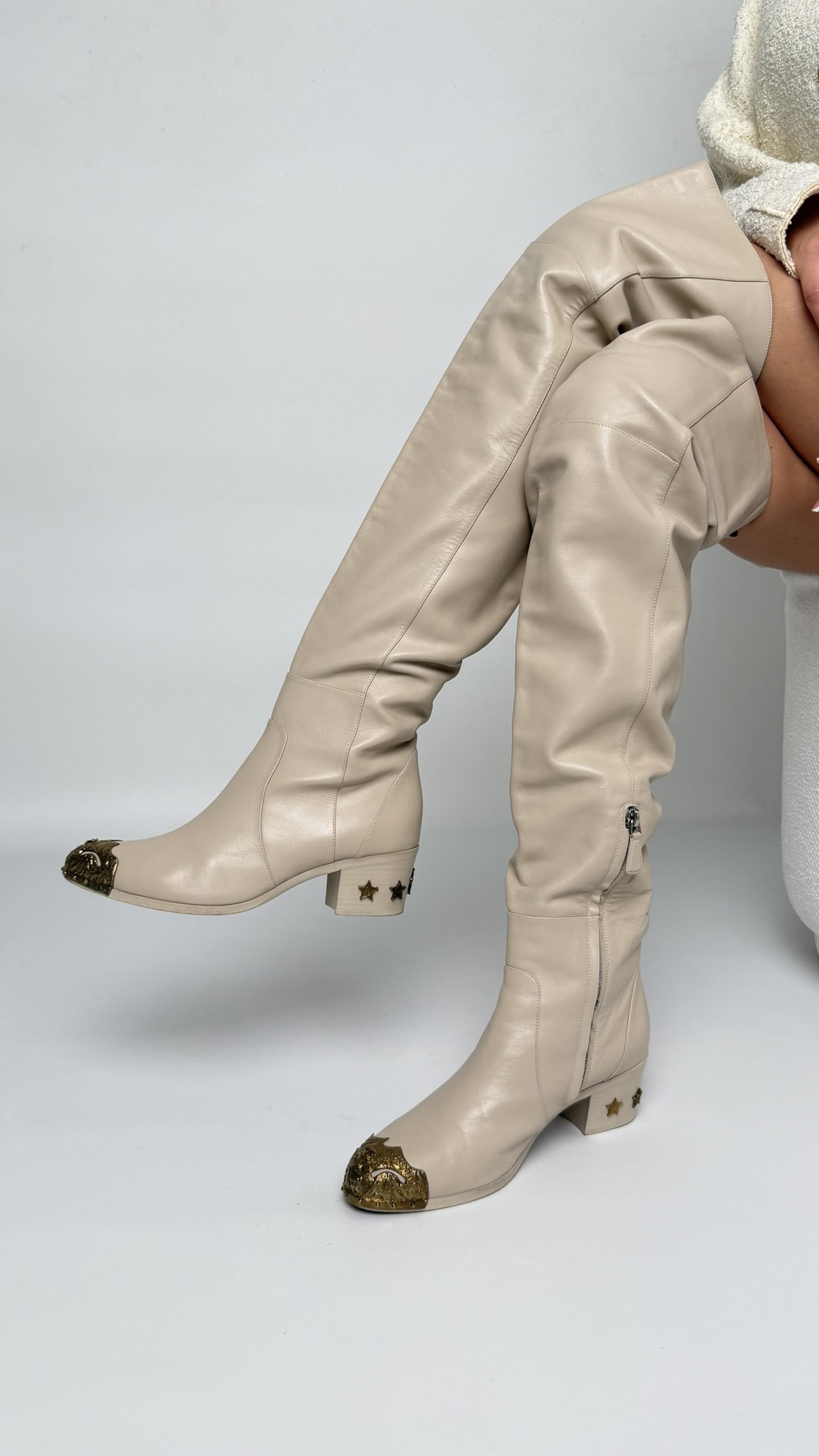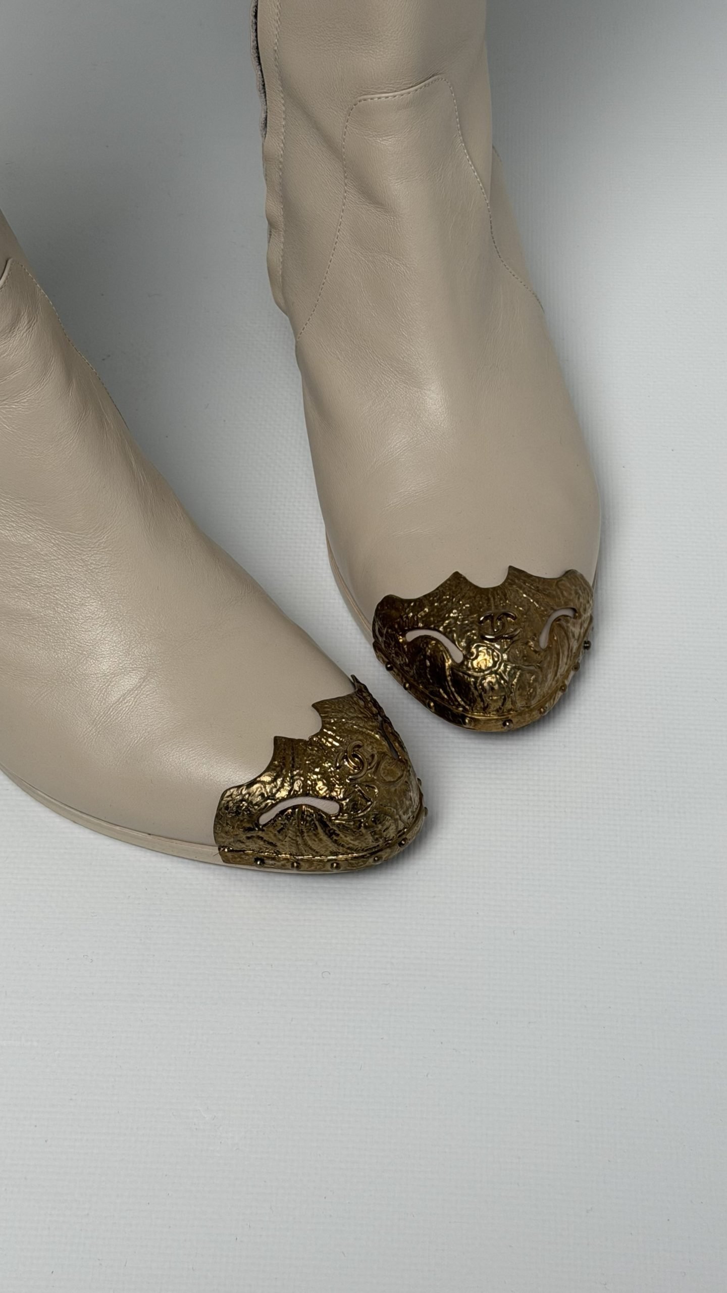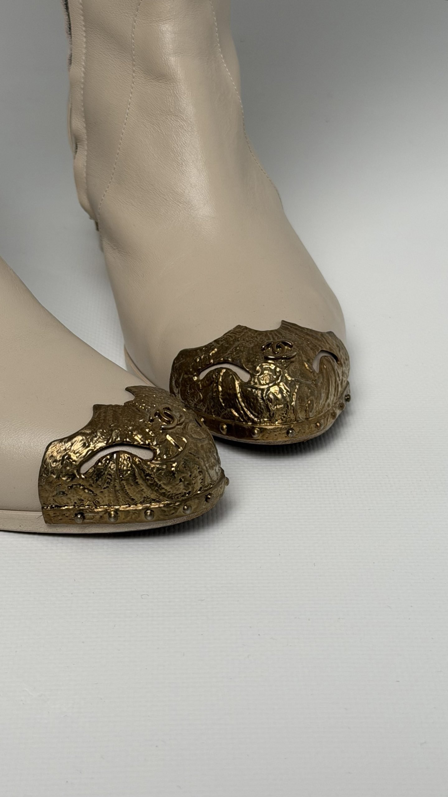 Ботфорди Chanel з м’якої бежевої шкіри, виконані в елегантному силуеті з загостреним носком. Металевий декор із золотистими елементами прикрашає мис і каблук, додаючи розкішного акценту