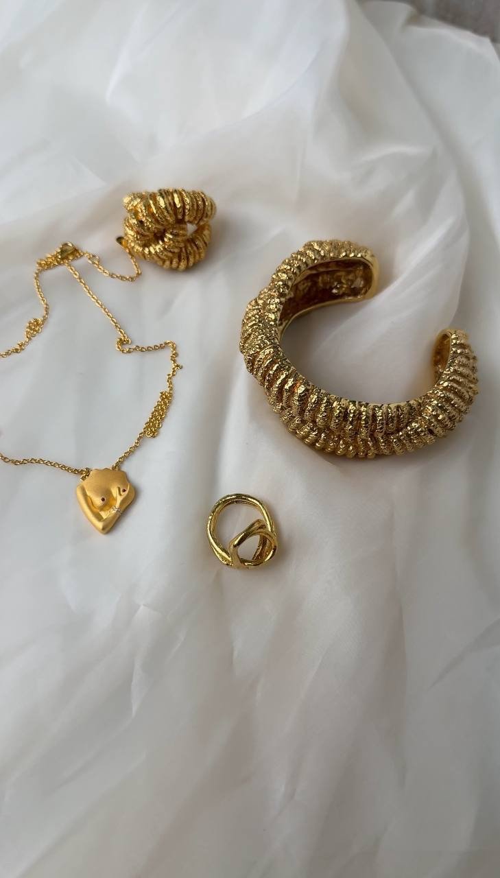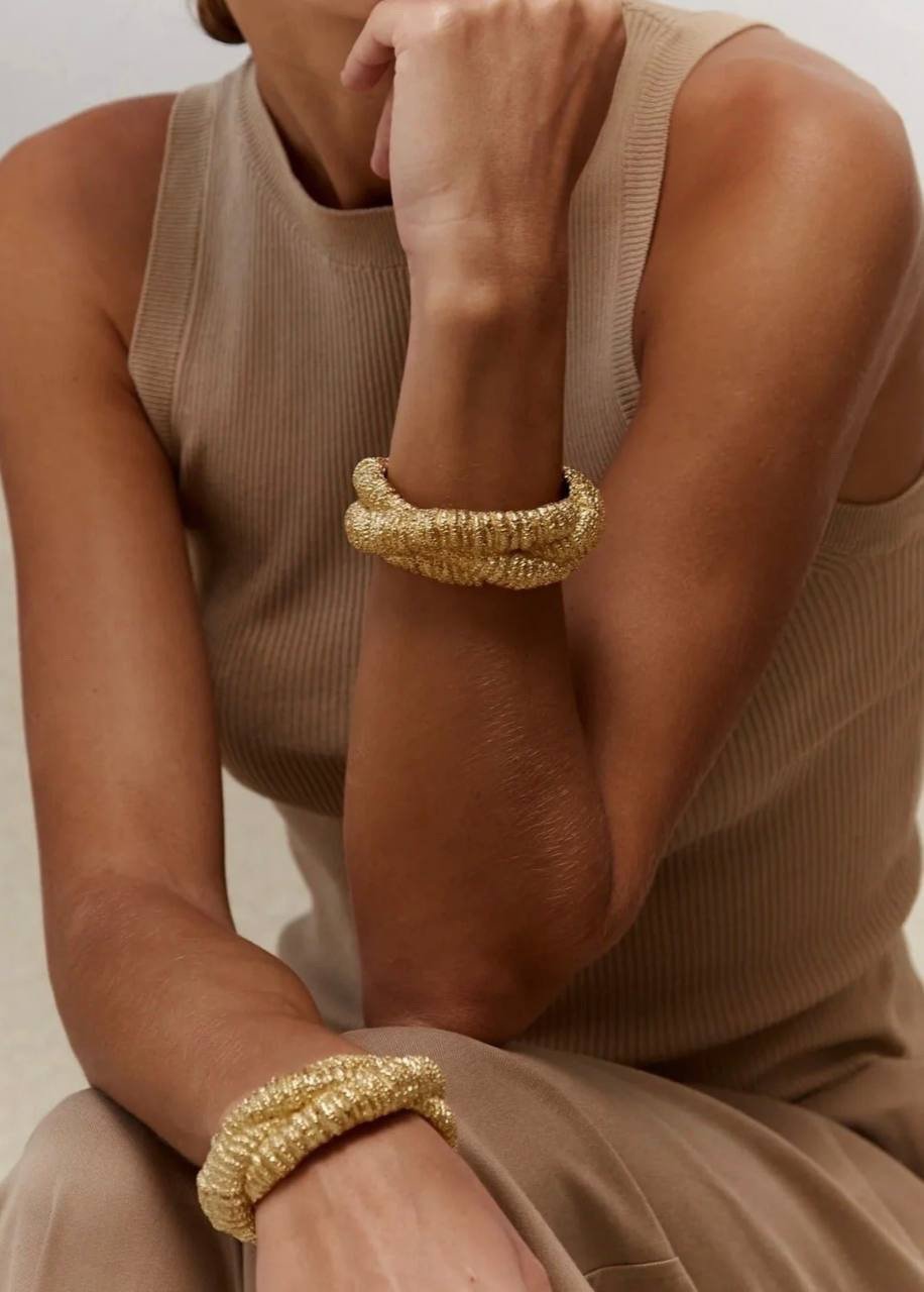 Масивний браслет з рельєфною поверхнею у золотистому металі