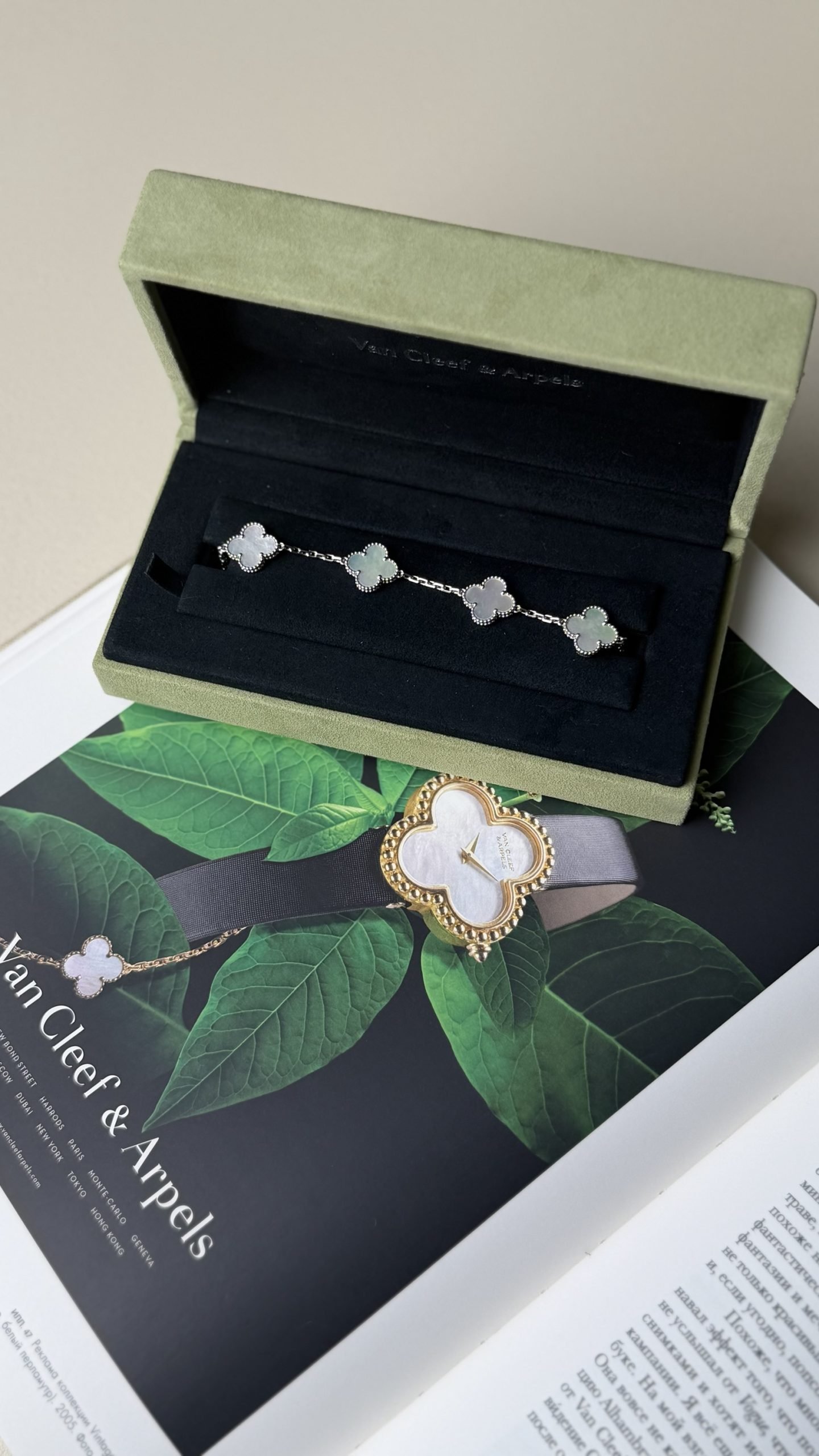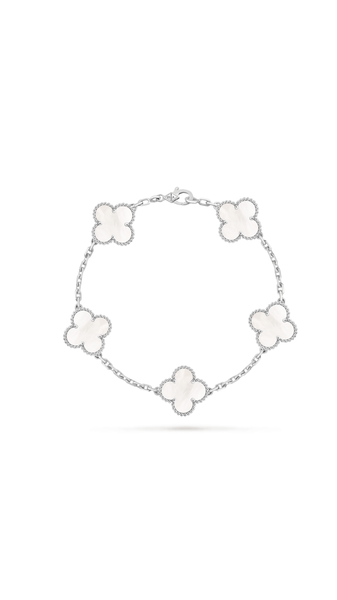 Легендарний браслет з культової колекції Alhambra — втілення удачі, гармонії та позачасової елегантності. Фірмові чотирилисті мотиви виконані з ніжного перламутру, який красиво переливається на світлі, та обрамлені знаковою зернистою окантовкою perlée — впізнаваним ювелірним кодом Дому Van Cleef & Arpels.