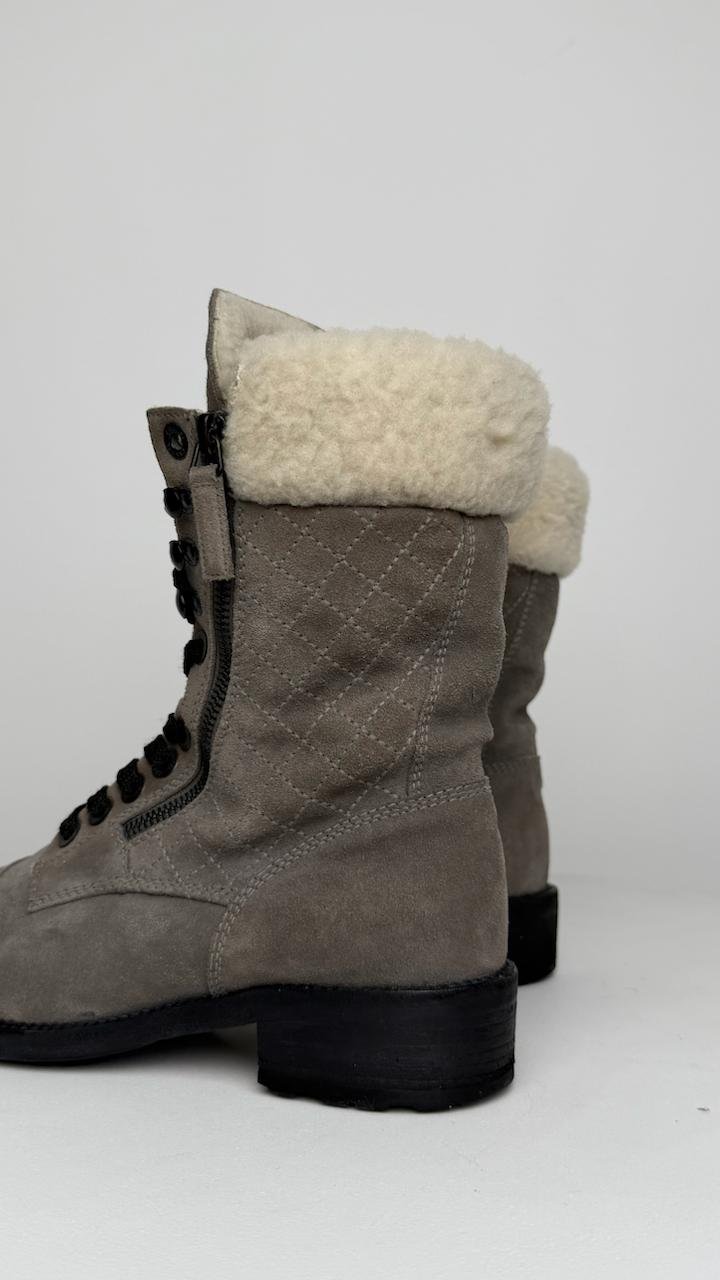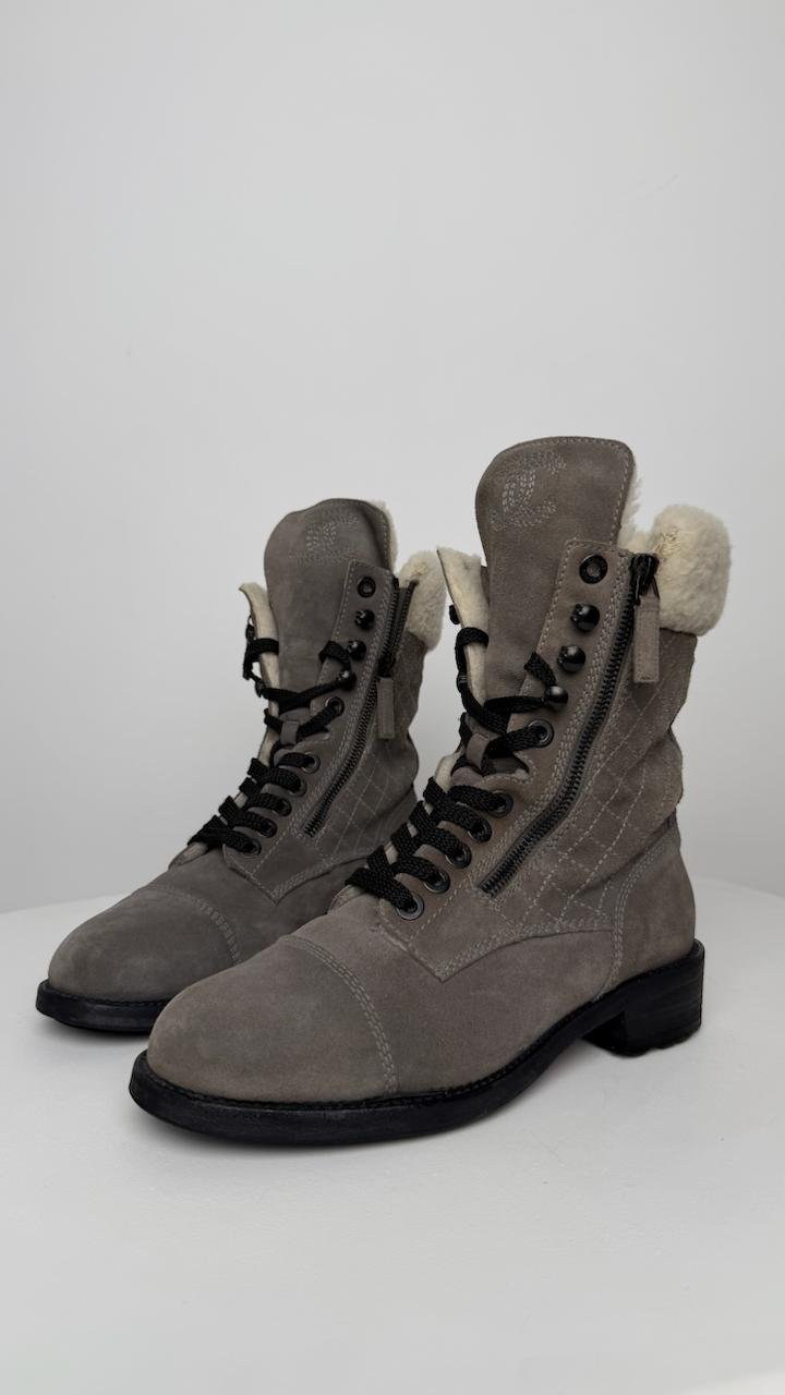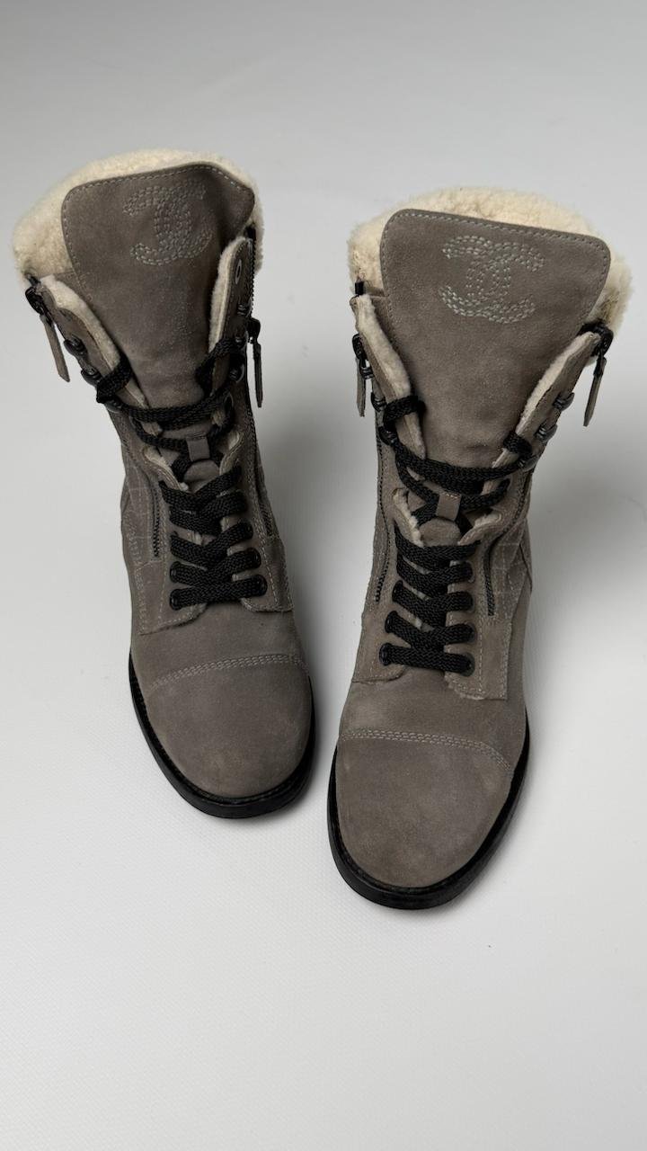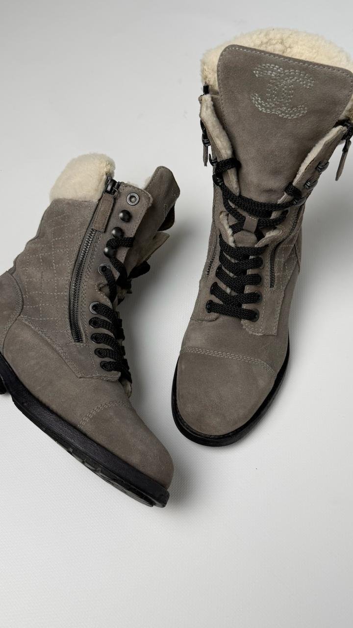 Зимові черевики Chanel із м’якої замші сірого кольору, утеплені натуральним хутром усередині. Мають зручну шнурівку, бокові блискавки та фірмовий логотип на язичку