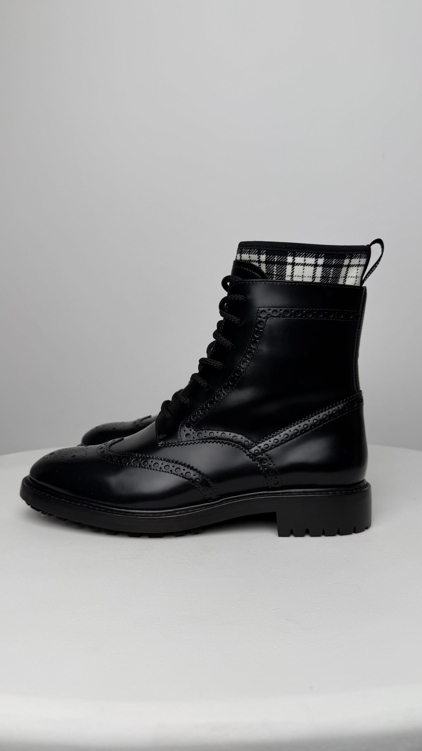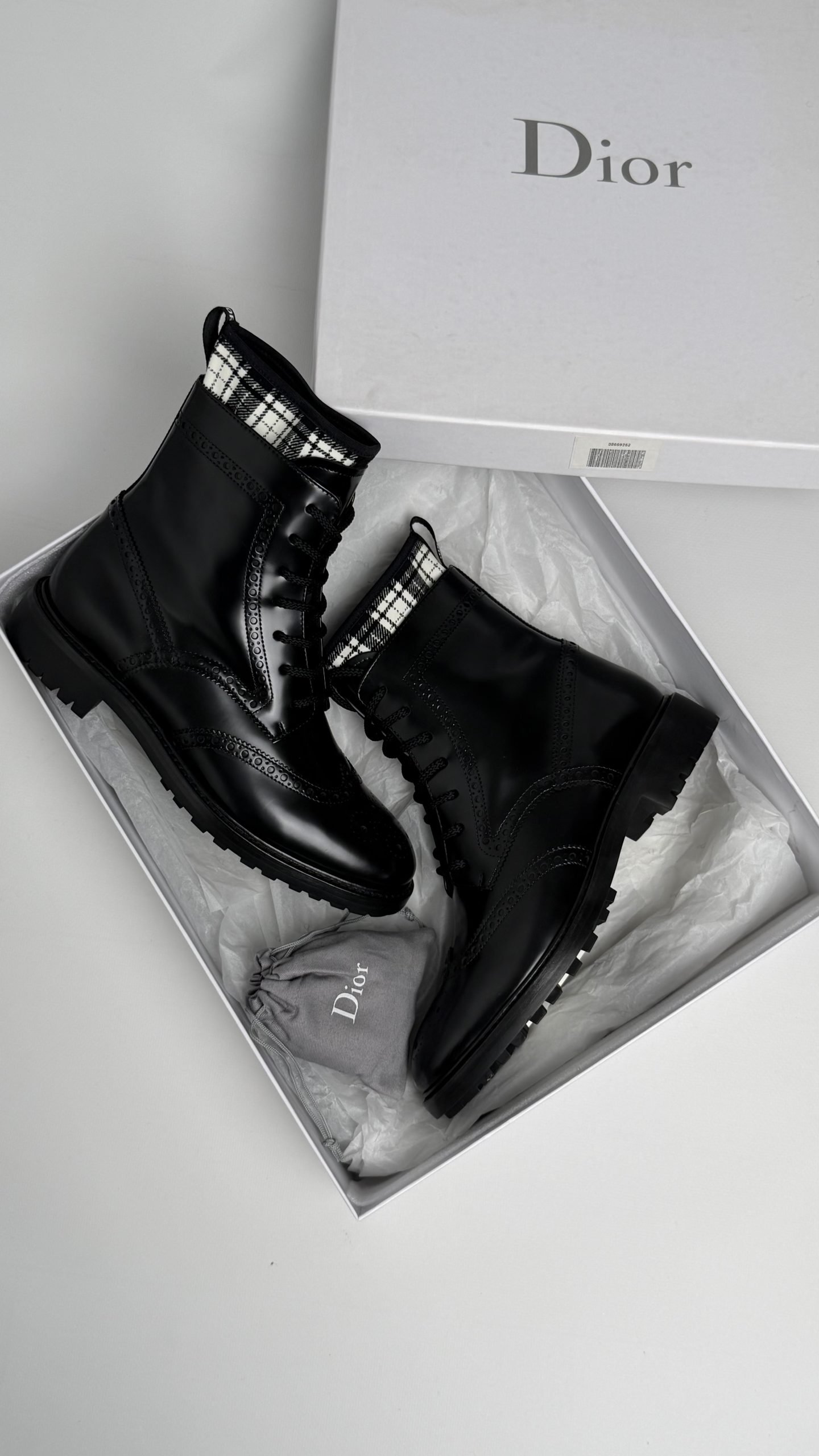 Чоботи Dior — елегантна інтерпретація класичних берців із гладкої чорної шкіри. Мають впізнавану вставку в клітинку на верхній частині халяви та фірмове тиснення бренду. Надійна підошва з протектором і бездоганна якість виконання поєднують комфорт, практичність і витончений стиль