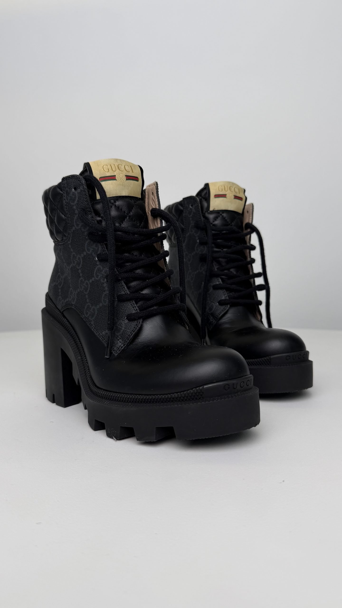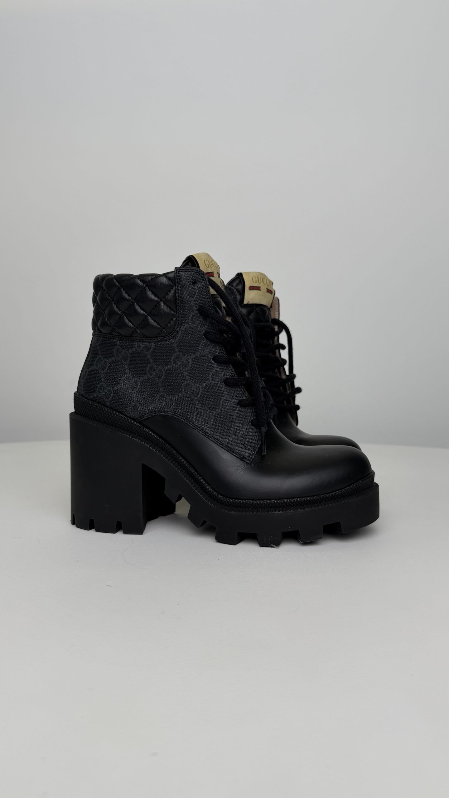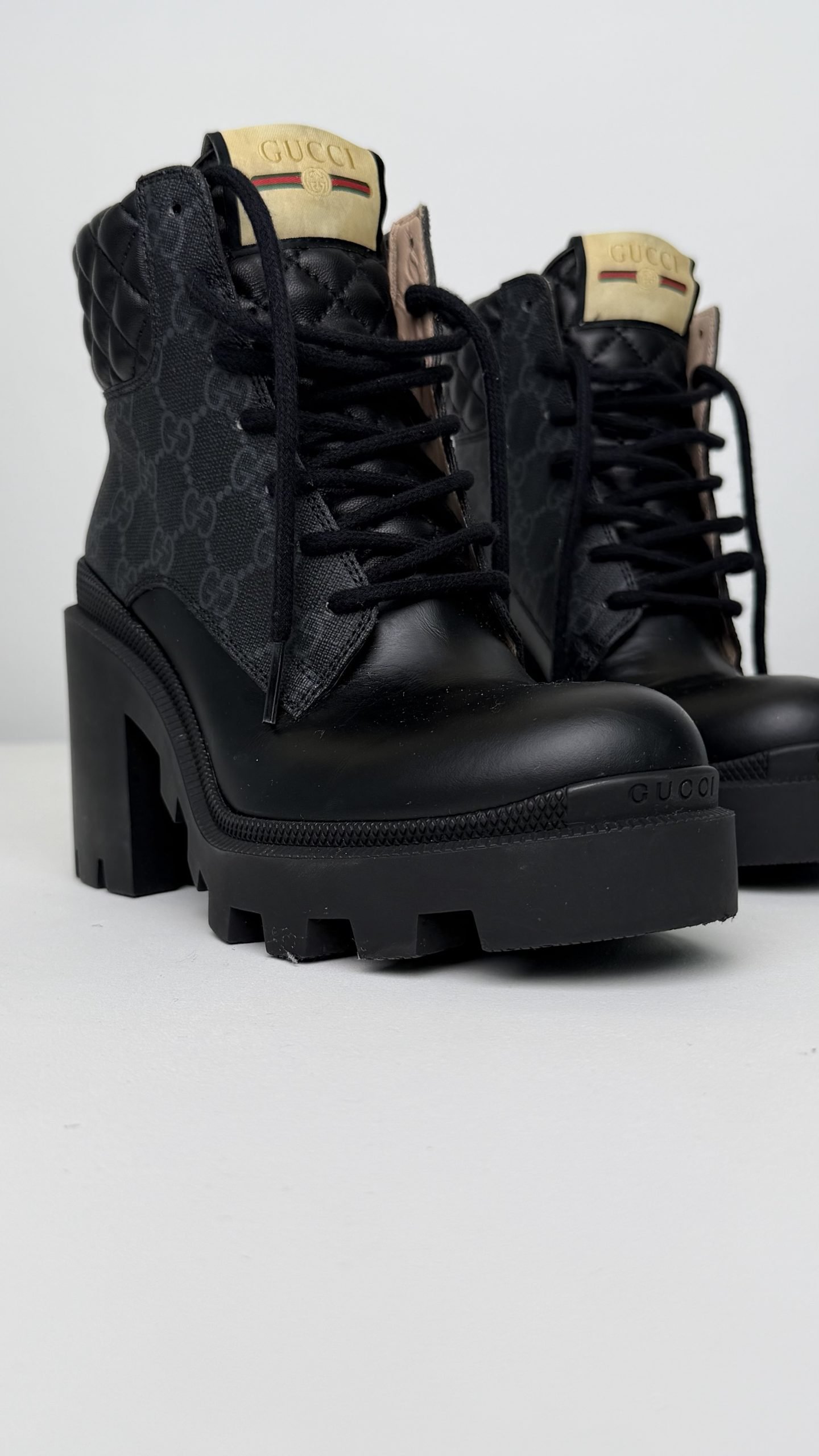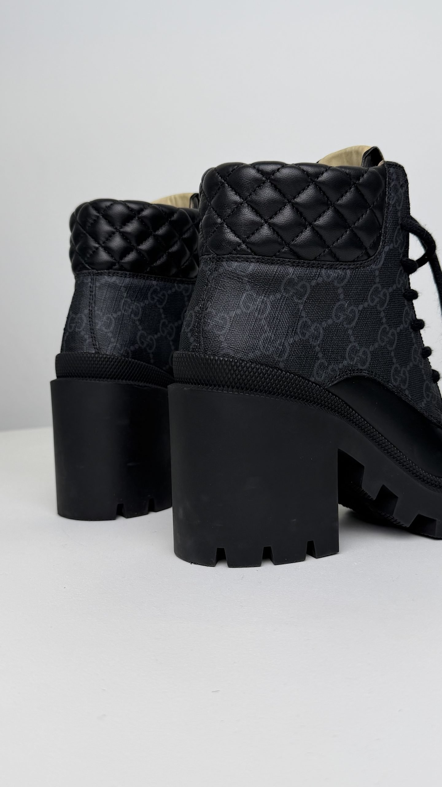 Чоботи Gucci на масивній тракторній підошві — поєднання монограмного канвасу GG із гладкою шкірою. Деталі: прошита вставка з логотипом на язичку, шнурівка, округлий носок, висока платформа та каблук блочного типу
