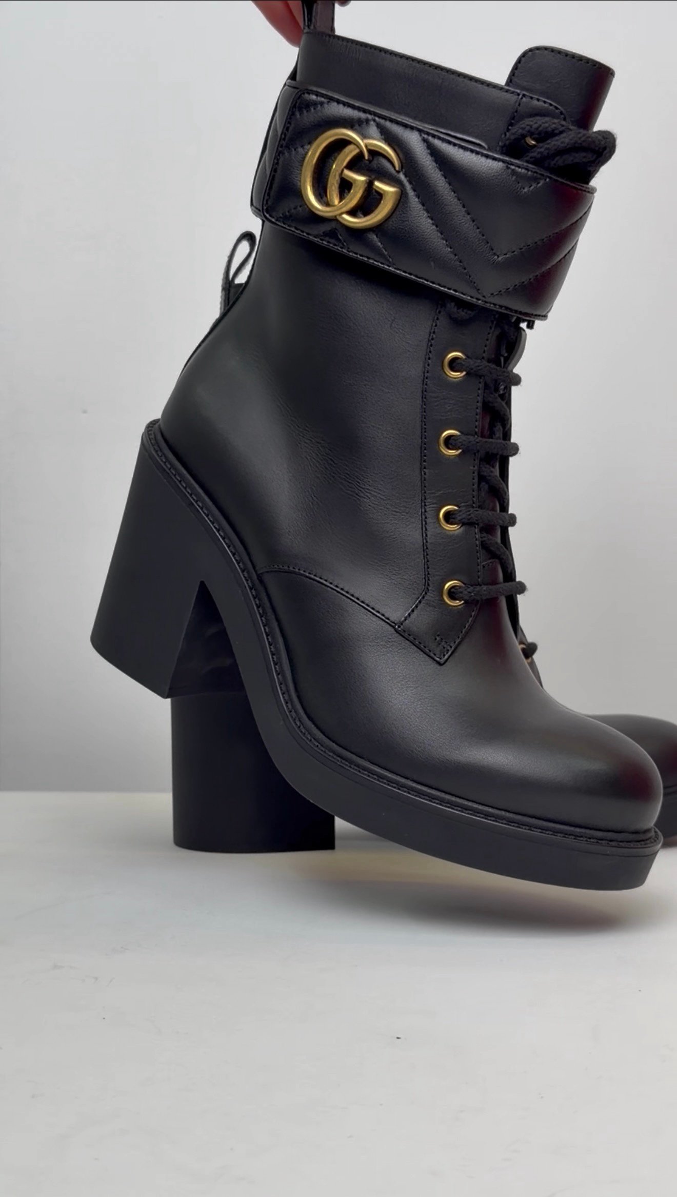 Чорні шкіряні ботильйони на масивному каблуку з шнурівкою та культовою пряжкою GG у вінтажному золоті. Декоративний ремінець із логотипом знімається, що дозволяє носити пару у двох стилях