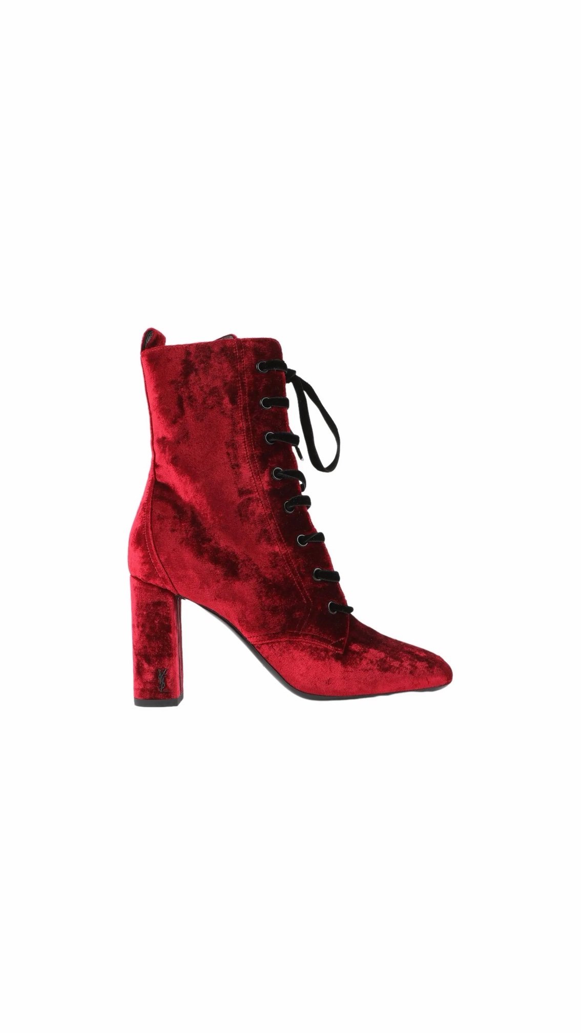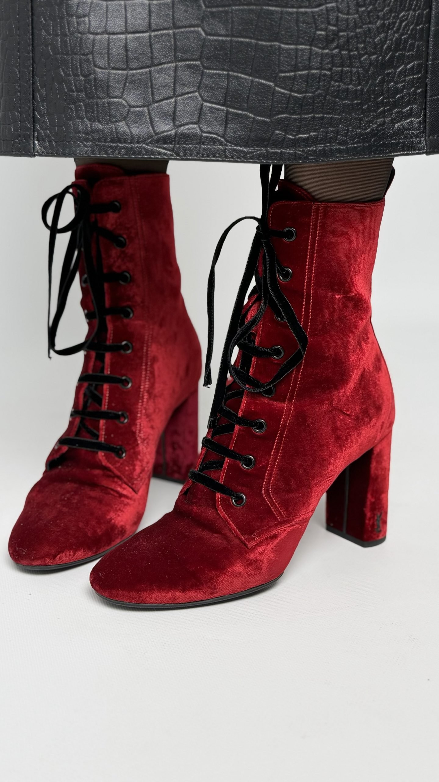 Чоботи Saint Laurent — ефектна модель з оксамиту у насиченому винному відтінку. Витончений силует із загостреним носком, шнурівка спереду та стійкий каблук створюють елегантний і водночас зухвалий образ. Ідеальний вибір для вечірніх виходів і акцентних fashion-луків у стилі YSL.