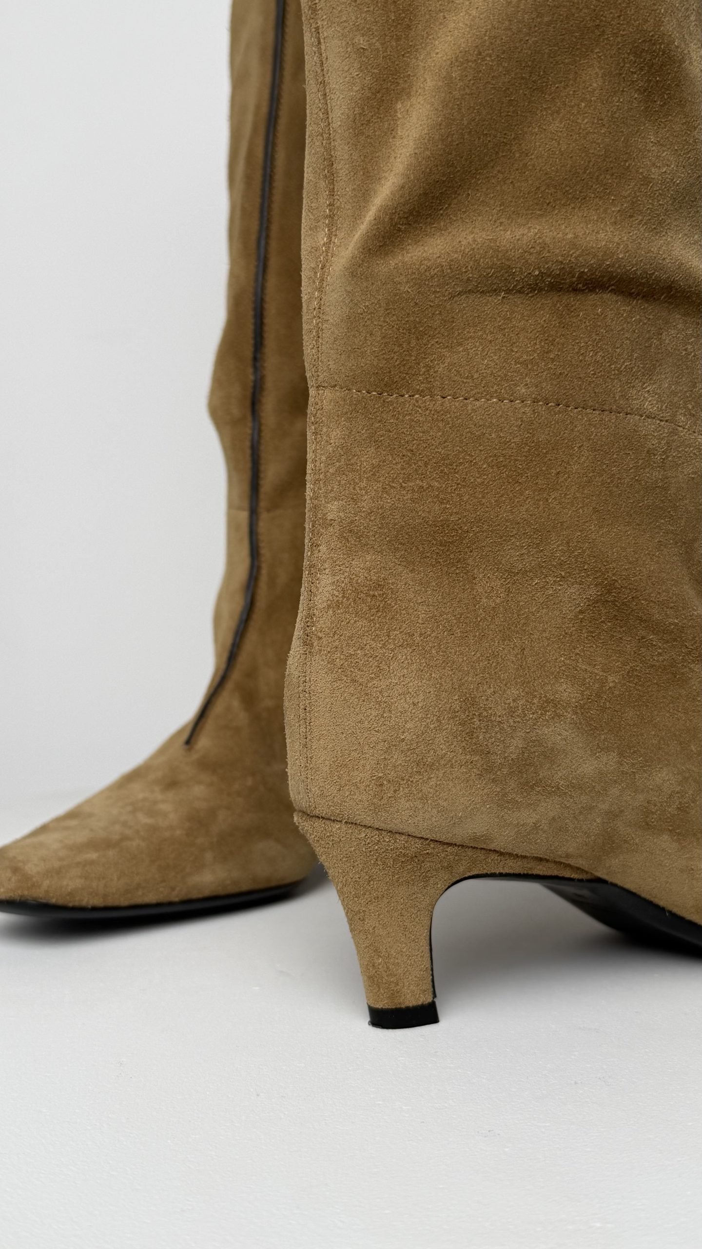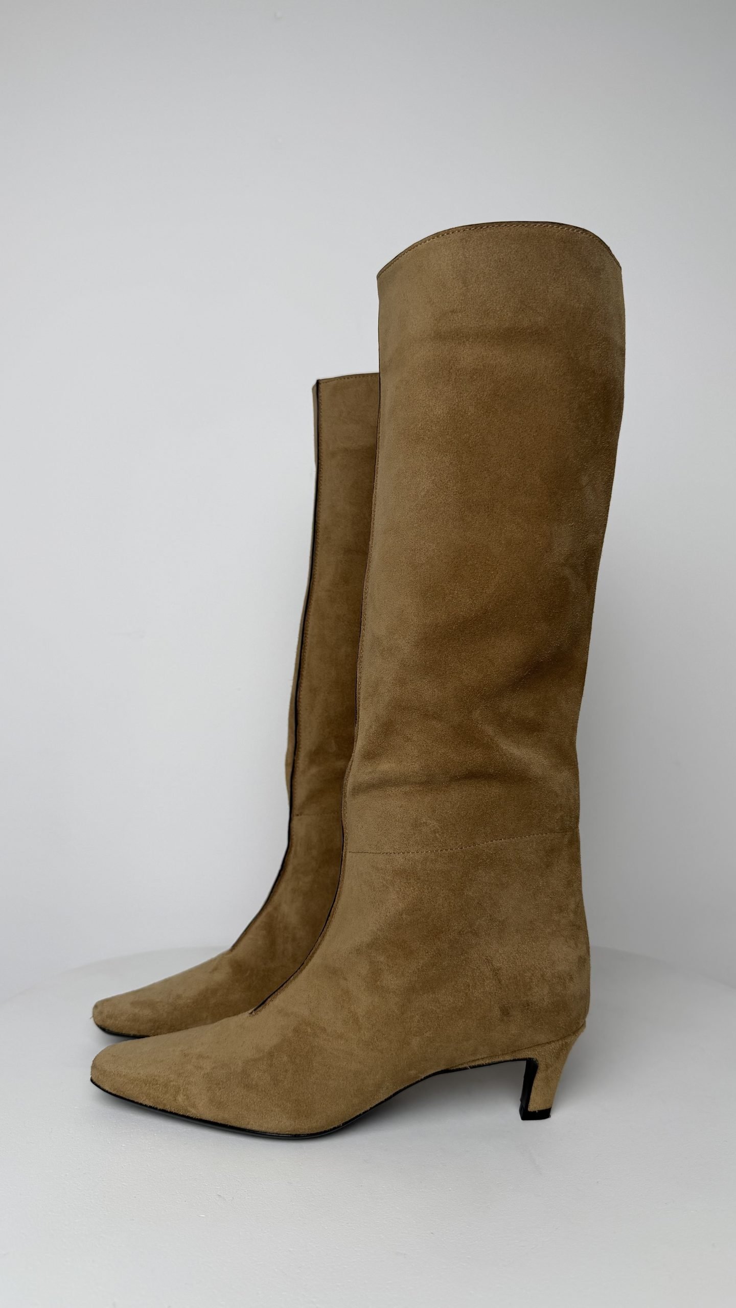 Вишукані високі чоботи з м’якої карамельної замші — подовшений носок, витончений вигин халяви та невисокий стійкий каблук-kitten heel. Модель виглядає надзвичайно делікатно й сексуально, візуально подовжує ніжку та додає образу французького шарму