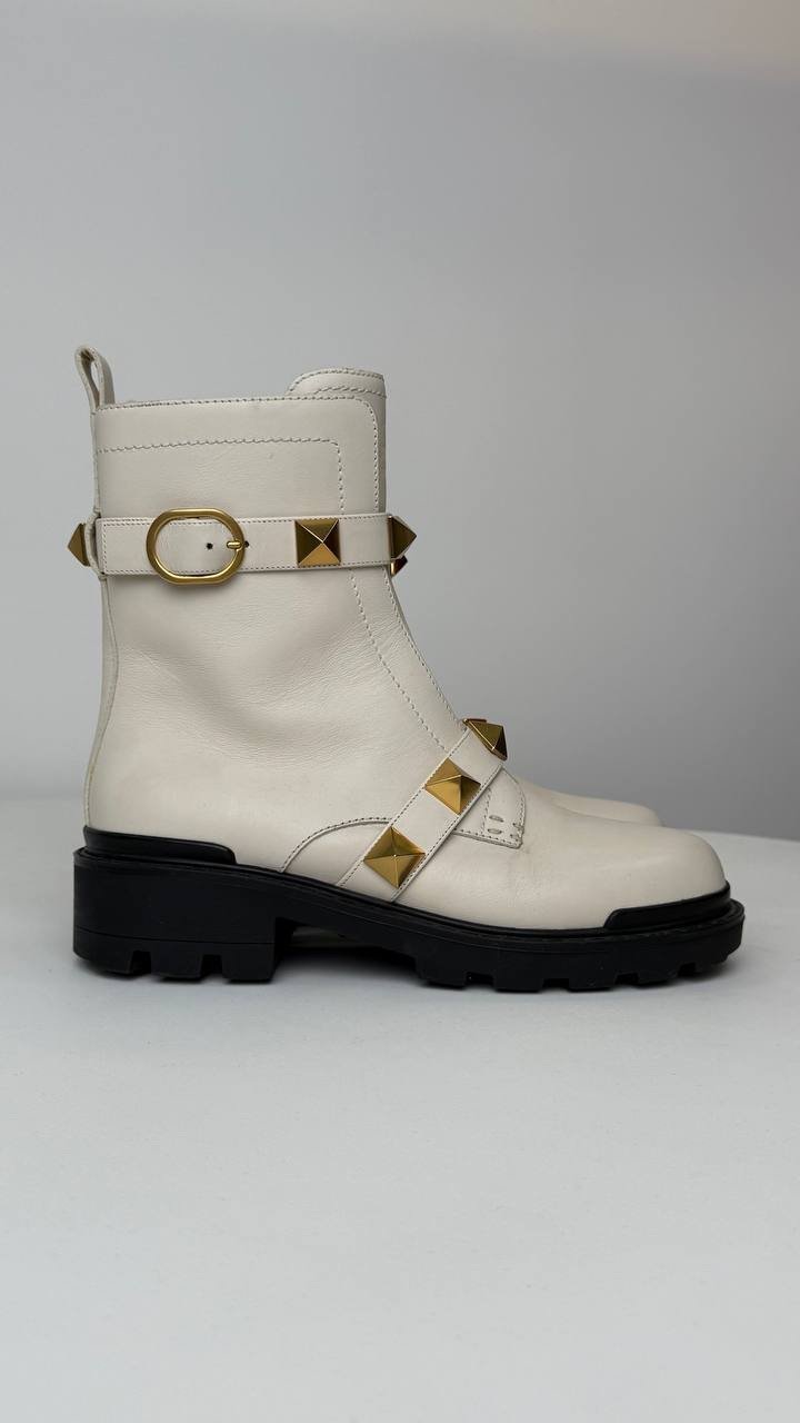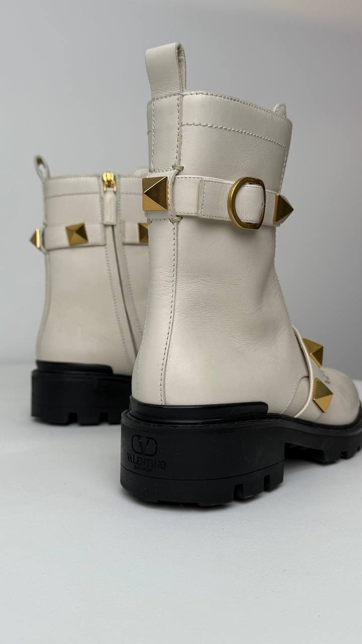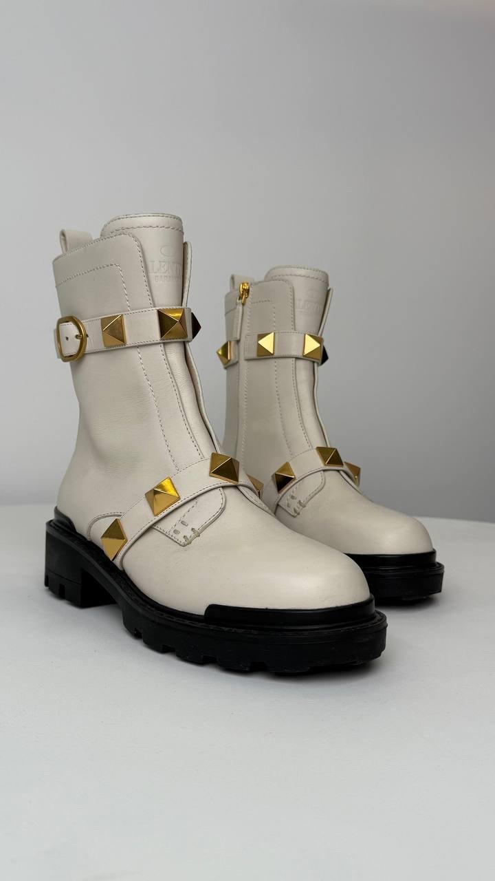 Білі черевики на масивній підошві. Виконані з гладкої шкіри, прикрашені культовими золотими пірамідальними шипами та ремінцями з пряжками