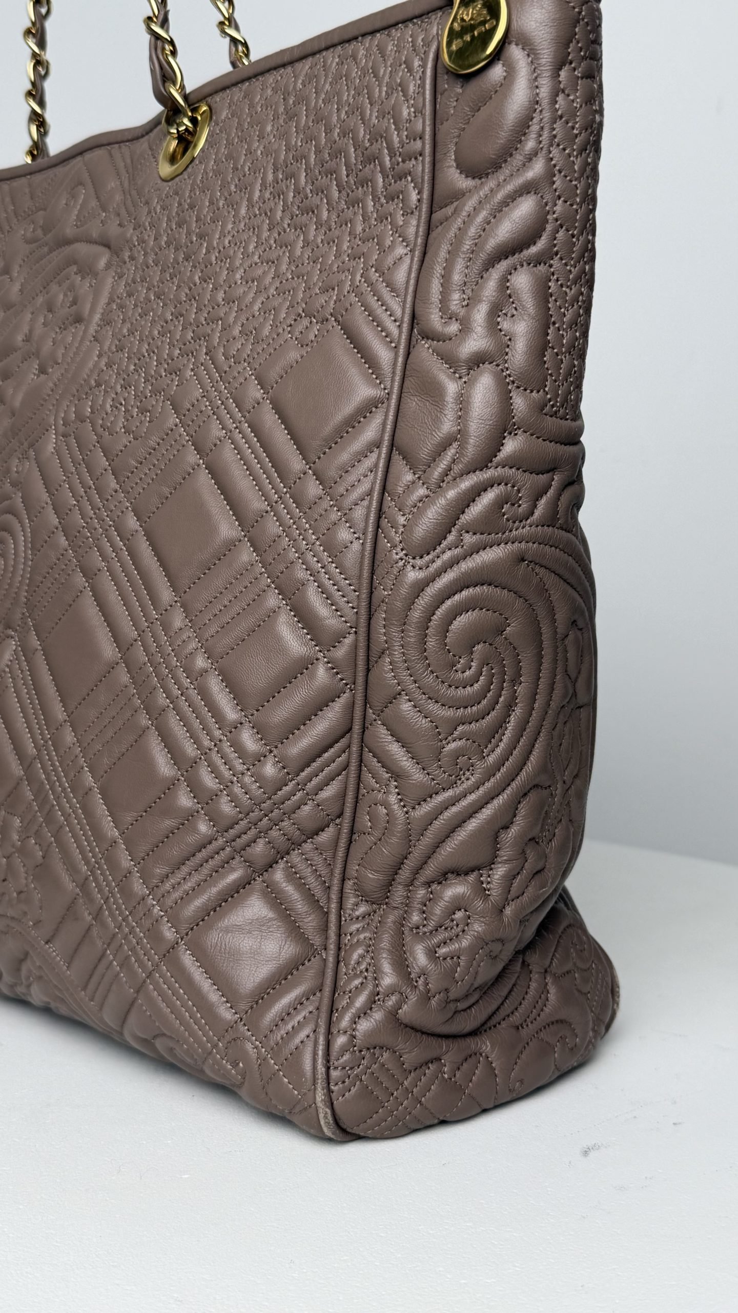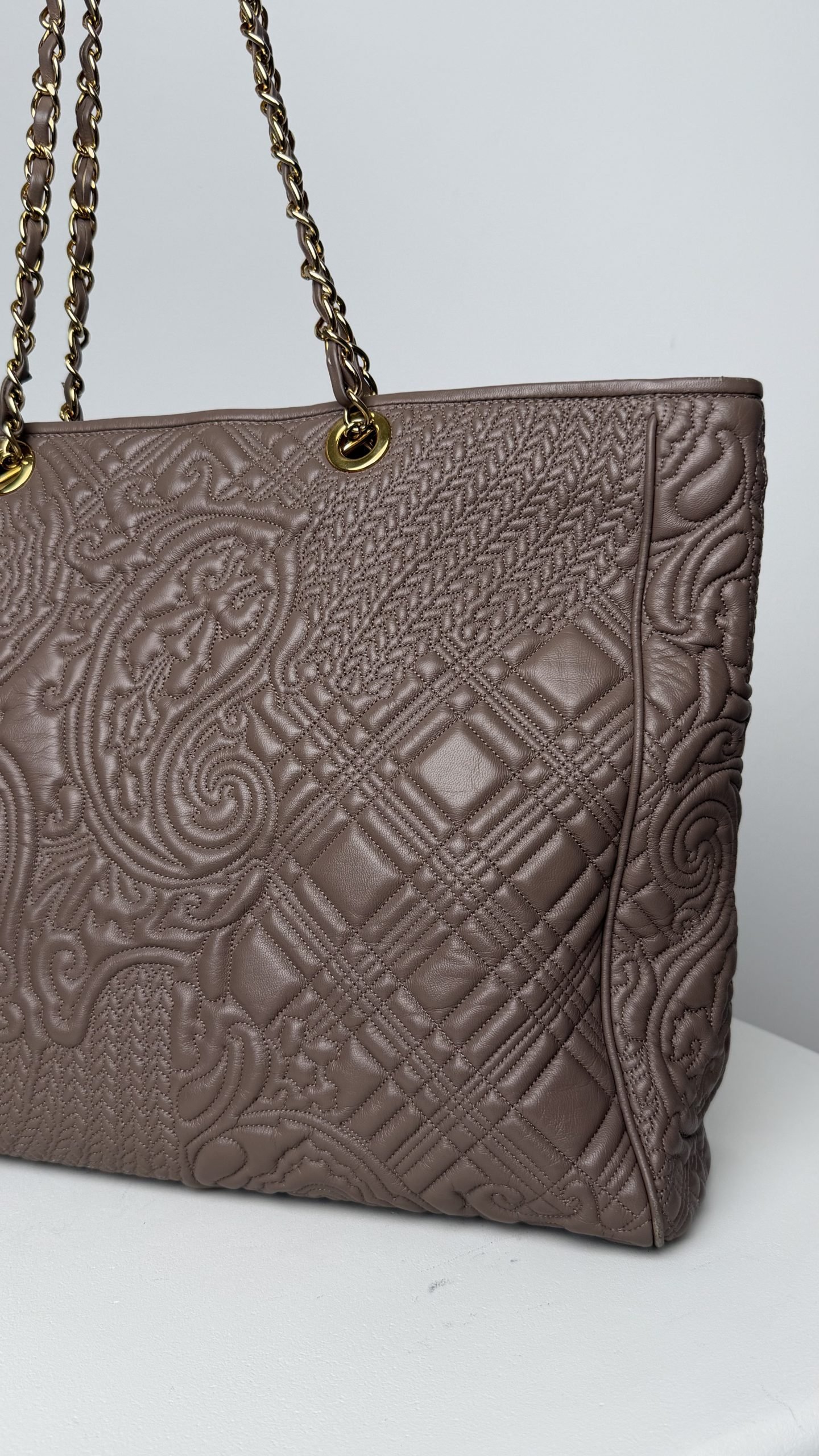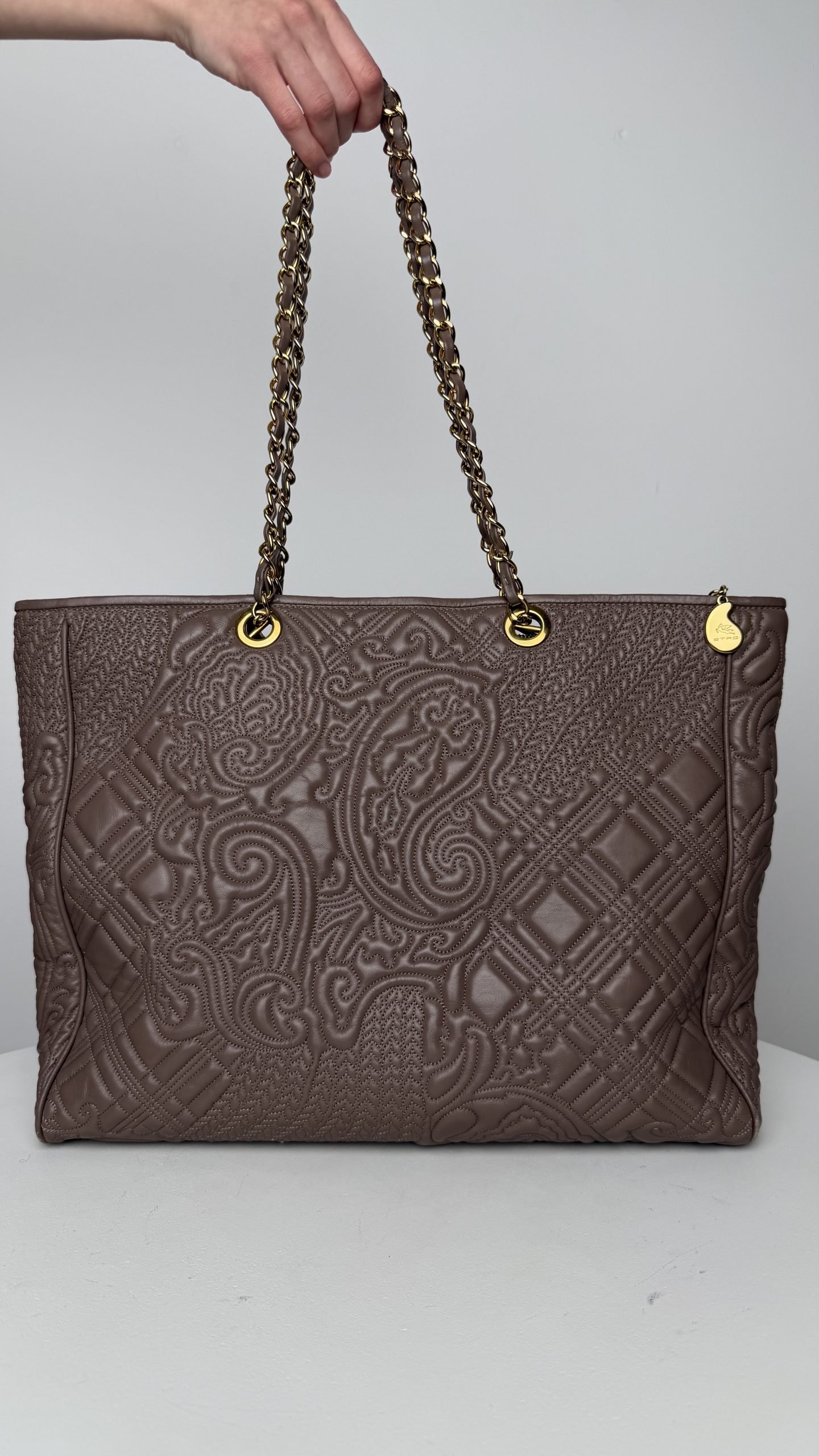 Стильна та впізнавана сумка Etro у великому форматі — це поєднання італійської майстерності та ефектної естетики бренду. Модель виконана з м’якої шкіри кольору мокко з розкішним об’ємним тисненням у фірмовому paisley та барокових мотивах — те, за що Etro так цінують у світі. Золотистий ланцюг додає благородного блиску та дозволяє комфортно носити сумку на плечі. Завдяки своєму місткому формату вона ідеальна для щоденного використання: легко вміщує ноутбук, документи та всі ваші must-have речі