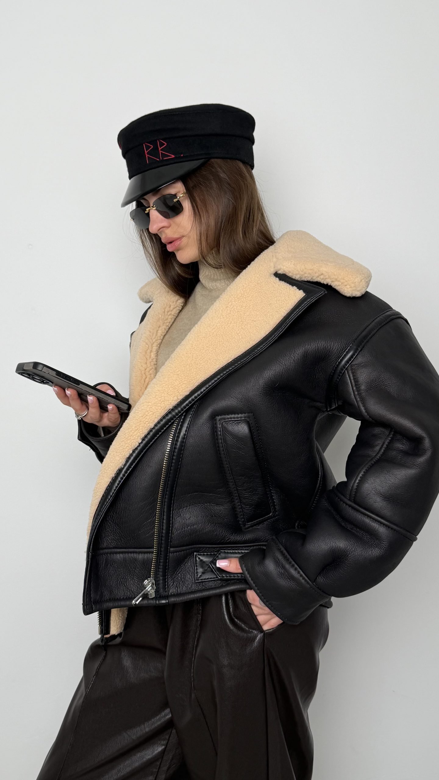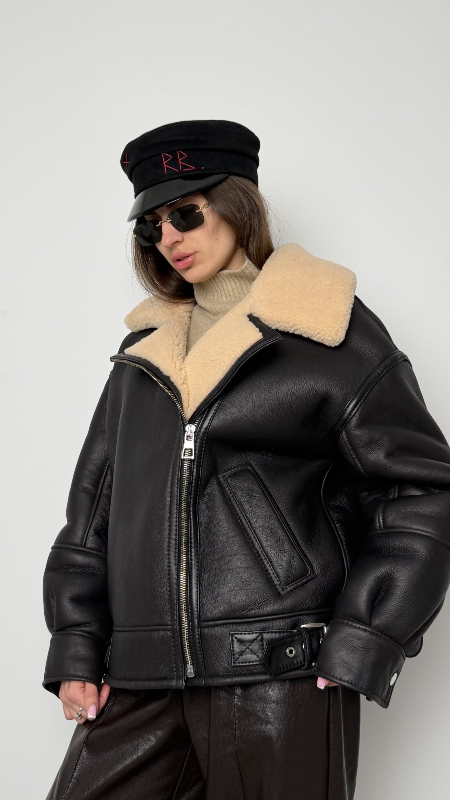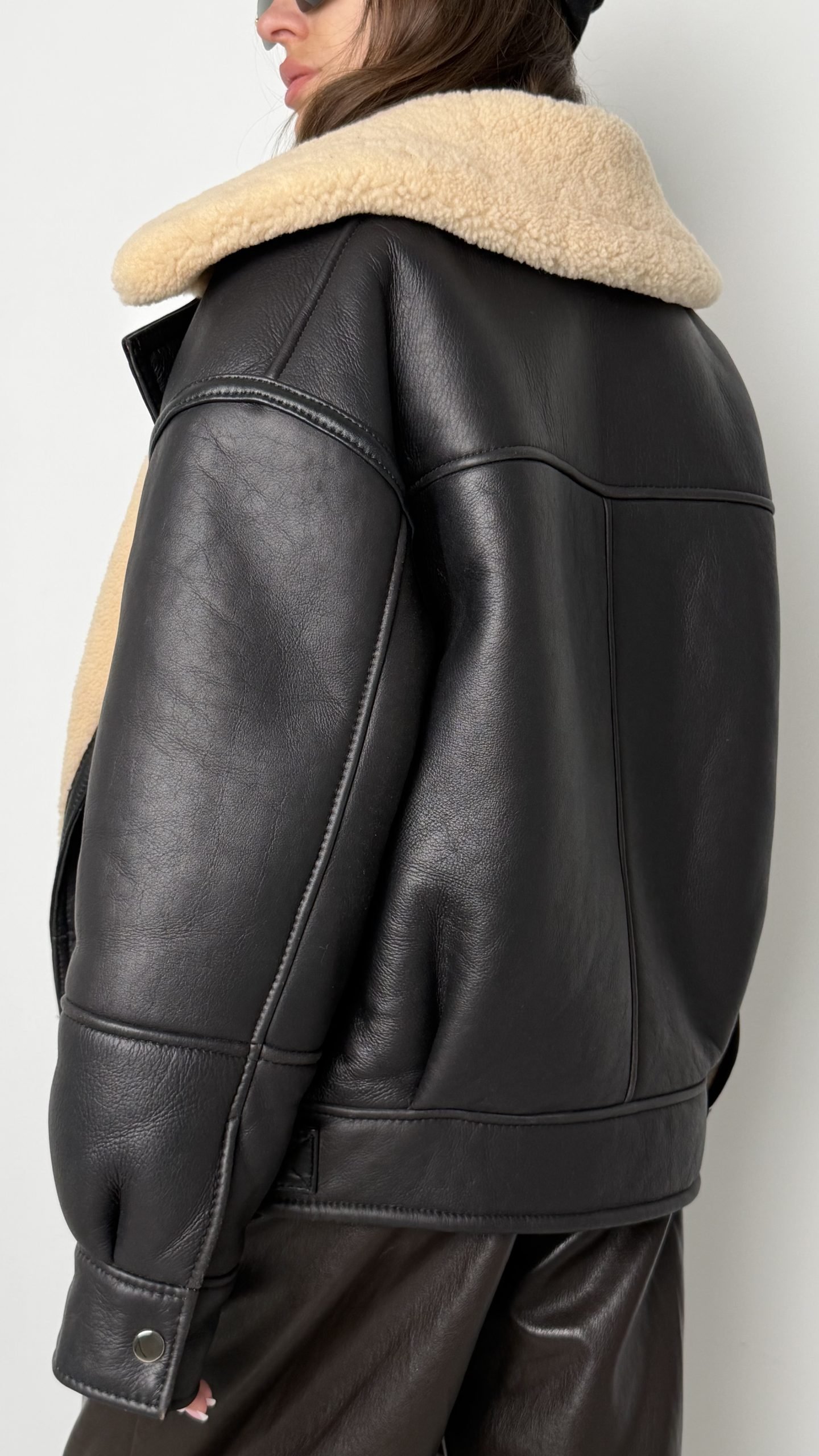 Розкішна дублянка від Got’s Label, створена у стильному форм-факторі oversize, але при цьому акуратно сідає на розмір S/M. Модель виконана з щільної натуральної шкіри з фактурною поверхнею й утеплена м’яким бежевим шерпом, який додає образу затишності та шику
