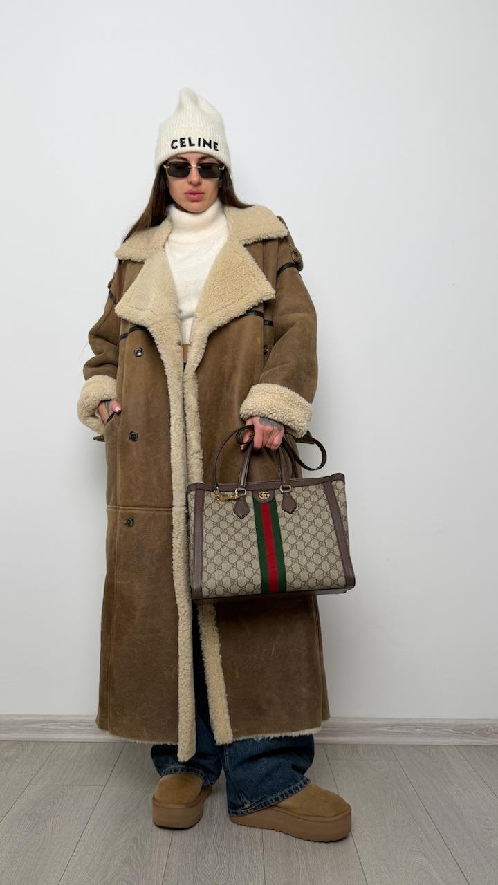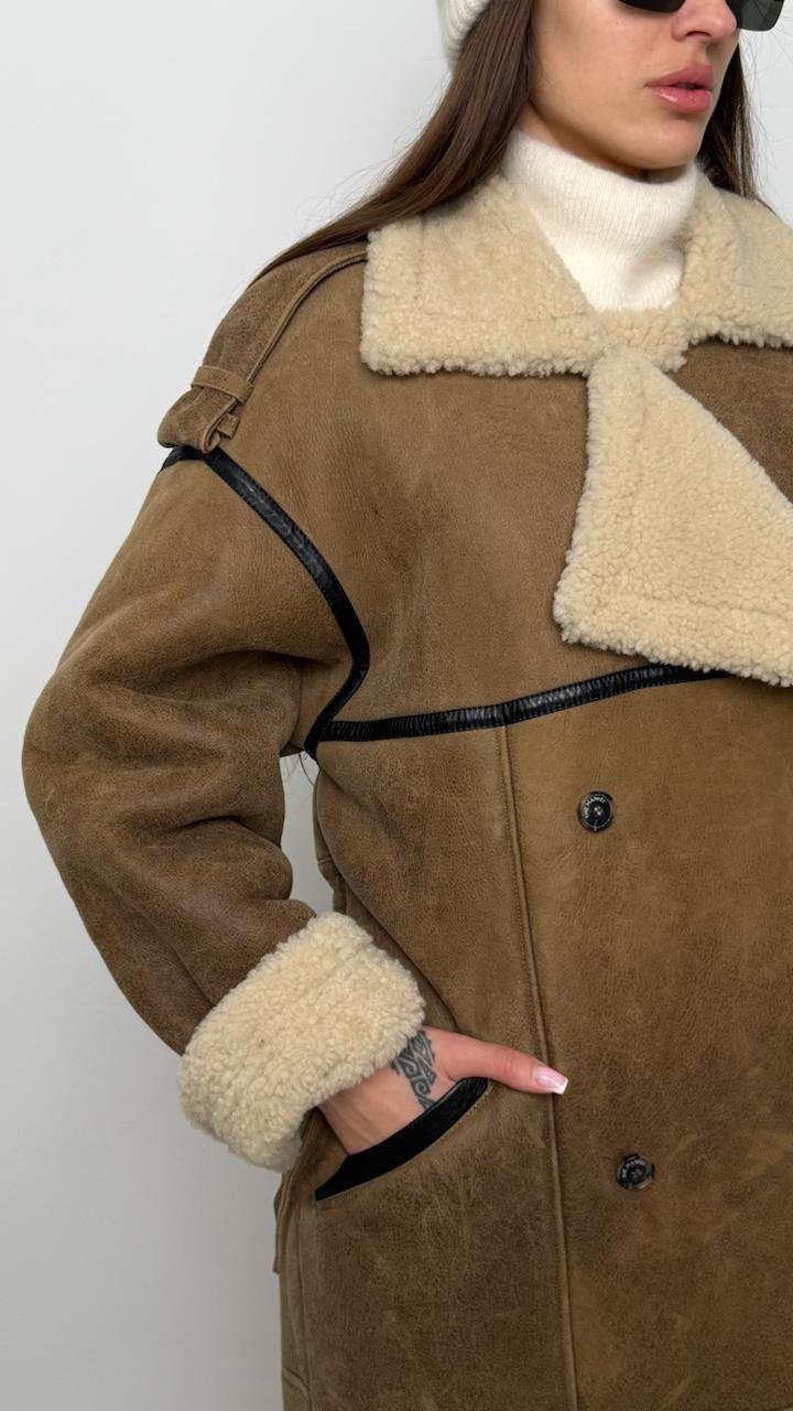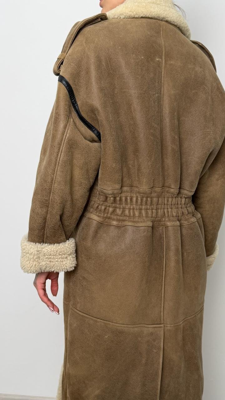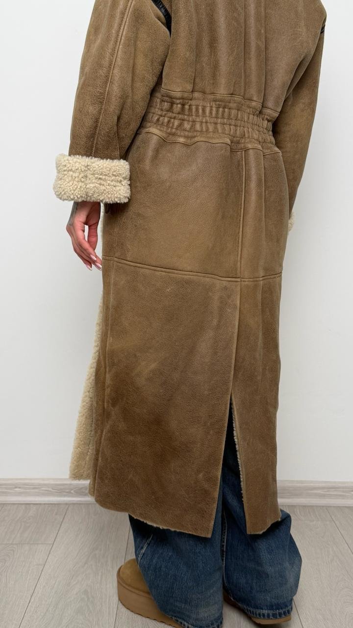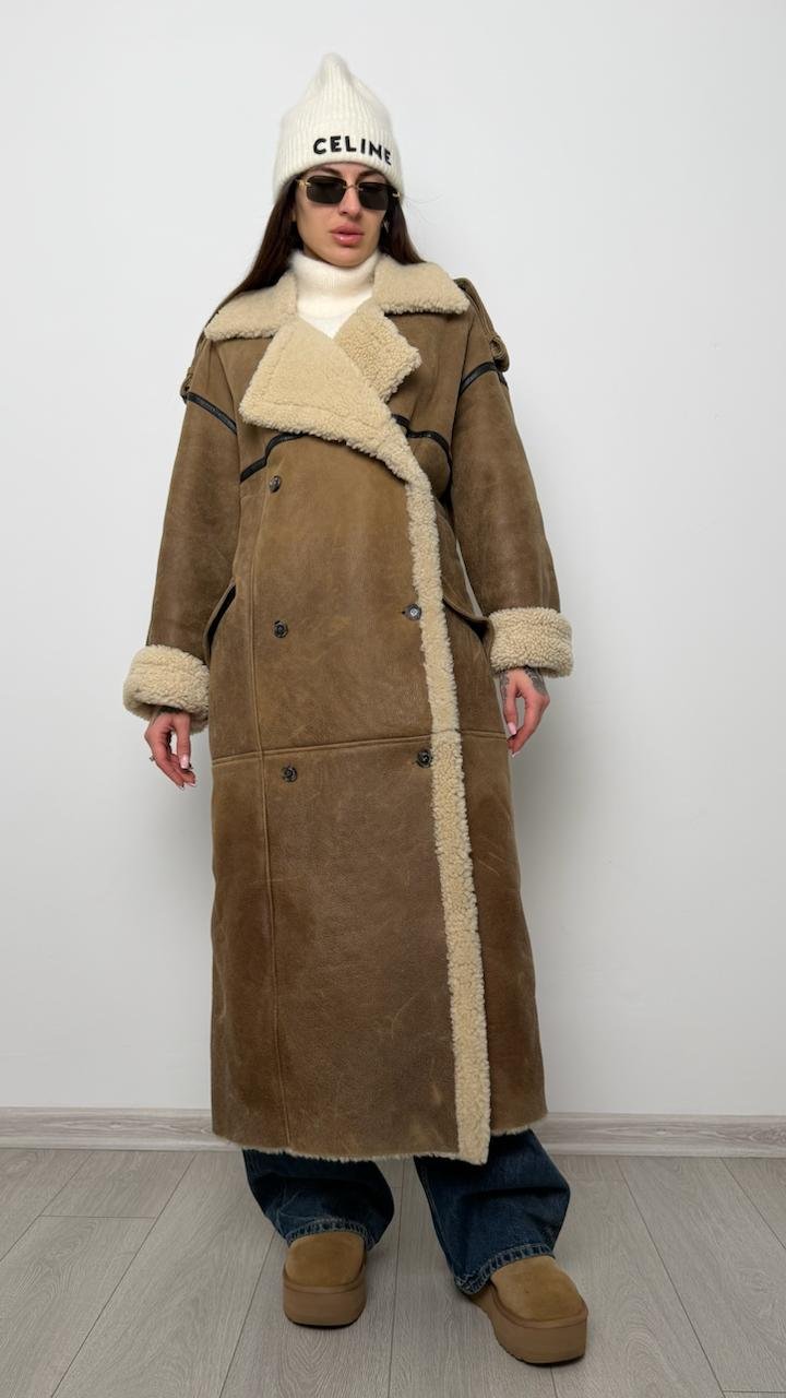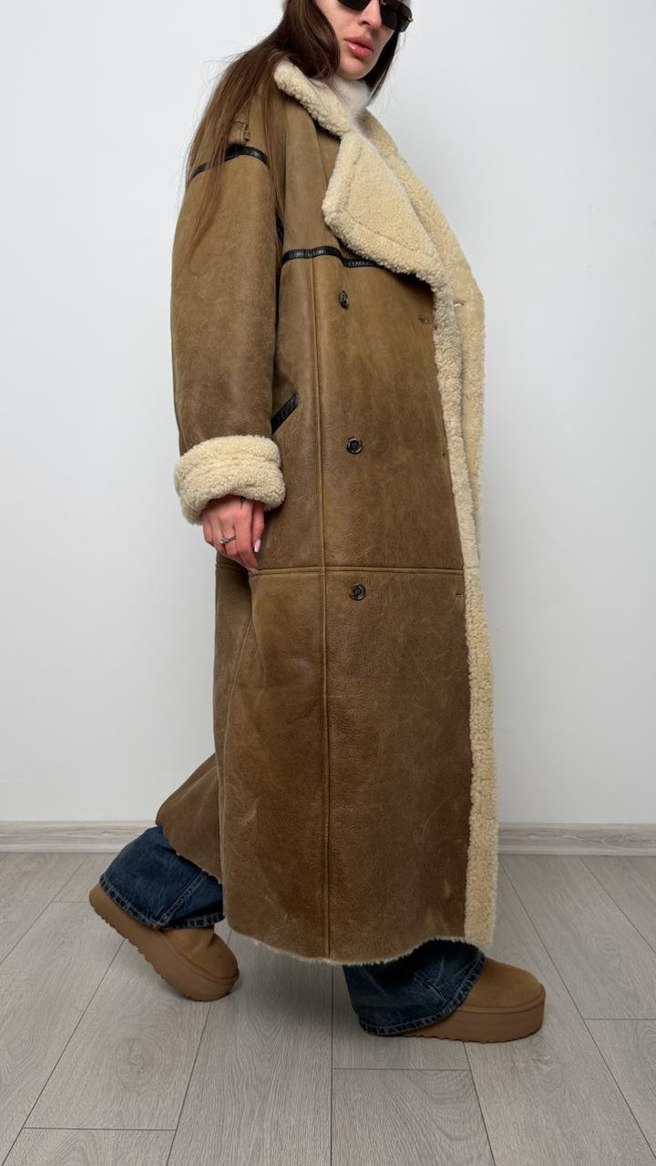 Розкішна довга дублянка The Mannei, виконана з натуральної овчини преміум якості. Модель має ідеальний oversize-силует, теплий шерстяний внутрішній шар та контрастні шкіряні вставки, що додають структури. Високий комір, манжети та довжина роблять її незамінною у холодний сезон