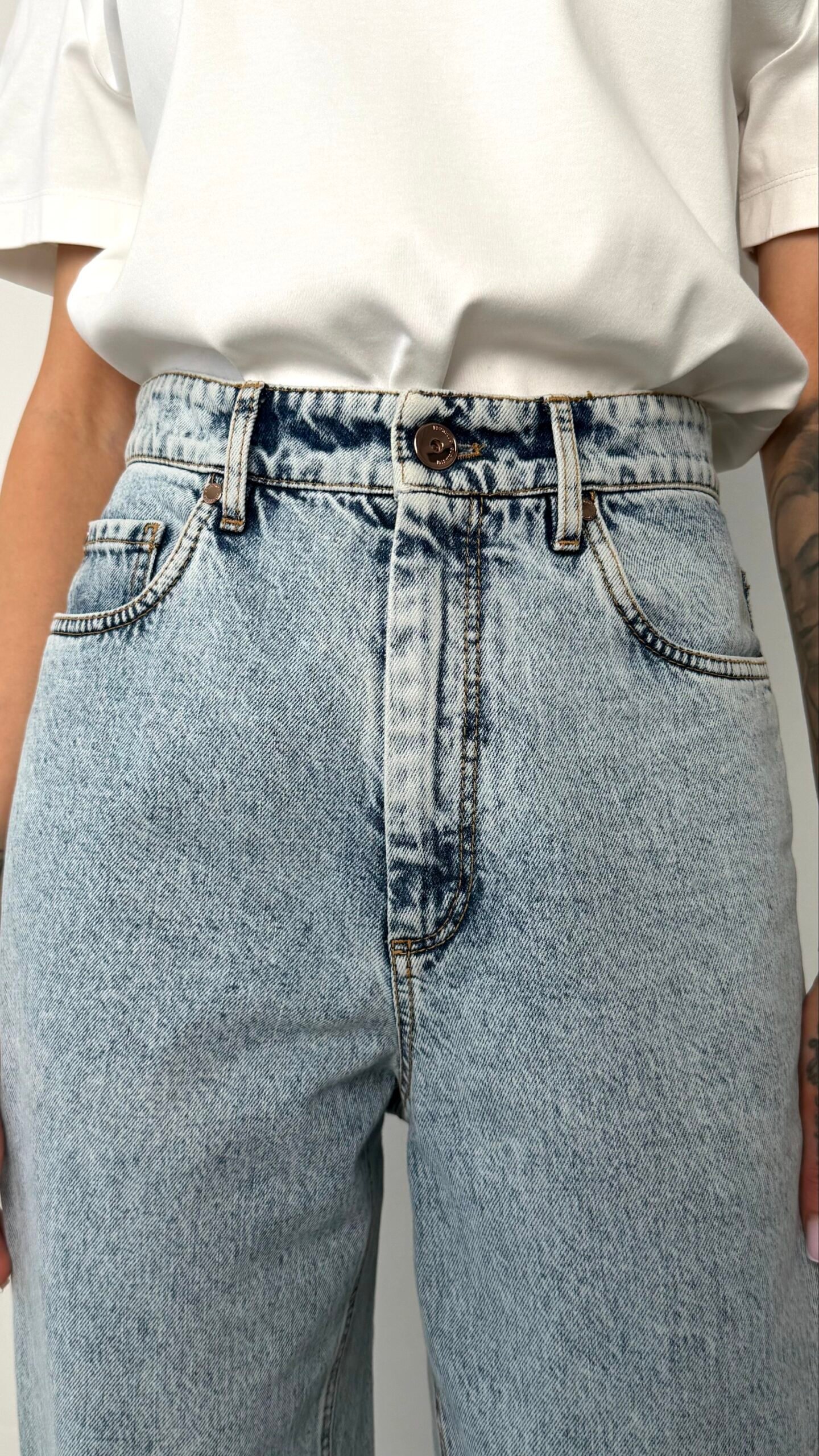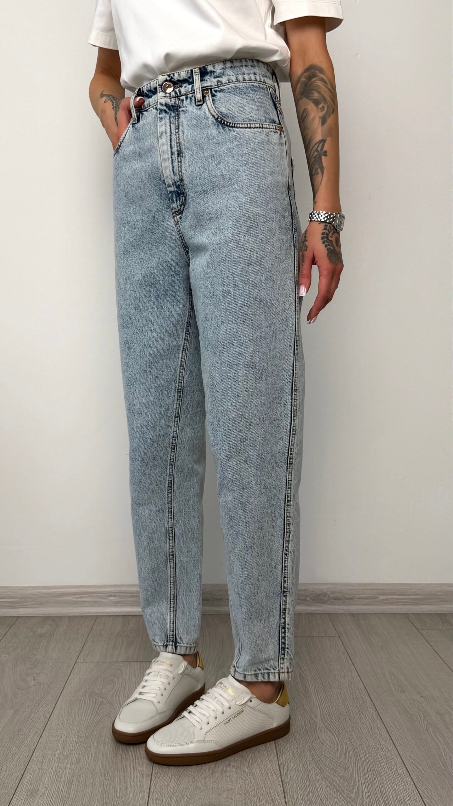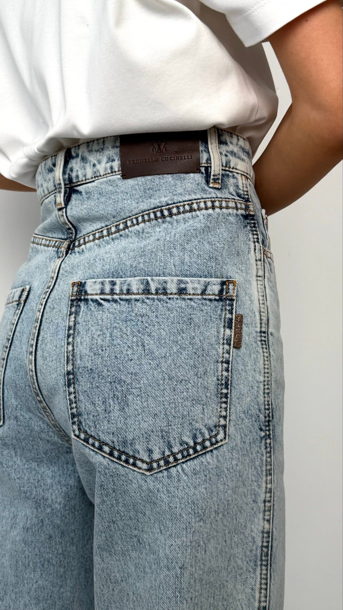 Ця модель від італійського дому моди Brunello Cucinelli — ідеальне поєднання розслабленого стилю 90-х та бездоганної якості виконання. Джинси мають характерний силует mom-fit: високу посадку, яка акцентує талію, та злегка вільний крій у стегнах, що звужується до низу.