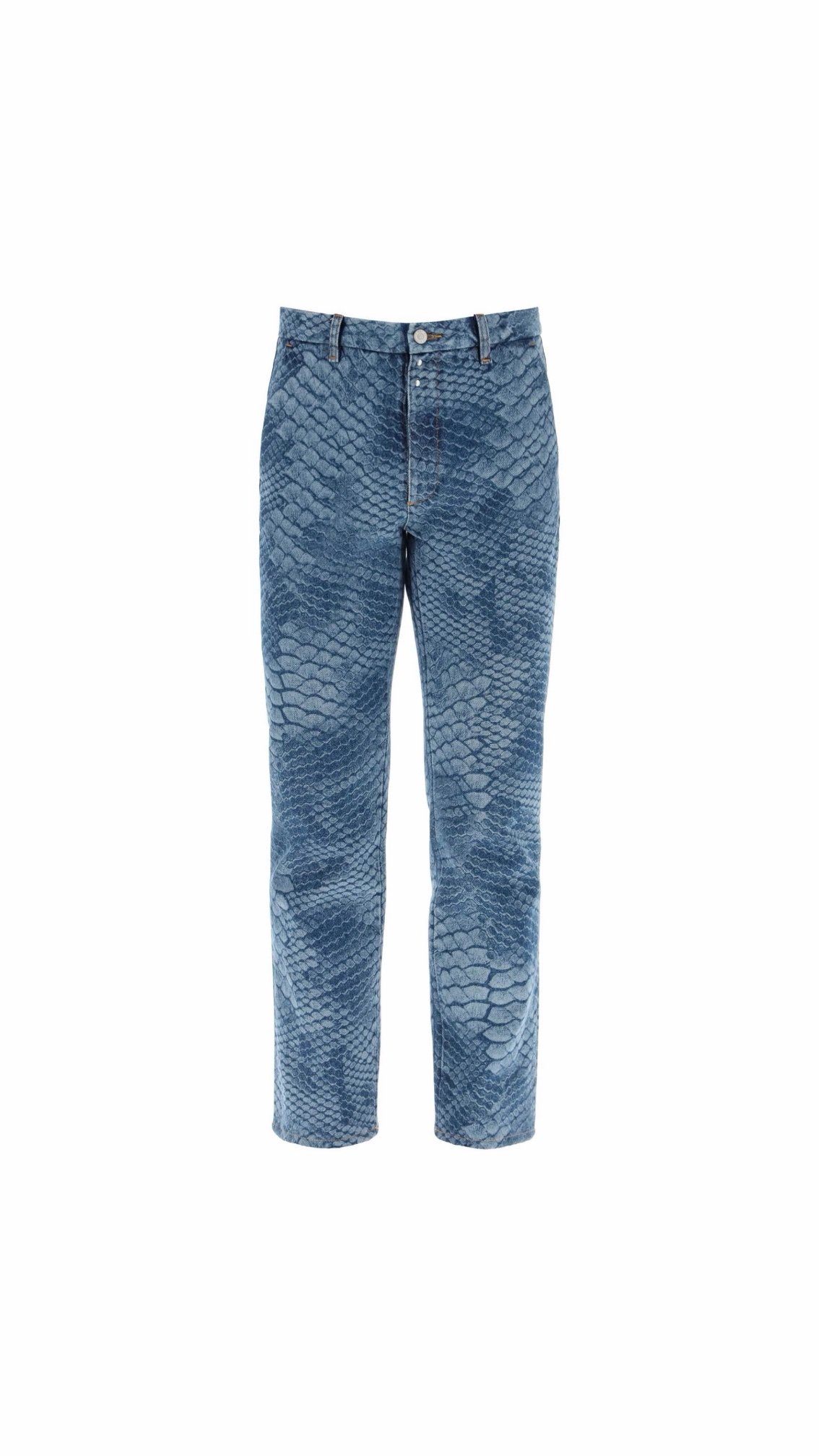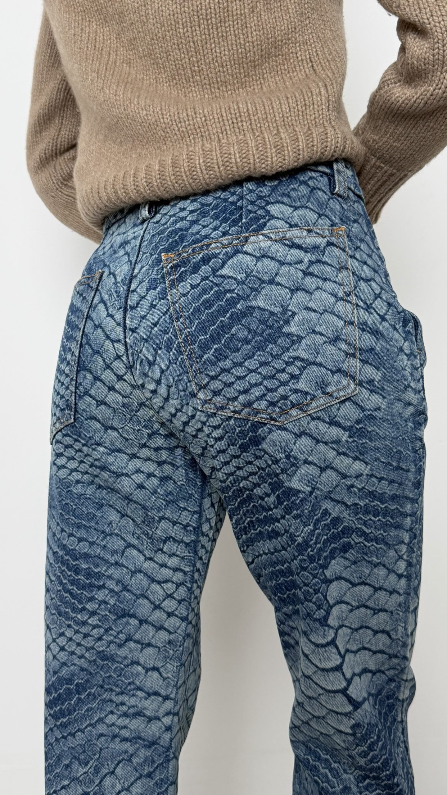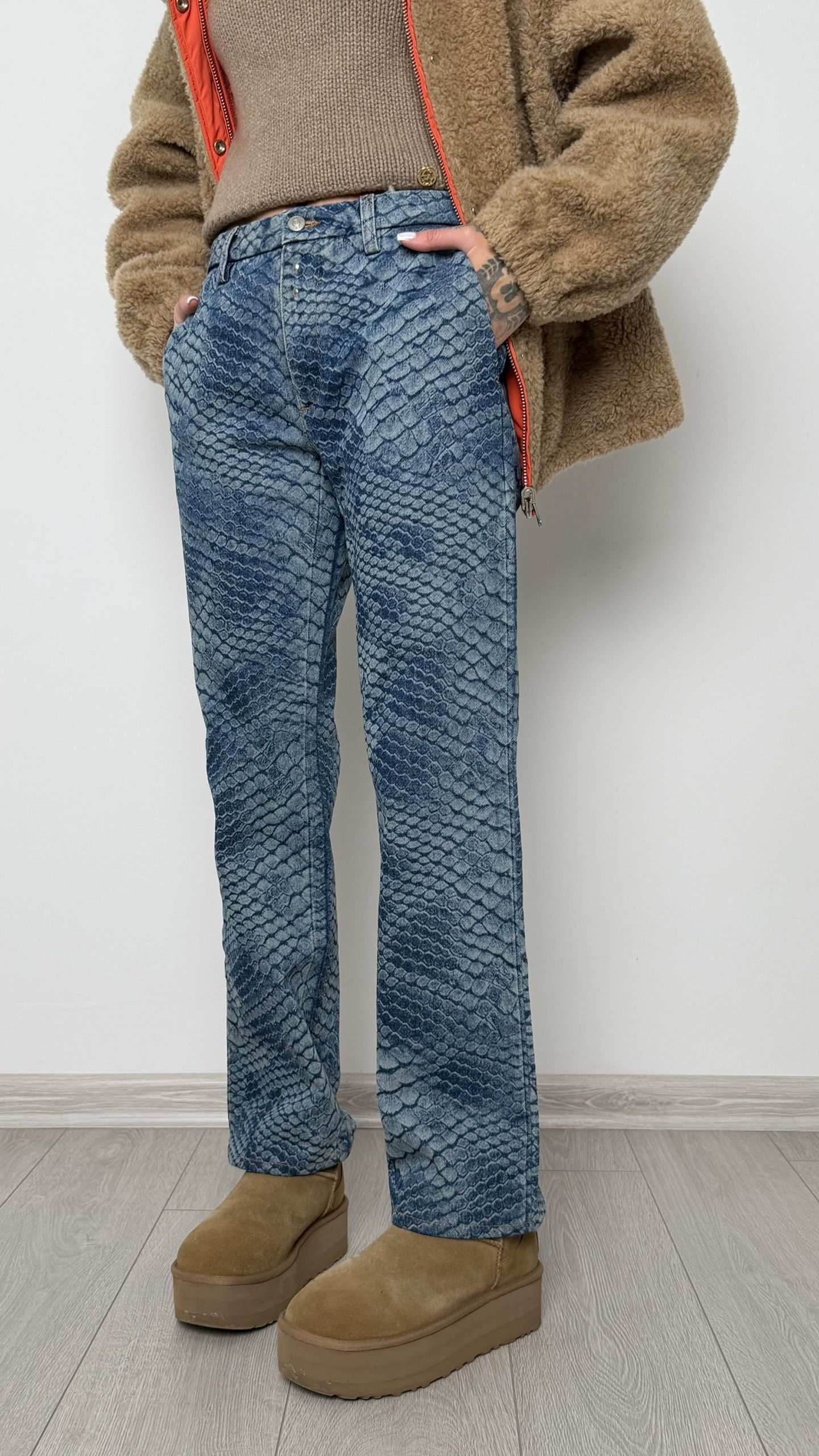 Джинси з ефектним принтом під зміїну шкіру. Прямий крій і щільний денім красиво тримають форму та підкреслюють силует. Яскравий акцент для стильних образів у дусі fashion-авангарду, який легко поєднується з базовим верхом.