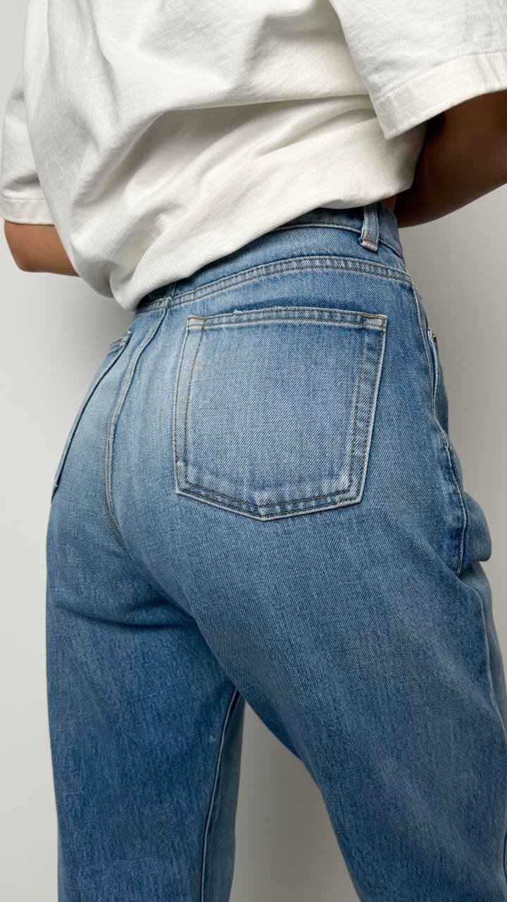 Джинси прямого крою у світло-синьому відтінку деніму. Модель із середньою посадкою, класичними п’ятьма кишенями та застібкою на блискавку з ґудзиком. Виконані з щільної бавовни без еластану, мають легкий ефект витирання для невимушеного повсякденного образу