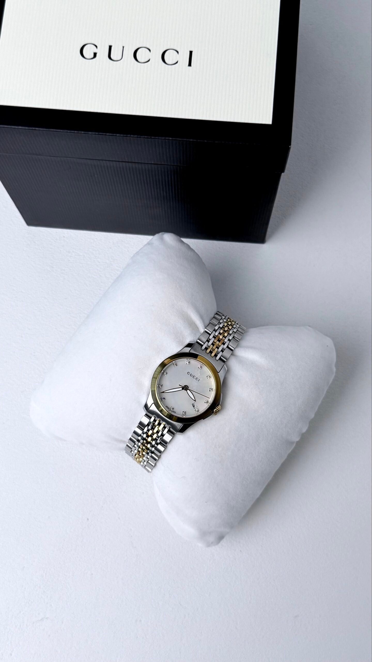 Цей елегантний жіночий годинник Gucci з колекції Timeless Classic виконаний з особливою майстерністю. Корпус діаметром 27 мм з PVD-покриттям прикрашений годинниковими мітками з діамантами та перламутровим циферблатом, захищеним сапфіровим склом.