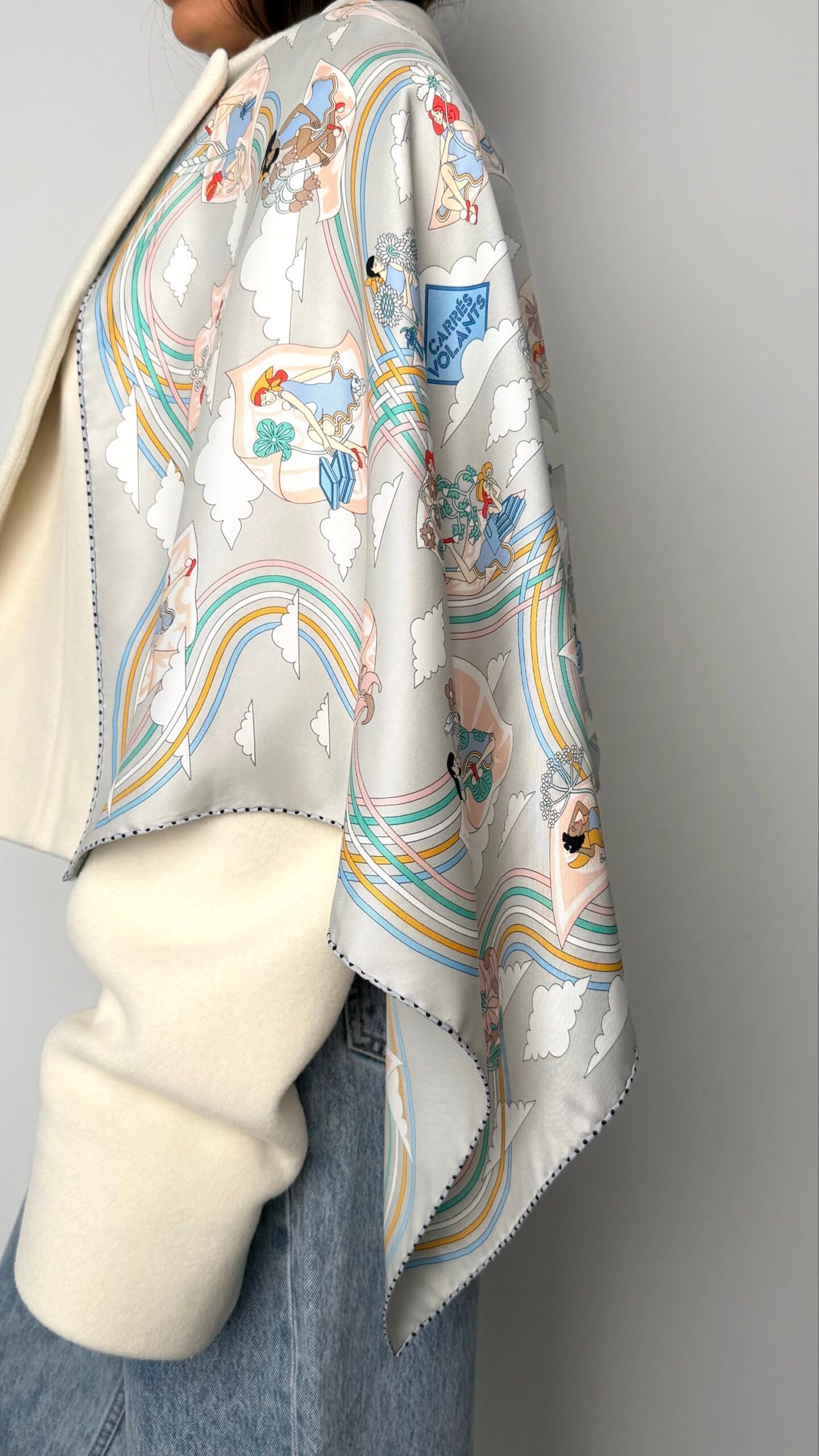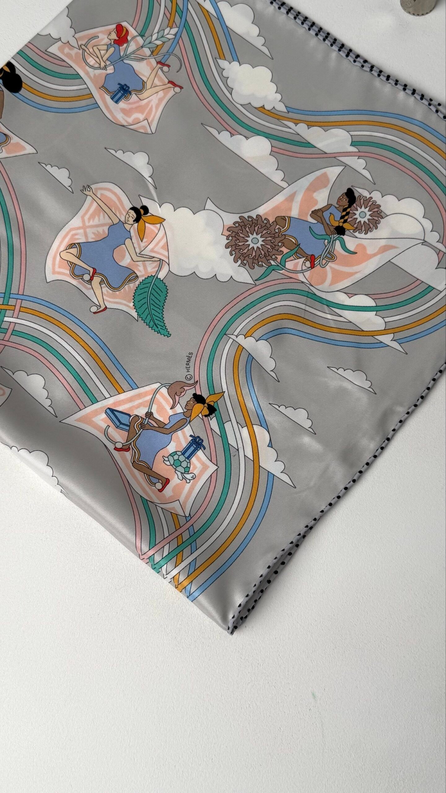 Центральною темою композиції є грайливі персонажі, що подорожують на «літаючих килимах», ролі яких виконують самі фірмові хустки Hermès. Малюнок наповнений дрібними деталями: хмаринками, райдужними лініями та витонченими фігурами, що створюють відчуття динаміки та мрійливості.