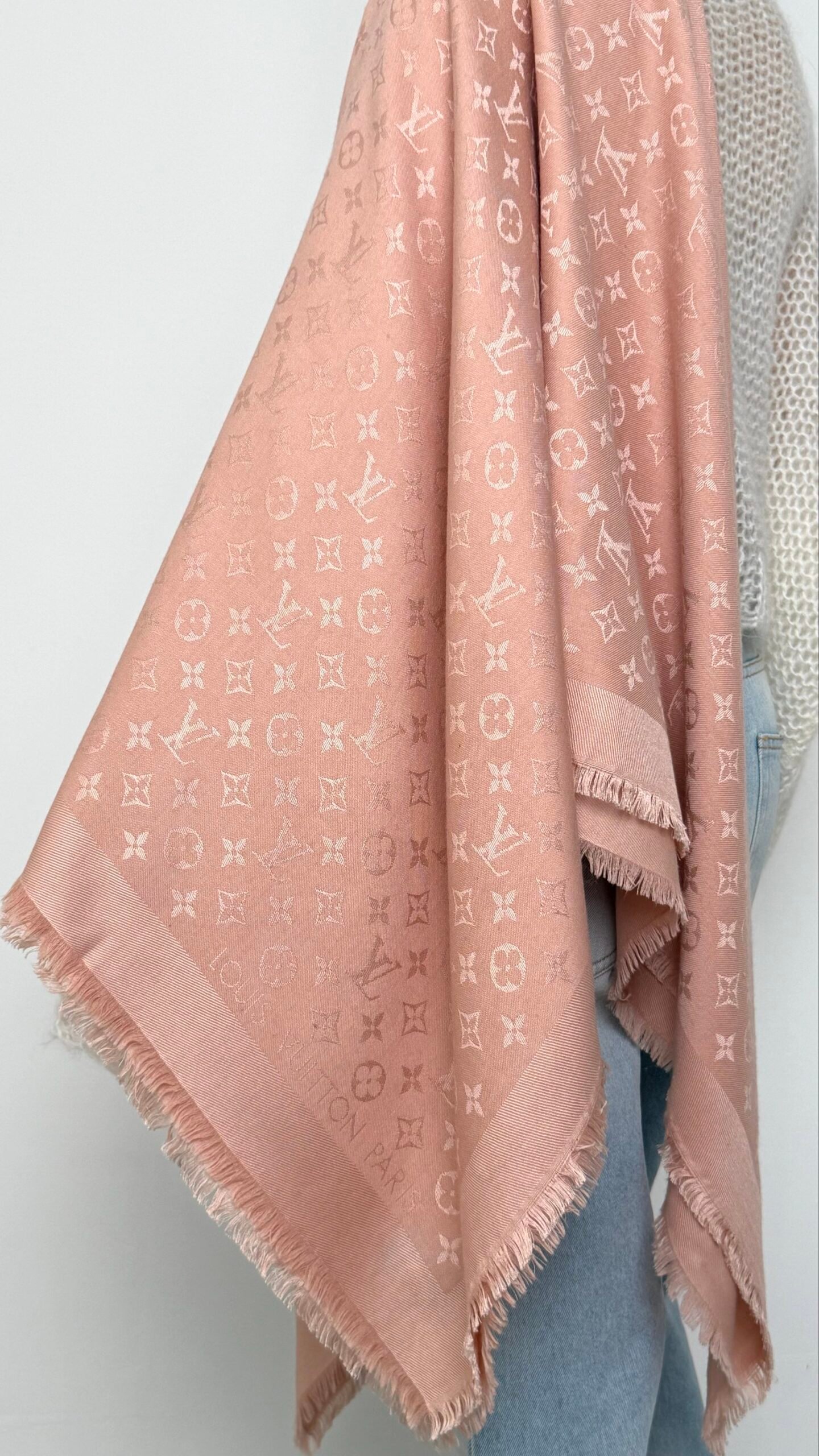 Додайте своєму образу нотку витонченої розкоші з цією класичною шаллю. Виконана у ніжному пастельно-рожевому відтінку, вона прикрашена легендарним жакардовим плетінням Monogram, яке м’яко переливається при світлі. Завдяки ідеальному поєднанню шовку та вовни, виріб має благородний матовий блиск, неймовірно приємний на дотик і чудово зігріває в прохолодну погоду.