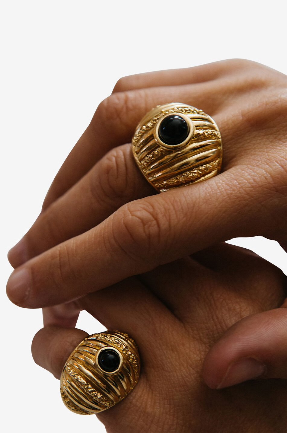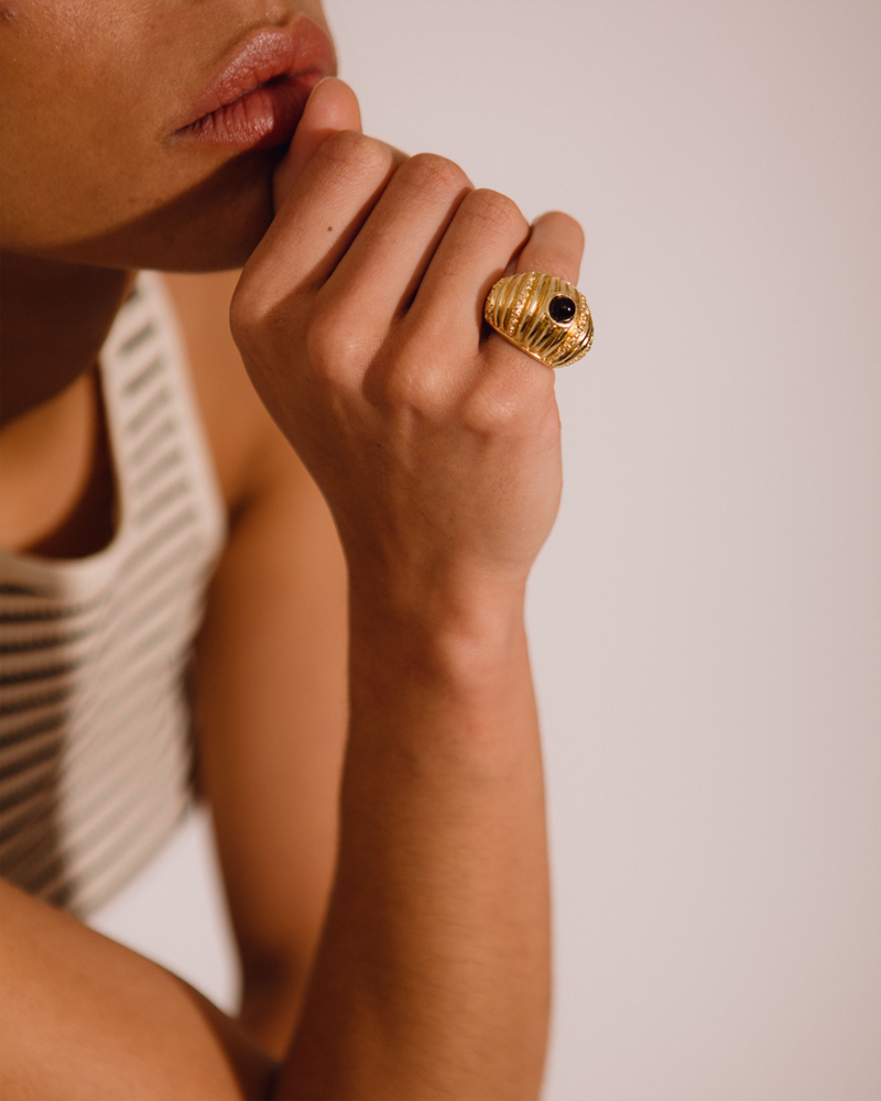 Каблучка Paola Sighinolfi із чорним оніксом та покриттям позолотою 18 карат. Масивна форма з хвилястою фактурою створює ефект скульптурності, а глибокий блиск каменю додає розкоші та характеру. Витончений і водночас виразний аксесуар