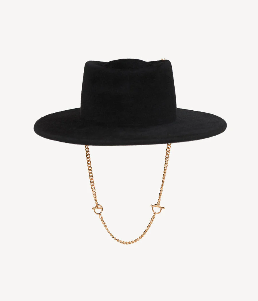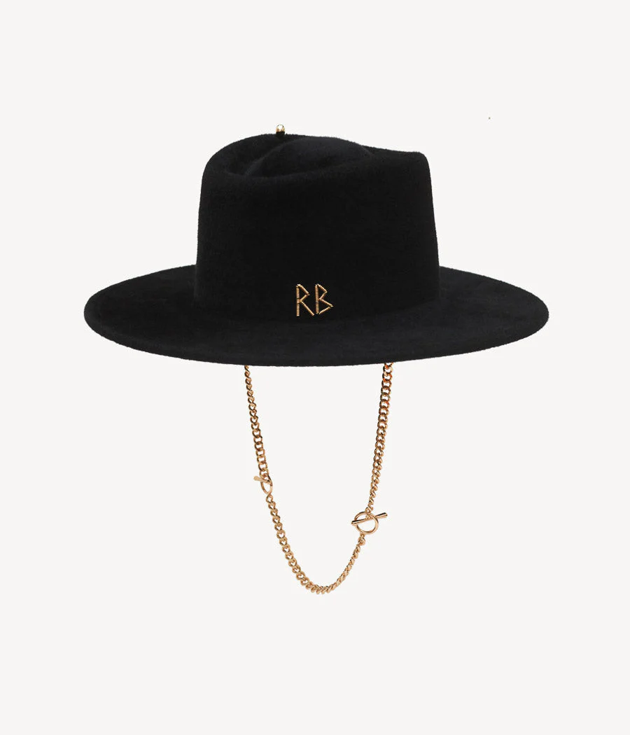 Капелюх Ruslan Baginskiy Chain Strap Felt Canotier Hat із чорного фетру з фірмовою стрічкою та знімним золотим ланцюгом — стильне поєднання класики й сучасного акценту. Жорсткі поля й декоративна фурнітура додають образу елегантності з ноткою бунтарства