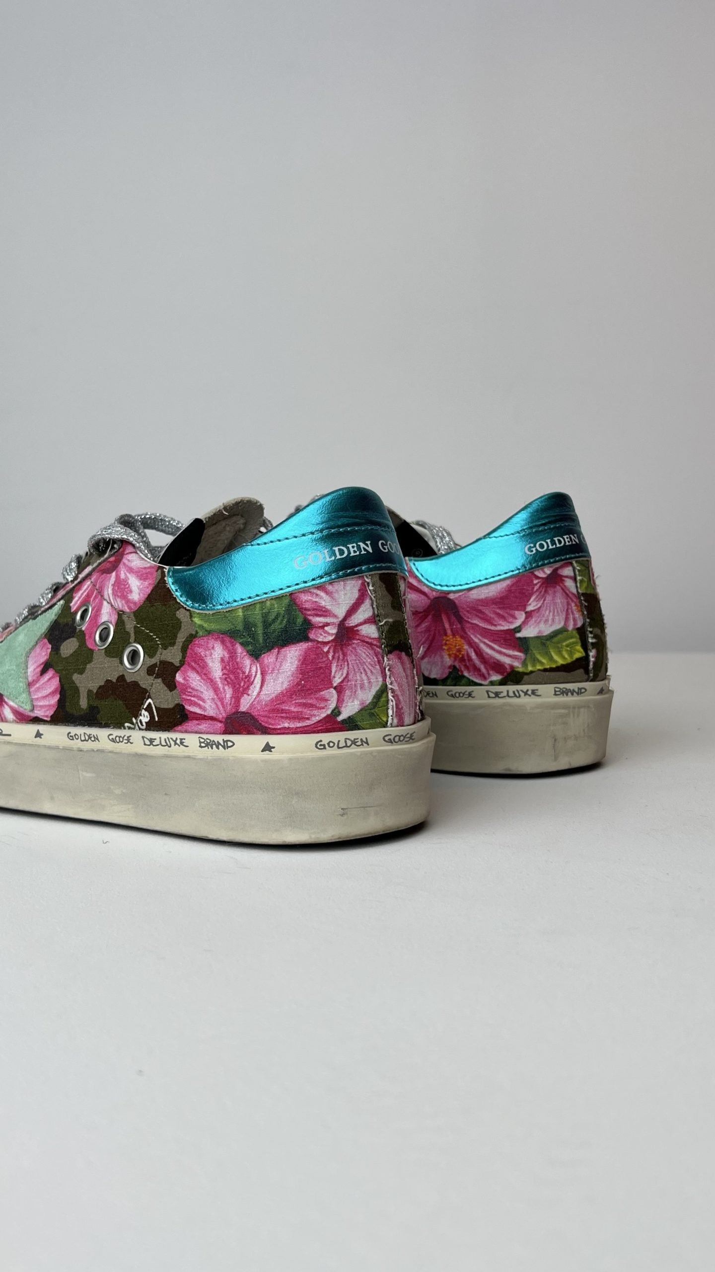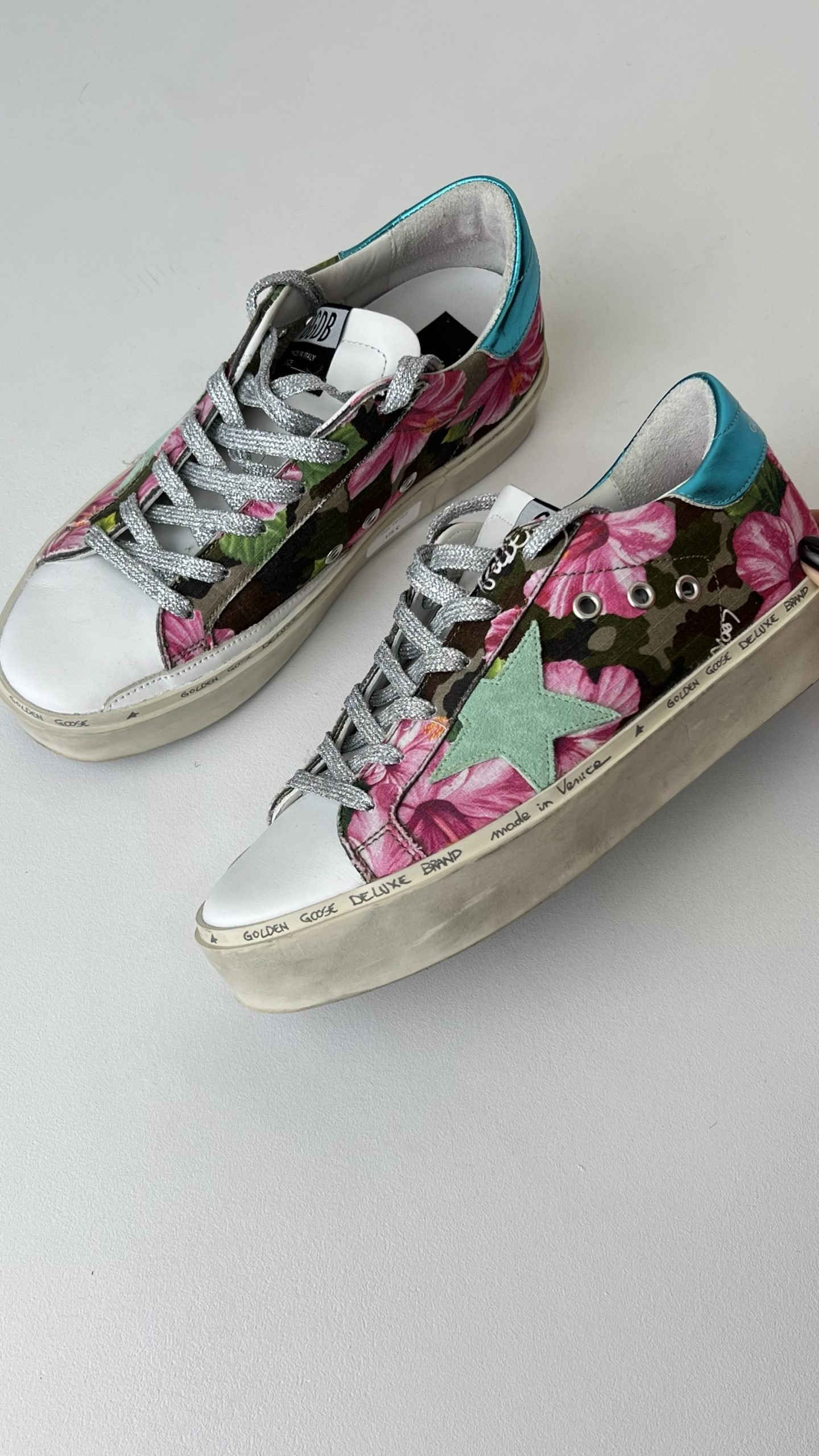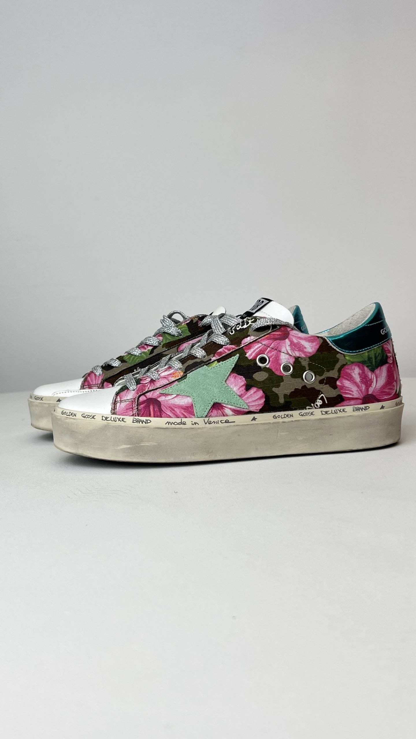 Кеди з квітковим принтом і камуфляжними деталями, акцентною зіркою м’ятного кольору та бірюзовою вставкою на п’яті. Фірмові потертості та сріблясті шнурівки додають стилю urban chic