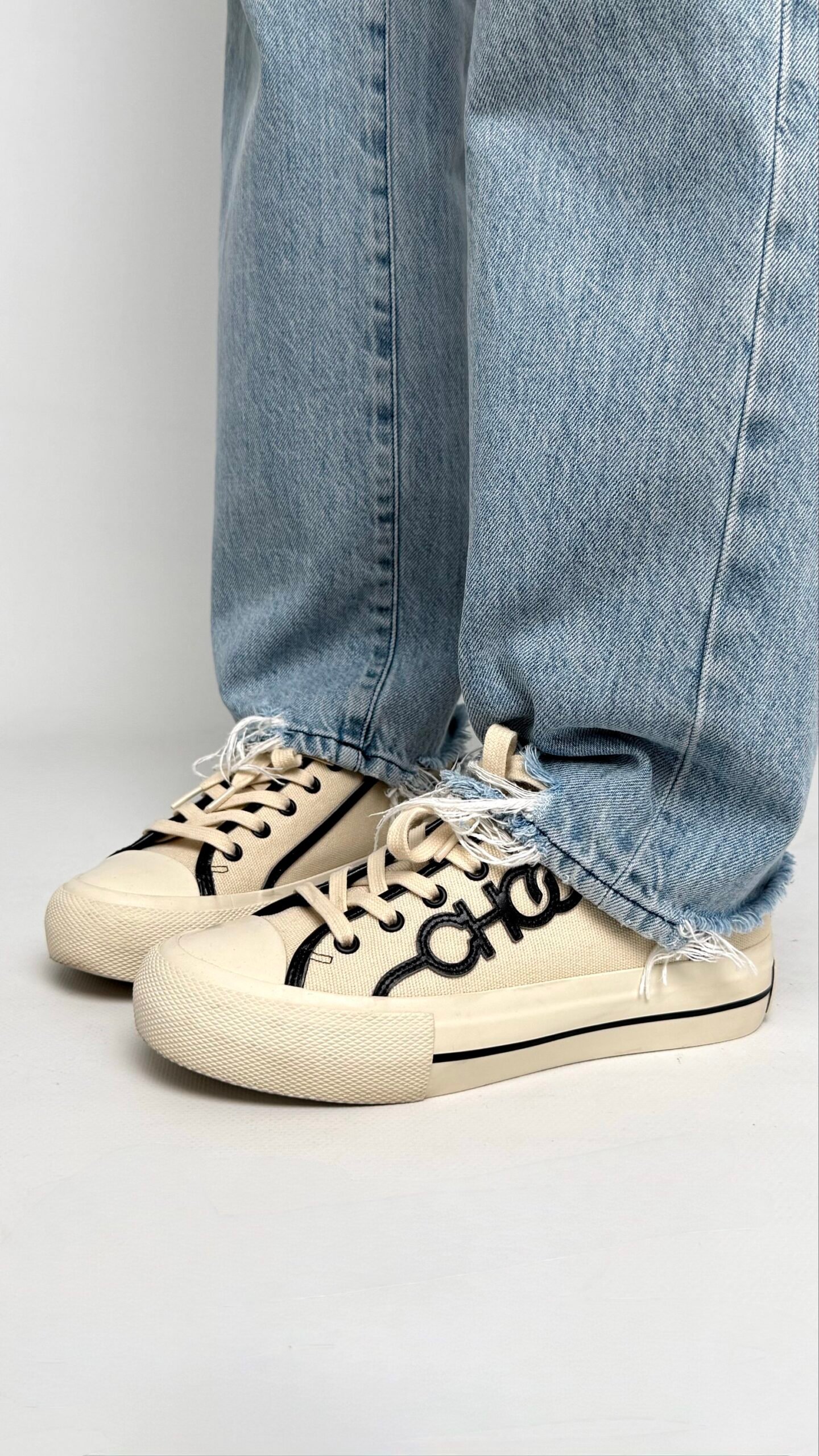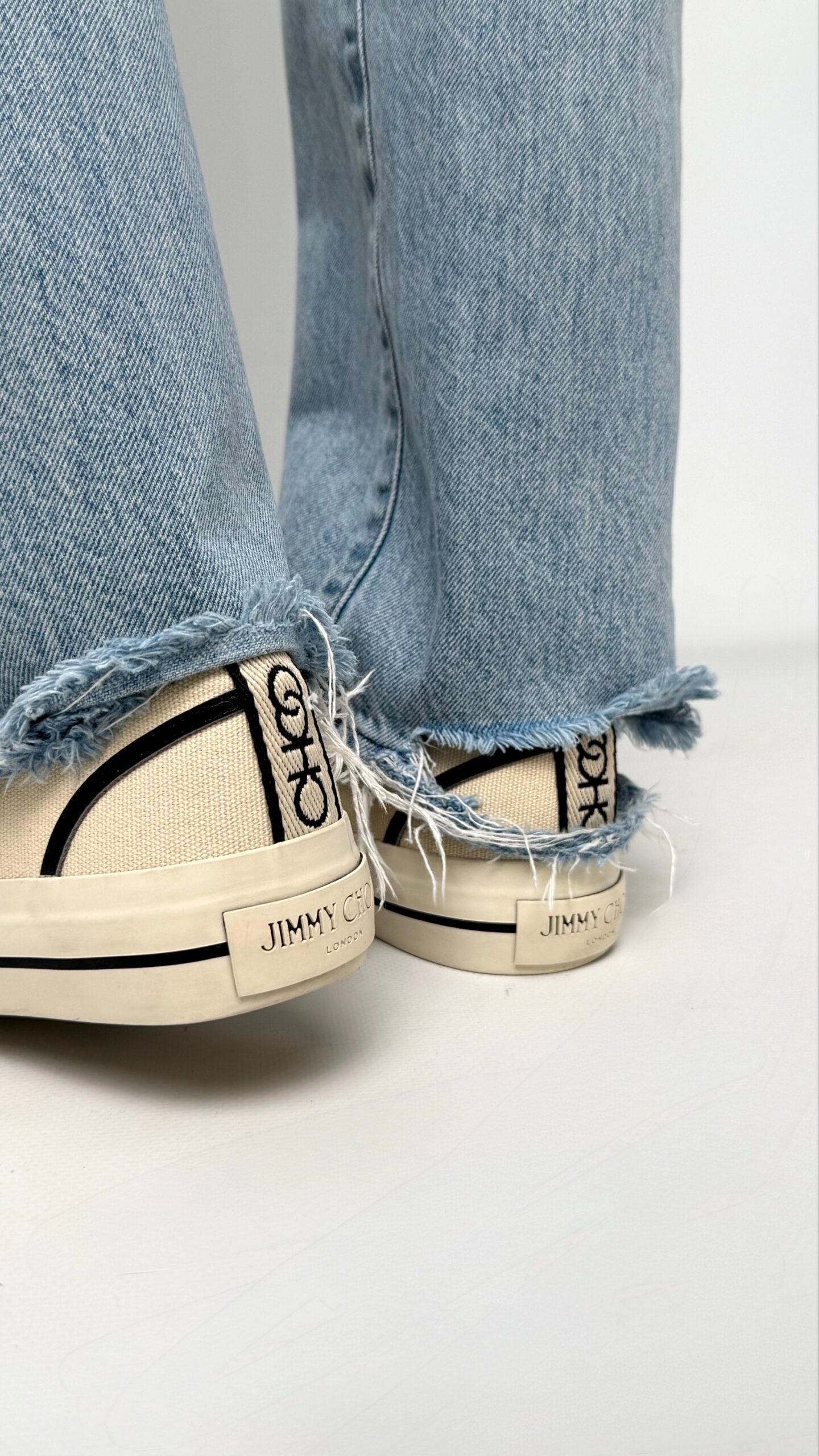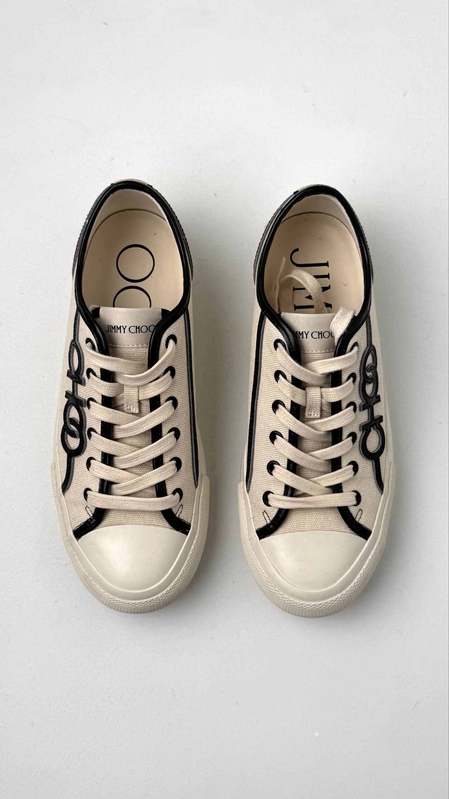 Ці низькі кеди від Jimmy Choo — ідеальне поєднання спортивного силуету та високої моди. Модель виконана в лаконічній молочно-бежевій гамі з контрастним чорним оздобленням, що робить їх універсальним доповненням як до повсякденного деніму, так і до більш вишуканих образів.