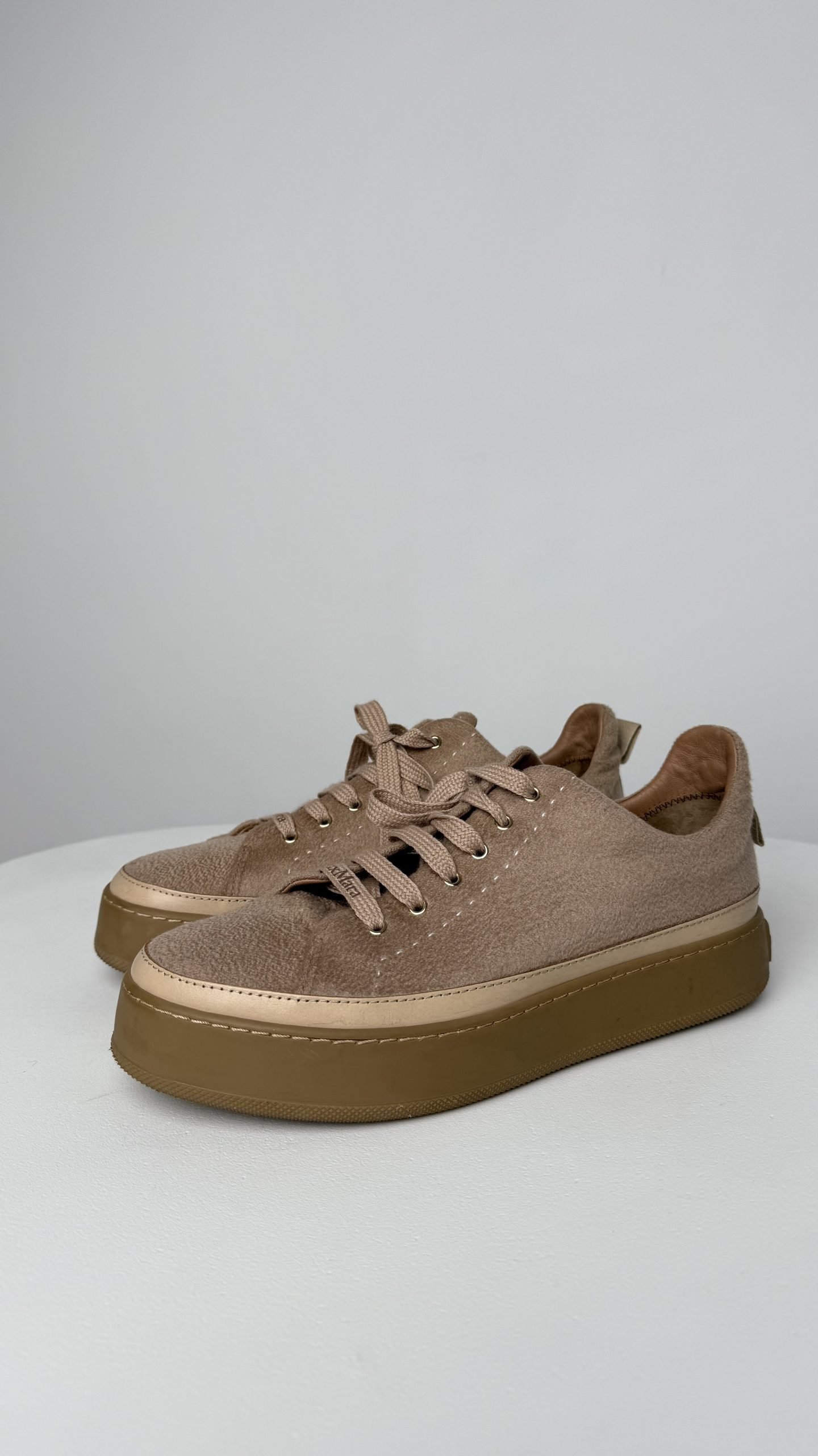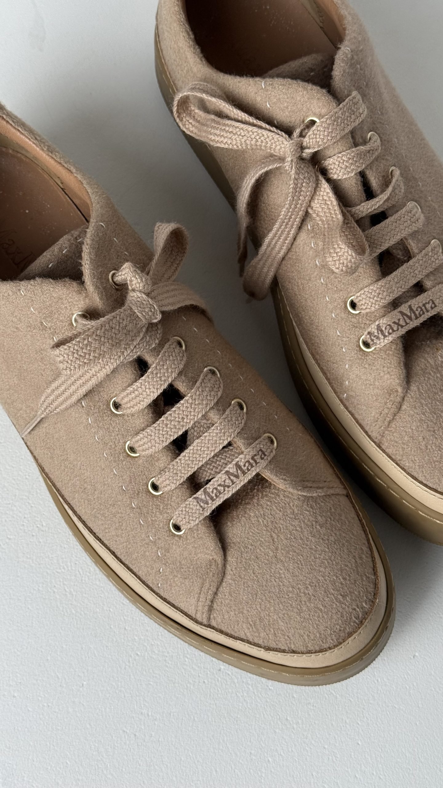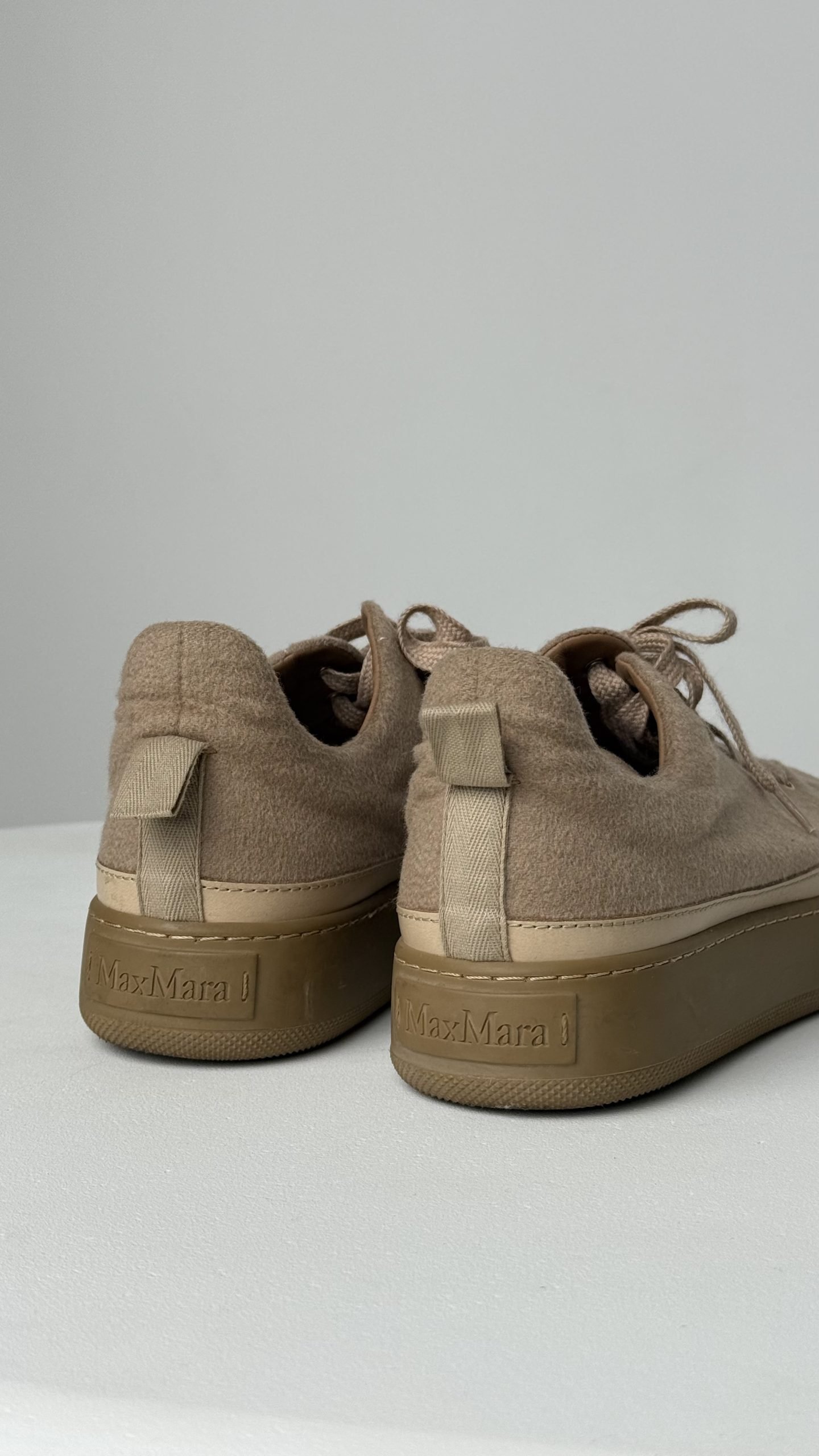 Елегантні та надзвичайно комфортні кеди з 100% кашеміру у теплій світло-бежевій палітрі. М’яка фактура, фірмовий логотип Max Mara на шнурках, акуратні ручні стібки — усе це робить пару максимально преміальною. Легкі, теплі, універсальні та практично невагомі в носінні