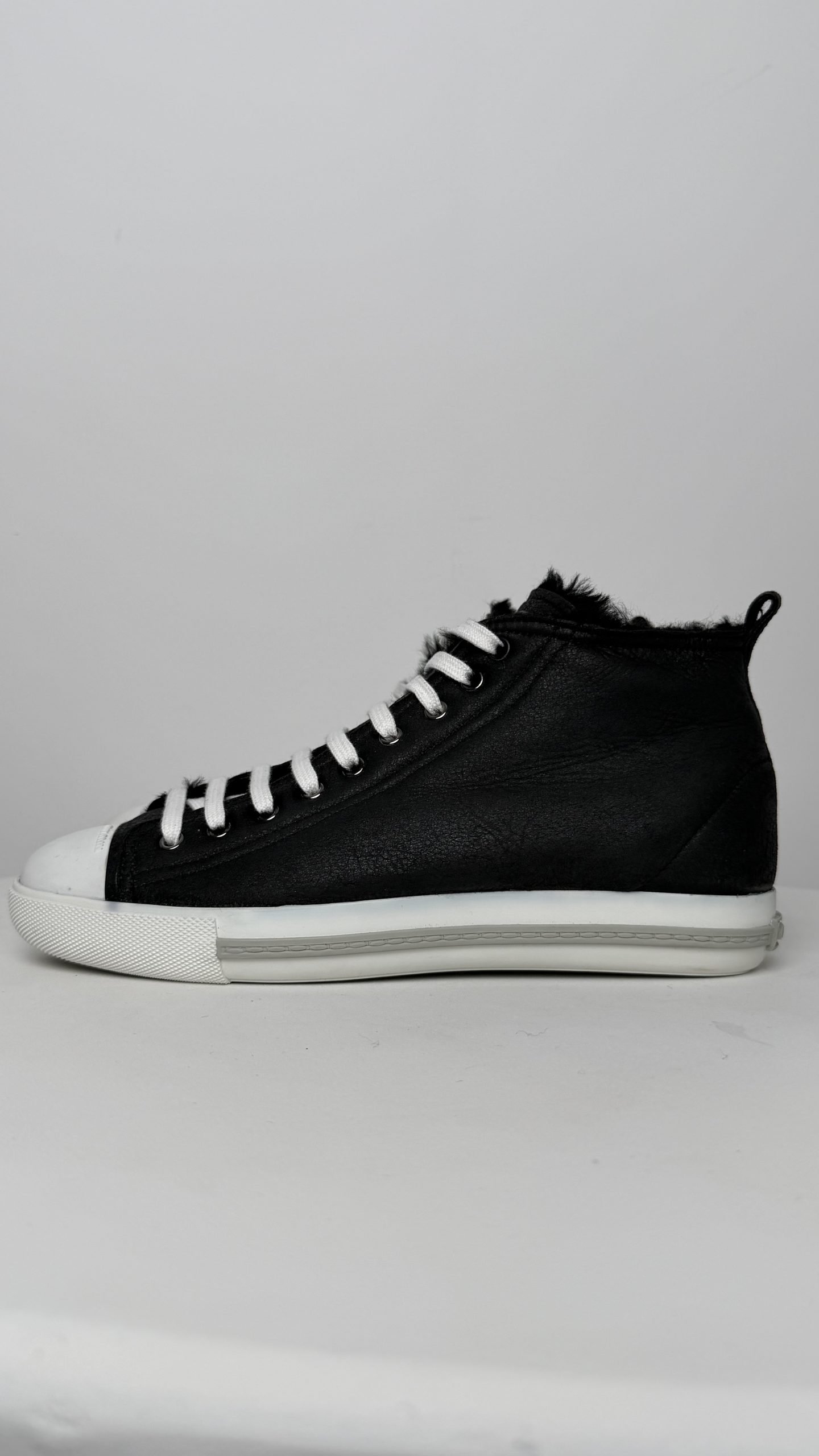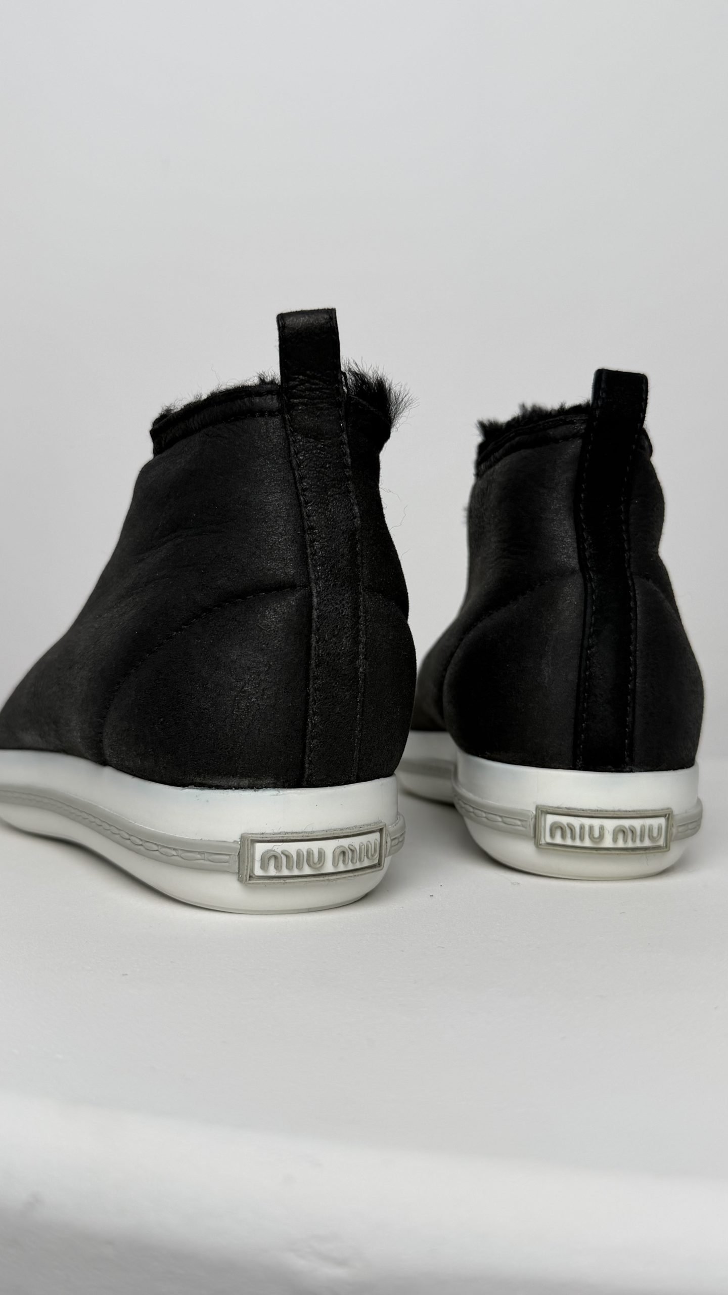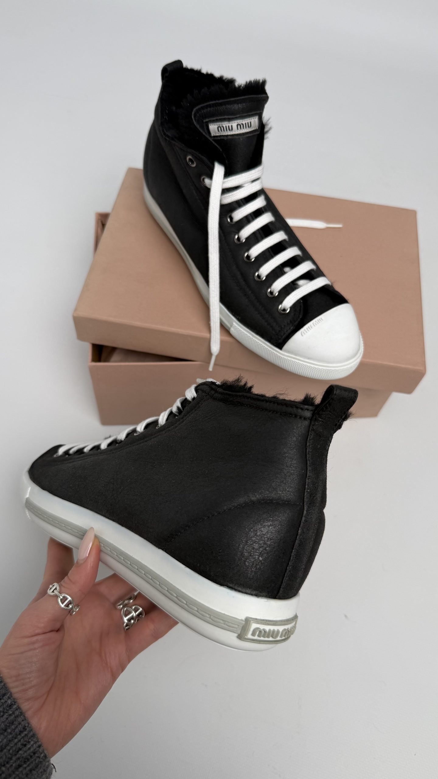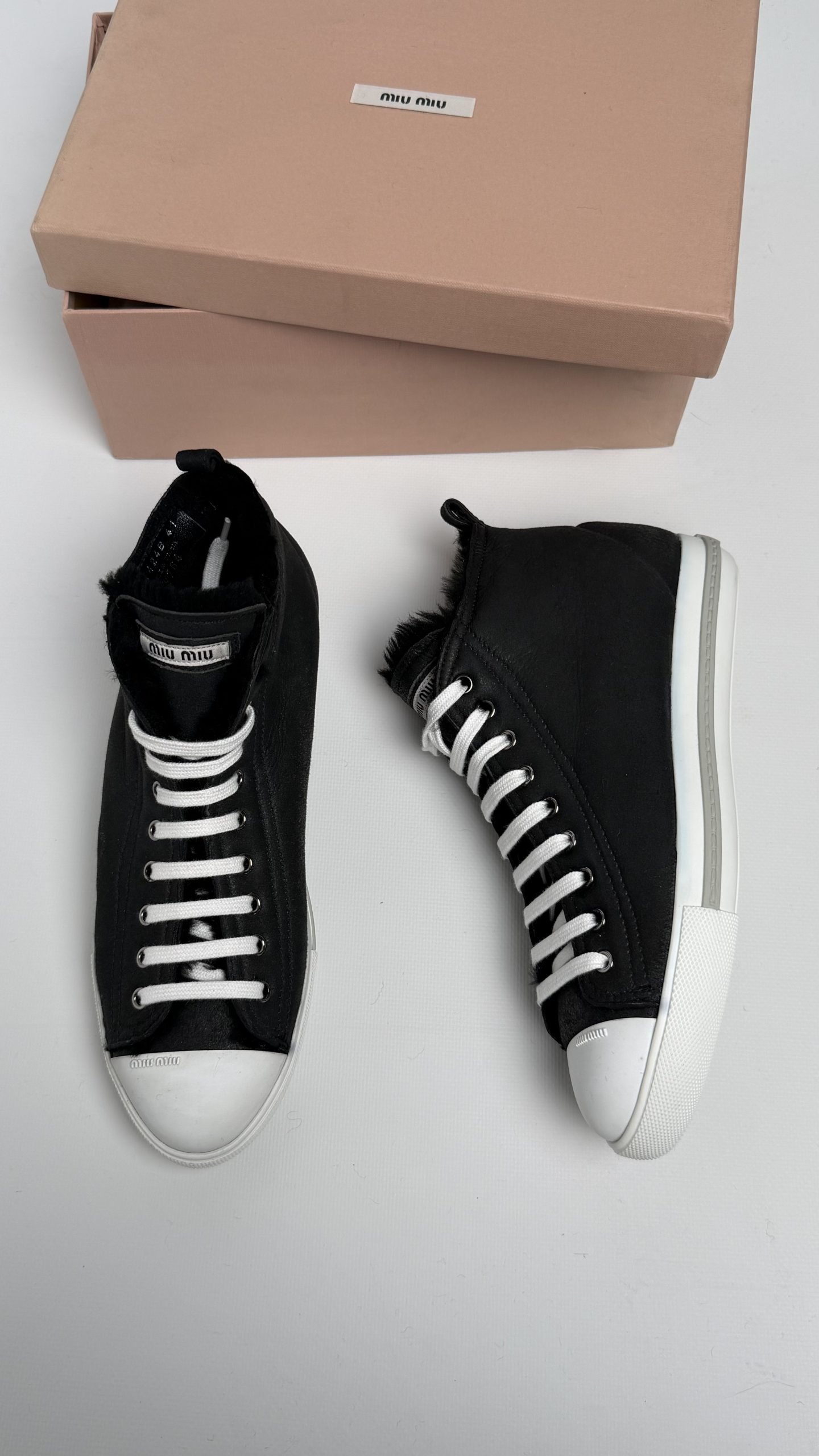 Чорні high-top кеди Miu Miu зі всерединним хутром — теплі, комфортні та ультрастильні. Контрастні білі шнурки, фірмове лого та гумова підошва створюють модний casual-силует