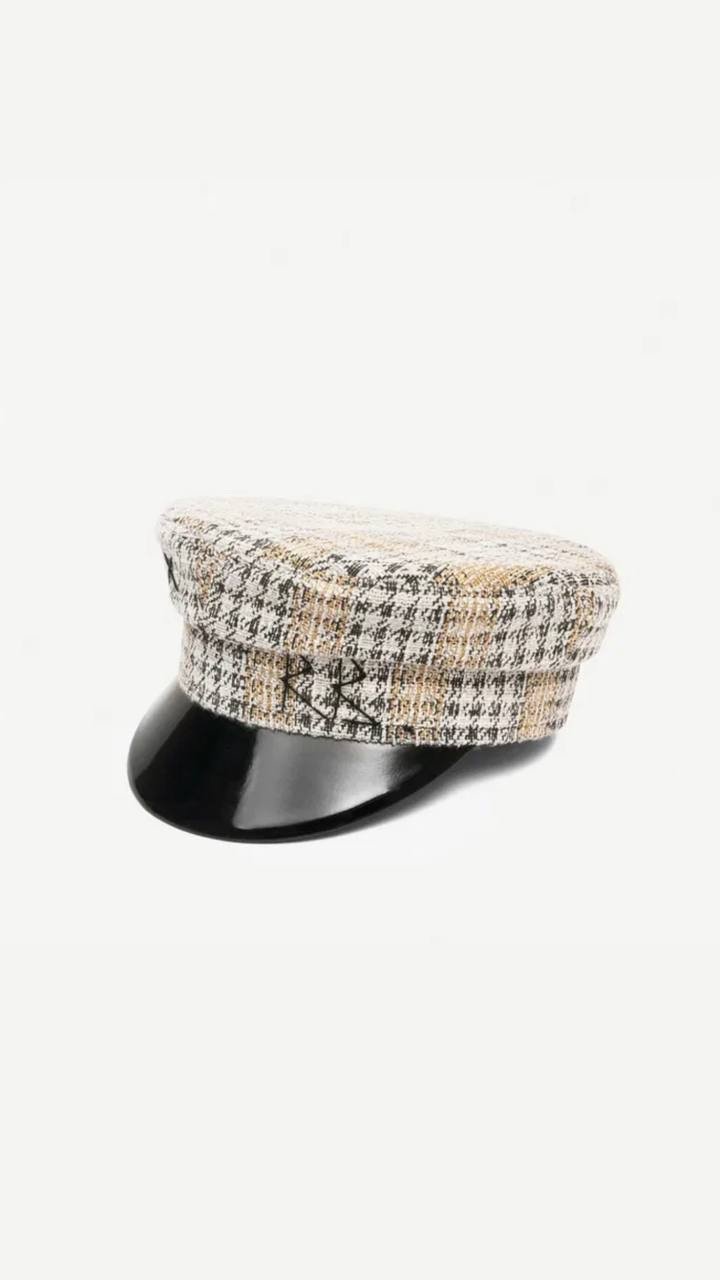 Впізнаване кепі Ruslan Baginskiy з фактурної твідової тканини у світлій гамі з лаконічним логотипом бренду. Контрастний лакований козирок додає сучасного характеру та підкреслює фірмову естетику.