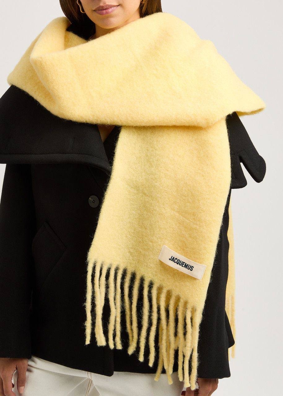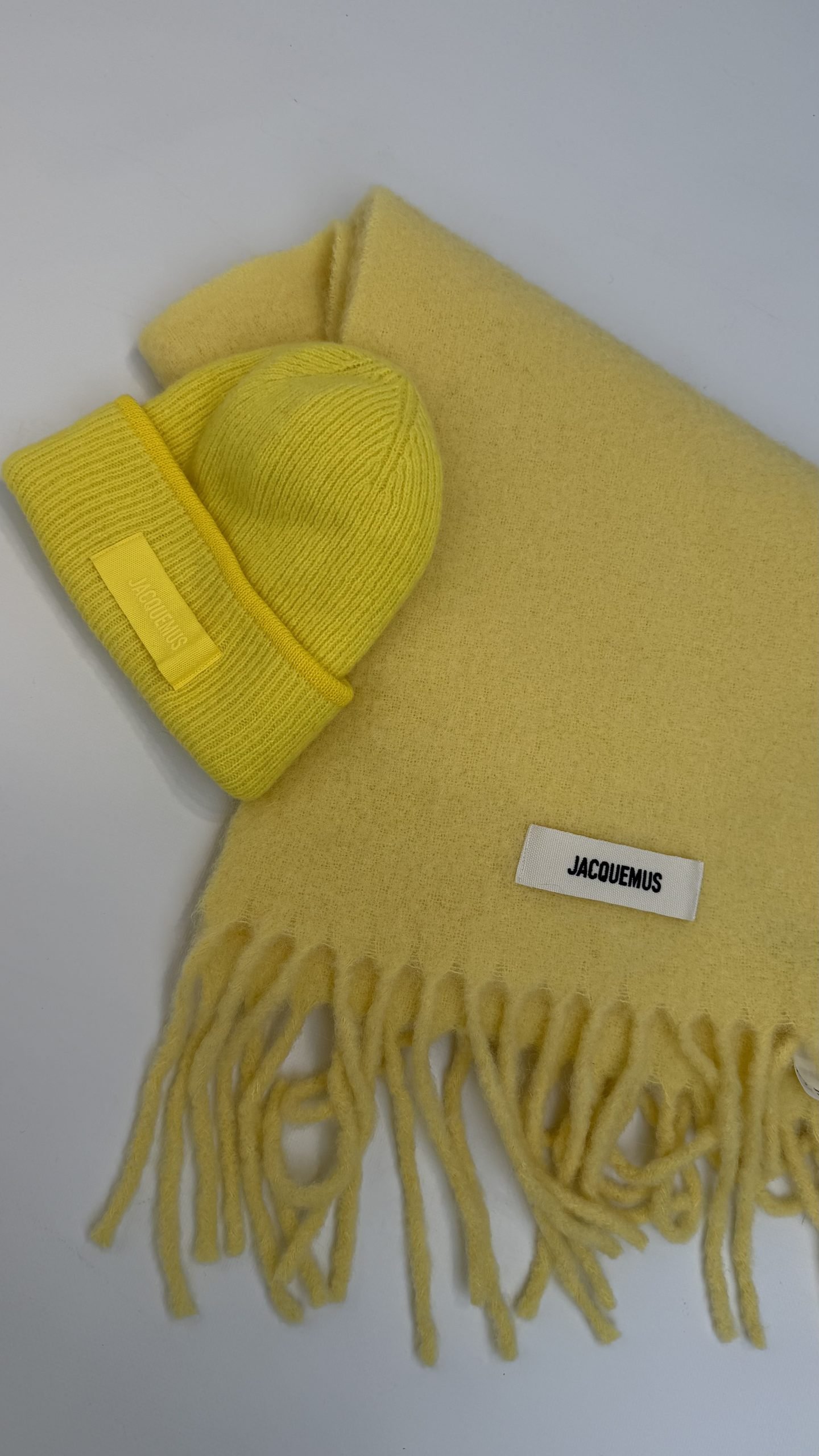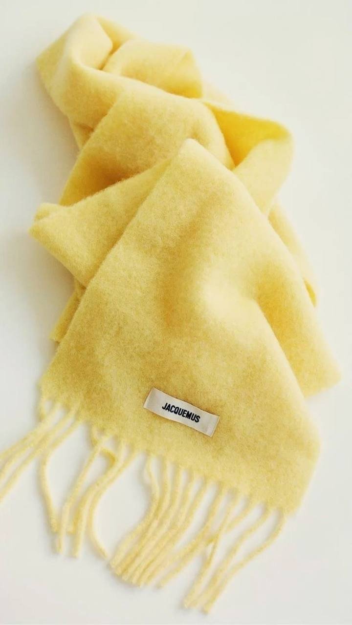 Комплект від Jacquemus у насиченому сонячно-жовтому відтінку — стильний дует, що одразу додає тепла та настрою образу. Шапка-біні виконана з м’якої в’язаної вовни, має щільний еластичний відворот і фірмовий текстильний патч Jacquemus. Комфортна, тепла й дуже приємна до тіла. Шарф із пухнастої вовни у тон до шапки, з довгою об’ємною бахромою по краях та мінімалістичним лейблом бренду. Стильний, затишний та універсальний