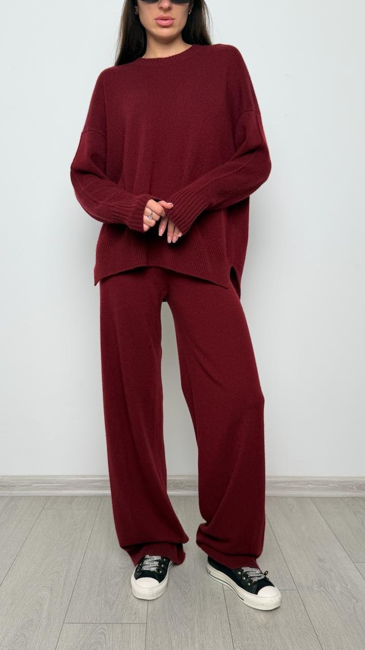 Бордово-червоний костюм із м’якого кашеміру — поєднання затишку та елегантності. Вільний светр з опущеною лінією плеча та розрізами з боків чудово гармоніює з широкими штанами на еластичному поясі. Легка, тепла й дихаюча тканина забезпечує комфорт, створюючи розслаблений, але вишуканий образ для щоденного носіння