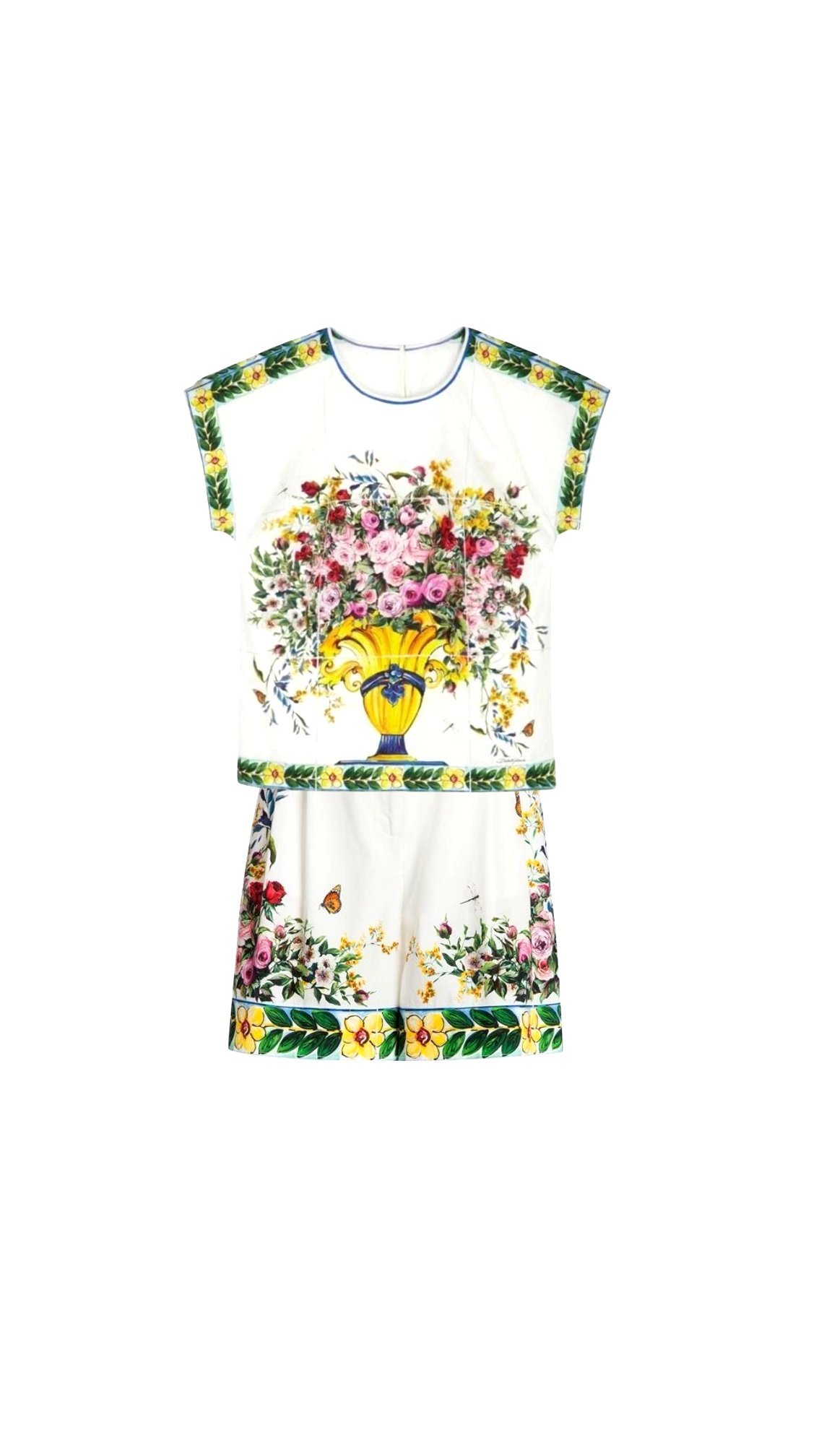 Додайте яскравих фарб у свій гардероб за допомогою цього вишуканого комплекту-двійки від культового бренду Dolce & Gabbana. Костюм складається з топа вільного крою та шортів із завищеною талією, прикрашених авторським принтом у вигляді пишного букета троянд у класичній жовтій вазі, що є знаковим елементом стилю бренду.Цей комплект — готовий образ для прогулянки на яхті, літнього бранчу або відпочинку на курорті. Поєднуйте його з плетеними сумками, босоніжками на плоскому ходу або еспадрильями. Для створення образу “total look” додайте шовкову хустку та великі сонцезахисні окуляри.