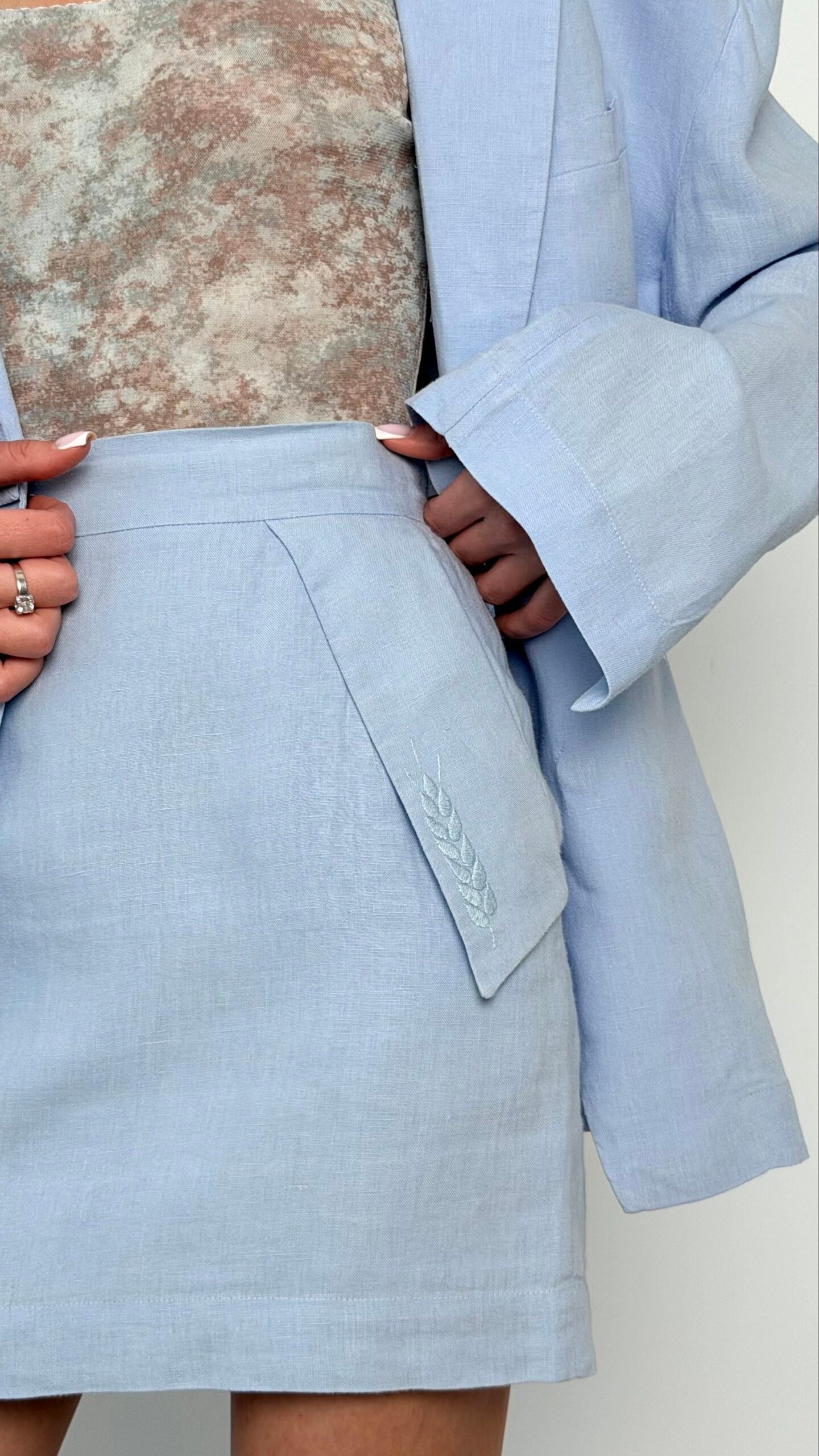 Елегантність зустрічається з легкістю у цьому бездоганному комплекті від відомого бренду JAMEMME. Виконаний у ніжному пастельно-блакитному відтінку, цей костюм-двійка стане ідеальним вибором для літніх подій, ділових зустрічей або вишуканих вечірніх виходів.