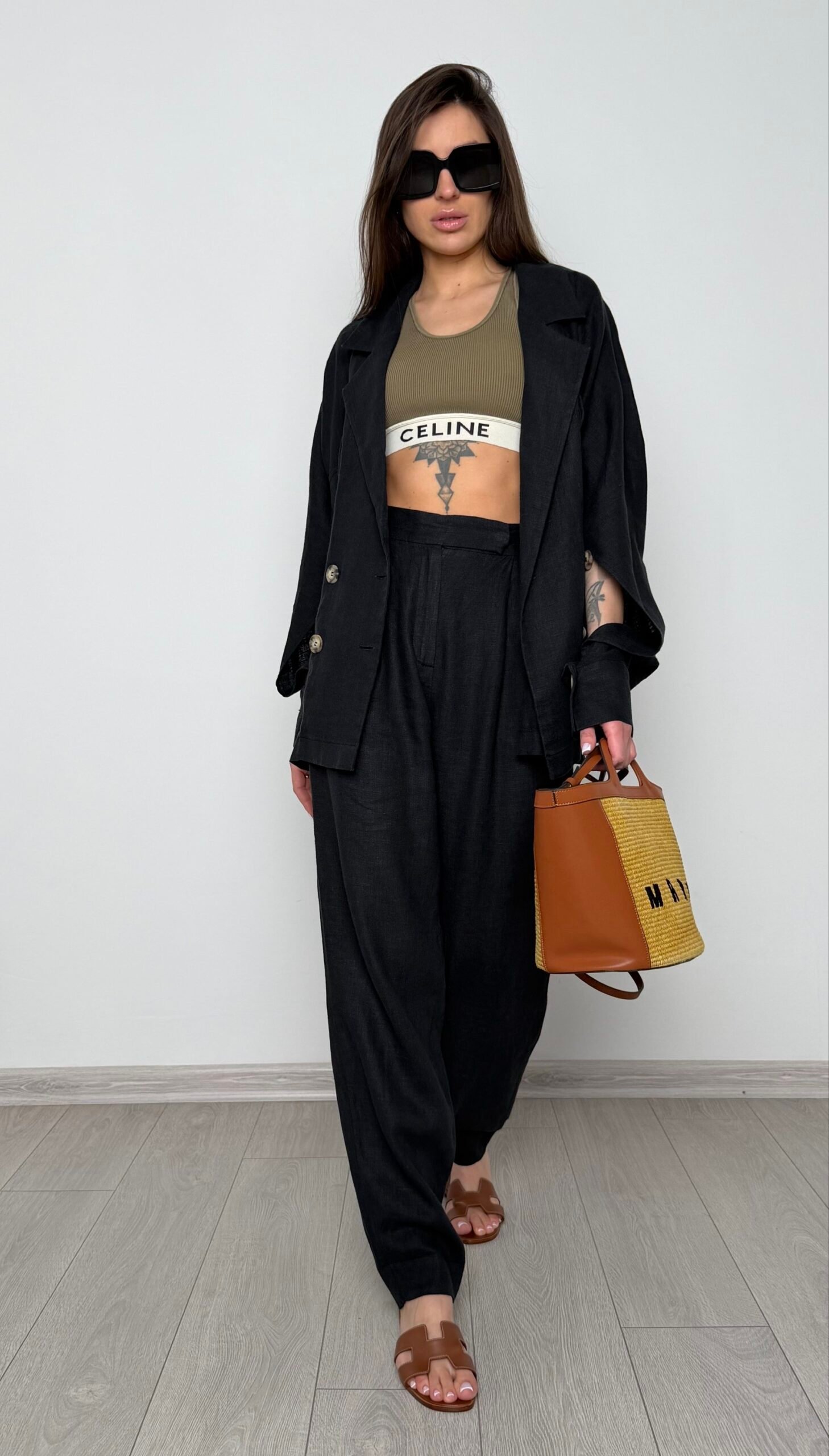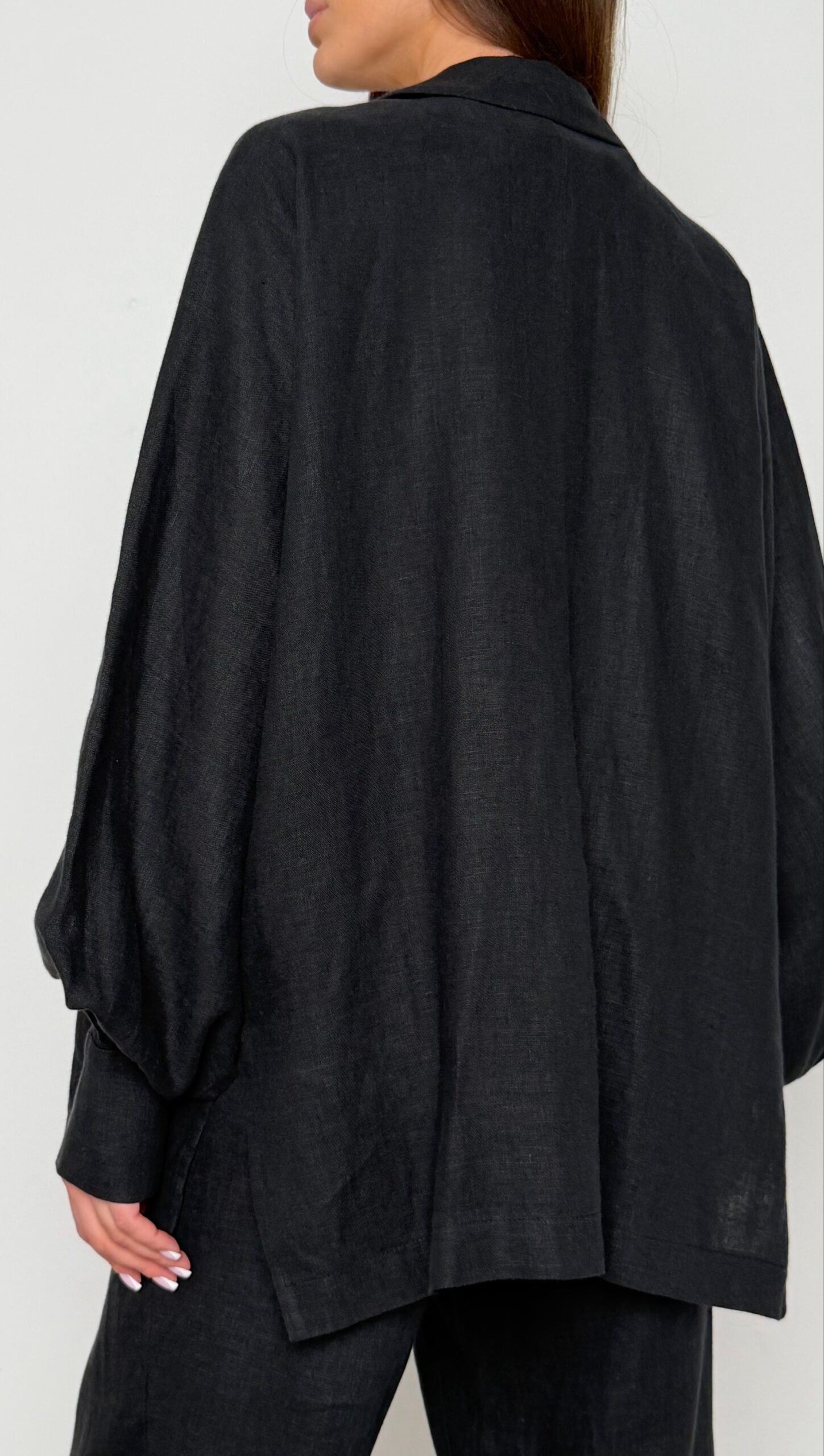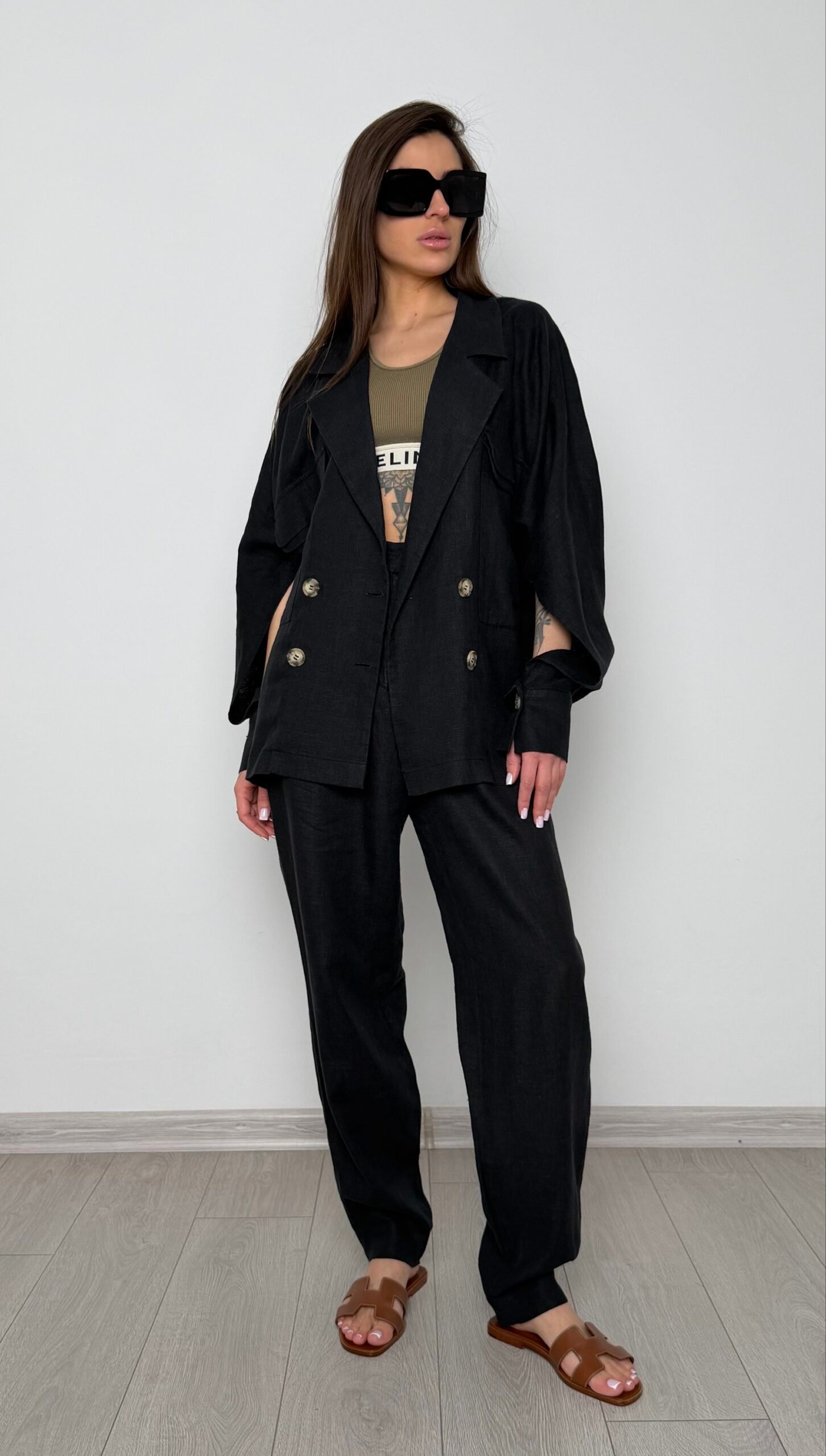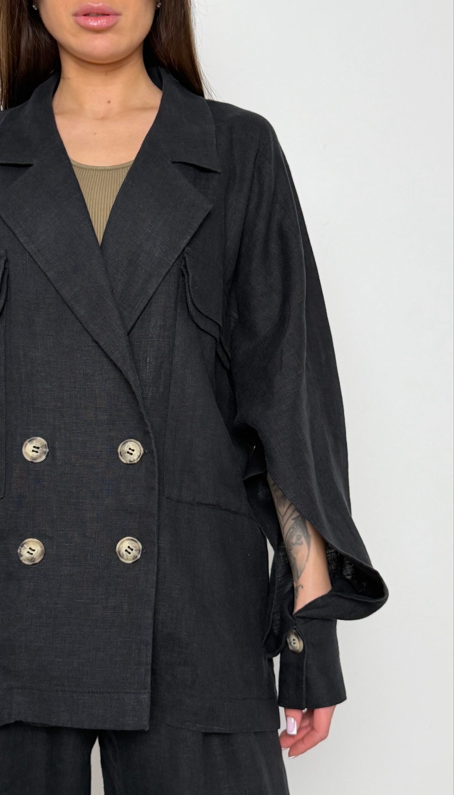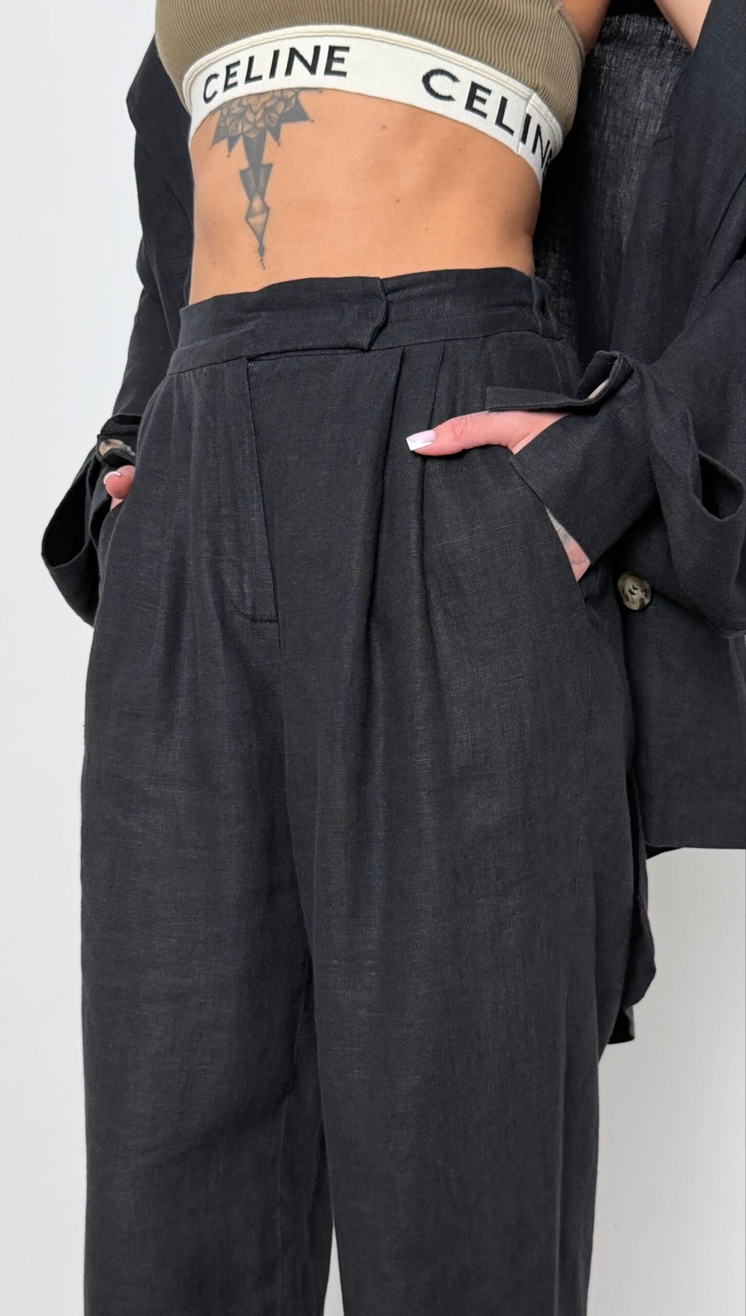 Еталон інтелектуальної моди. Костюм складається з оверсайз жакета з функціональними розрізами на рукавах та штанів із високою посадкою. Виконаний з високоякісного льону, цей комплект стане незамінною базою вашого літнього гардероба.