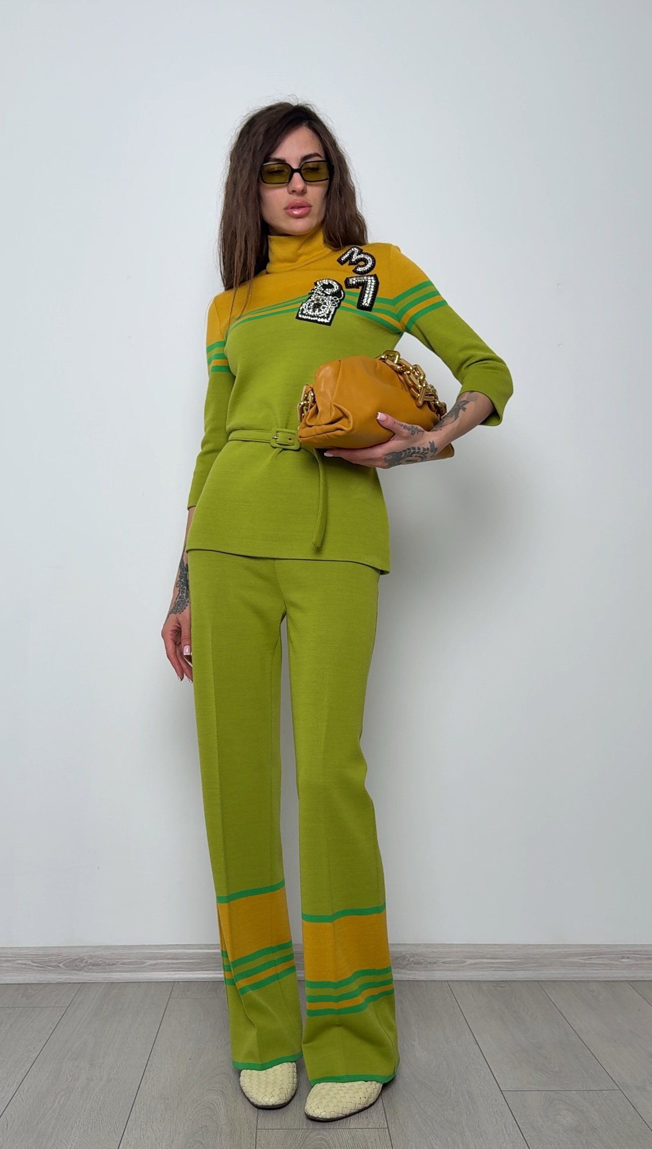 Подіумна модель! Костюм у відтінках лайму й гірчиці – сучасний сет із поясом, поєднання яскравих кольорів і геометричних ліній