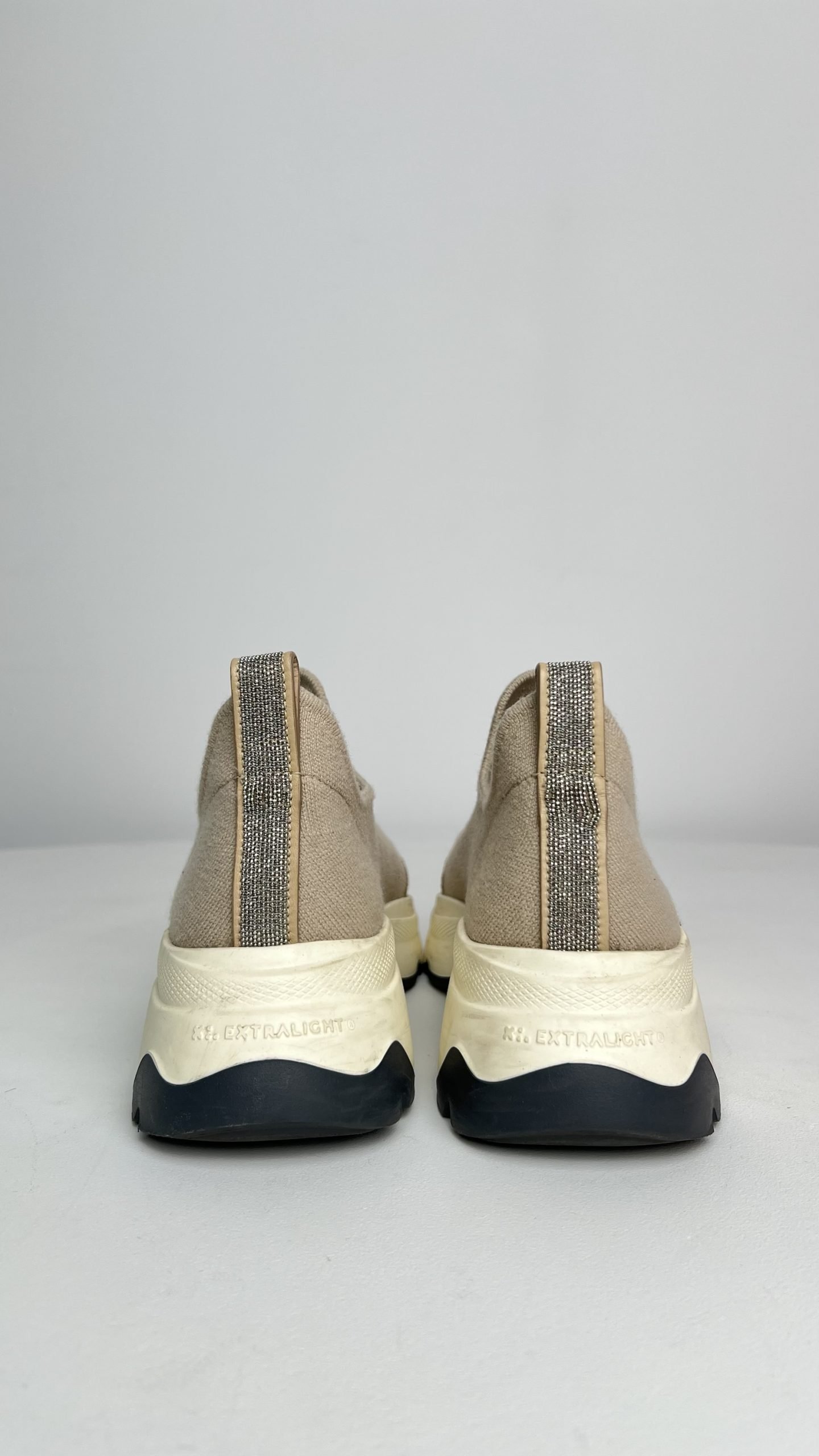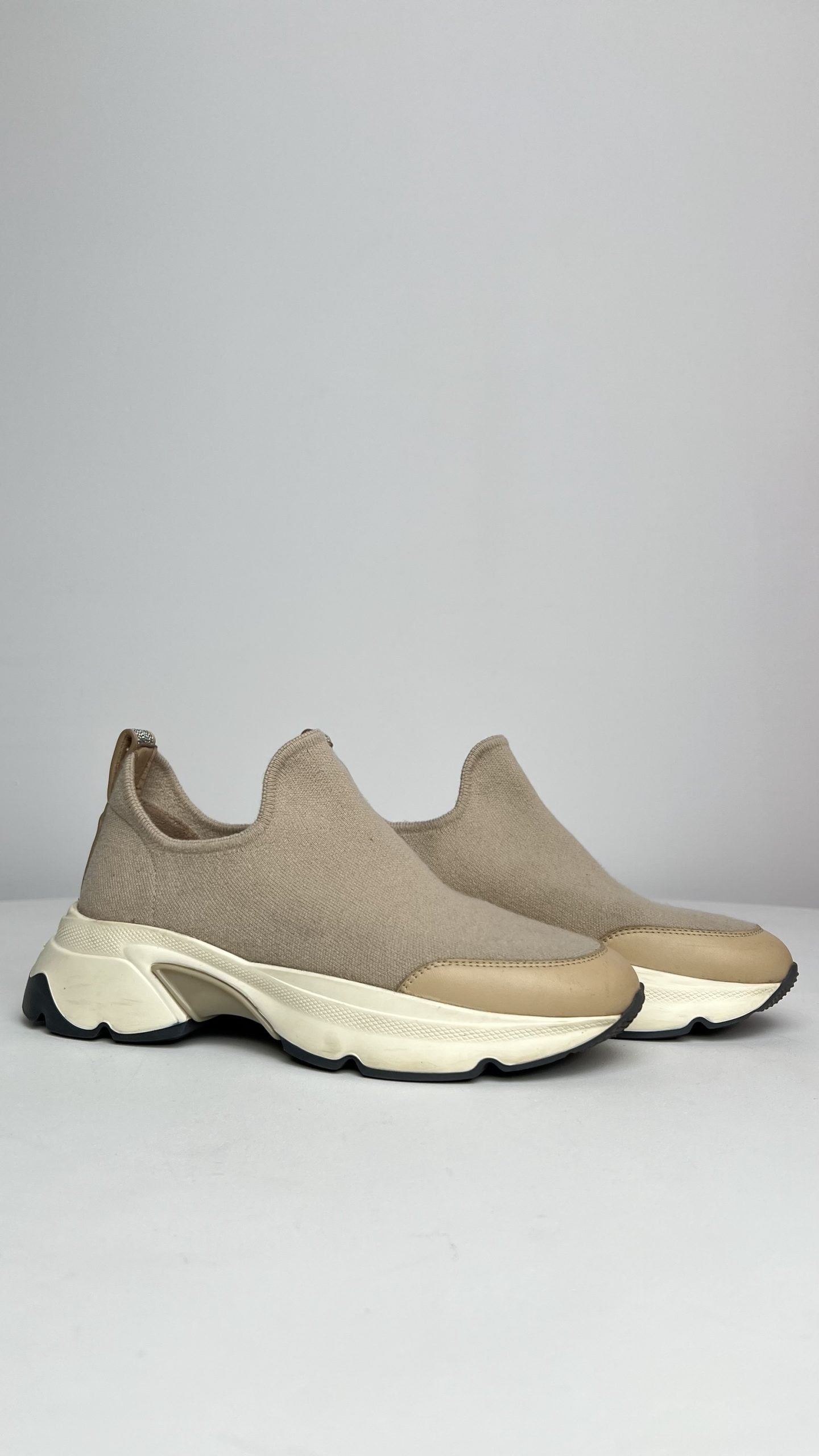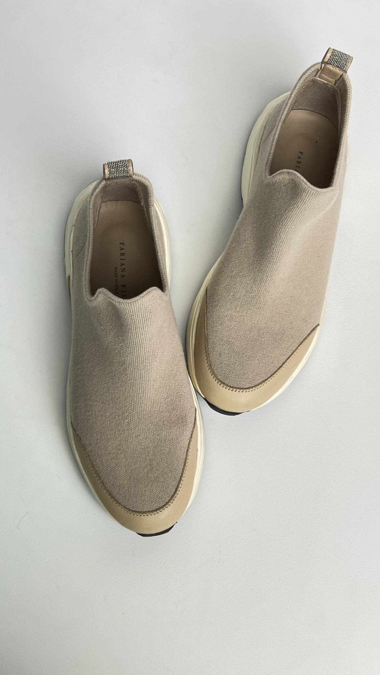 Бежеві кросівки Fabiana Filippi у стилі slip-on — лаконічна та витончена модель із вовни та кашеміру з м’якою посадкою по нозі. Має акцентну масивну підошву в тон із плавним переходом кольорів і легкий блиск фірмової окантовки