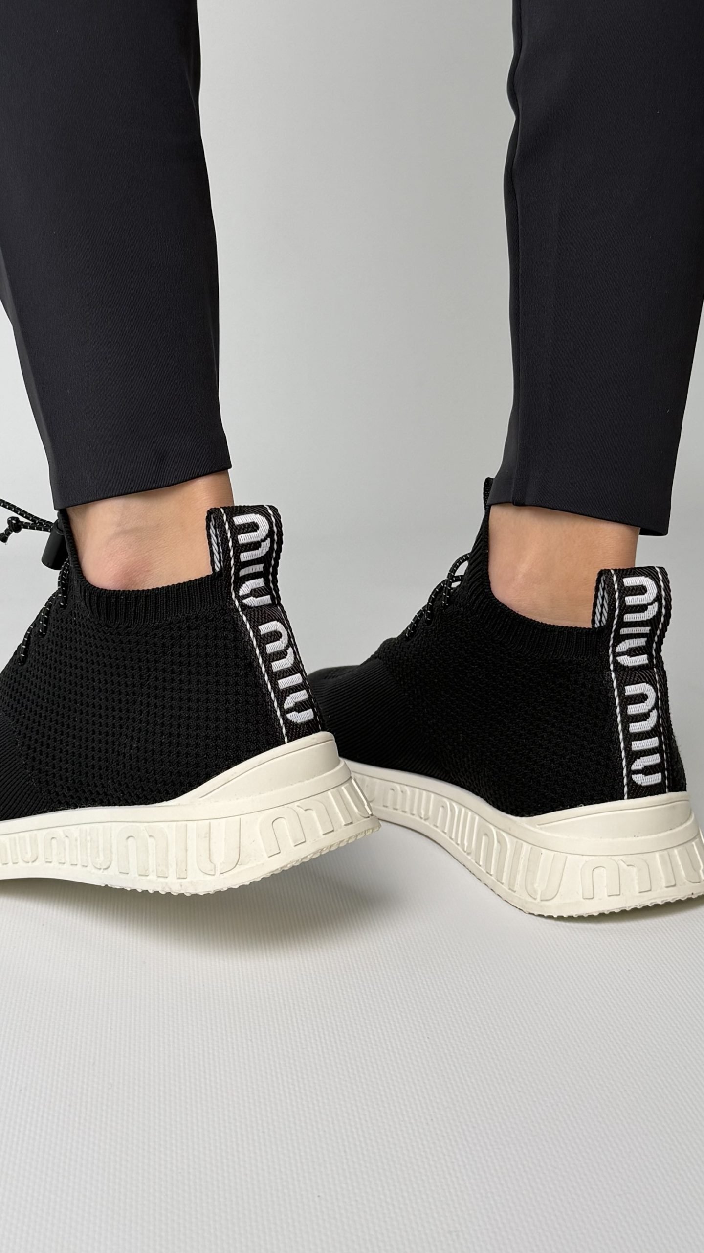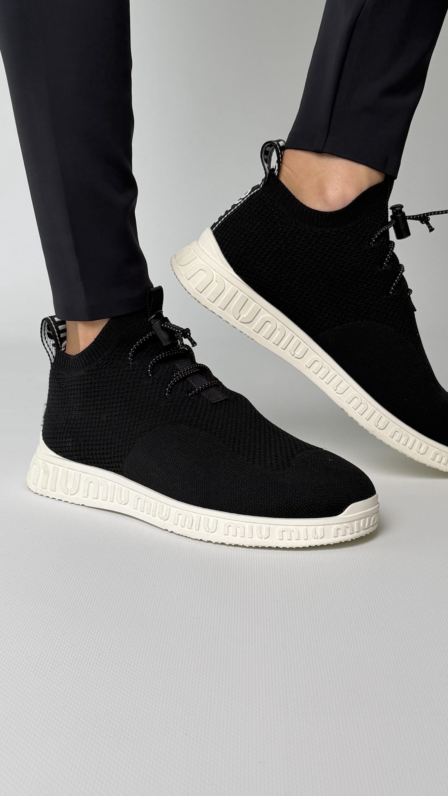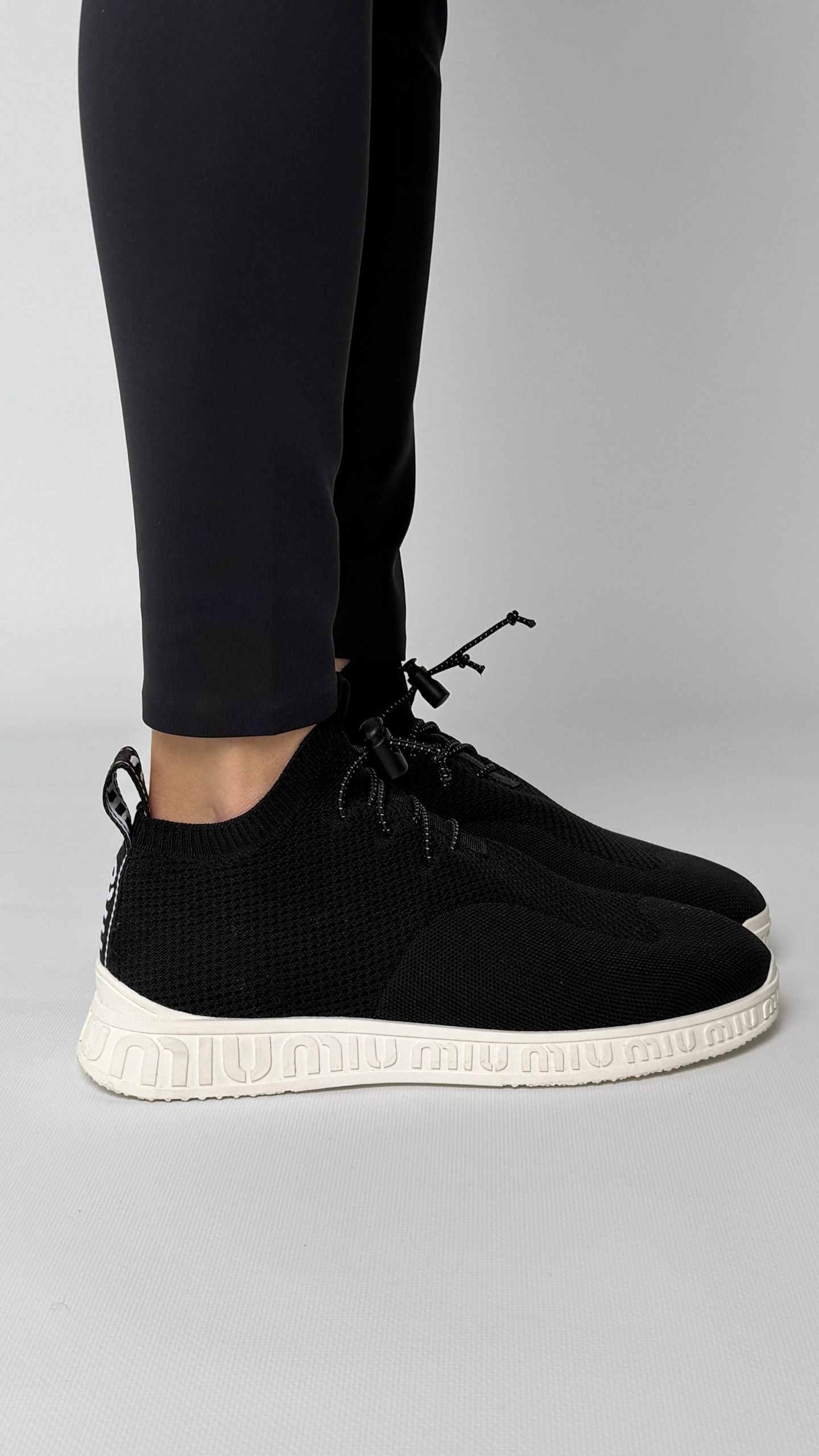 Кросівки Miu Miu чорного кольору з трикотажу, на зручній гумовій підошві з об’ємним логотипом бренду по периметру. М’які, еластичні, легко адаптуються до стопи