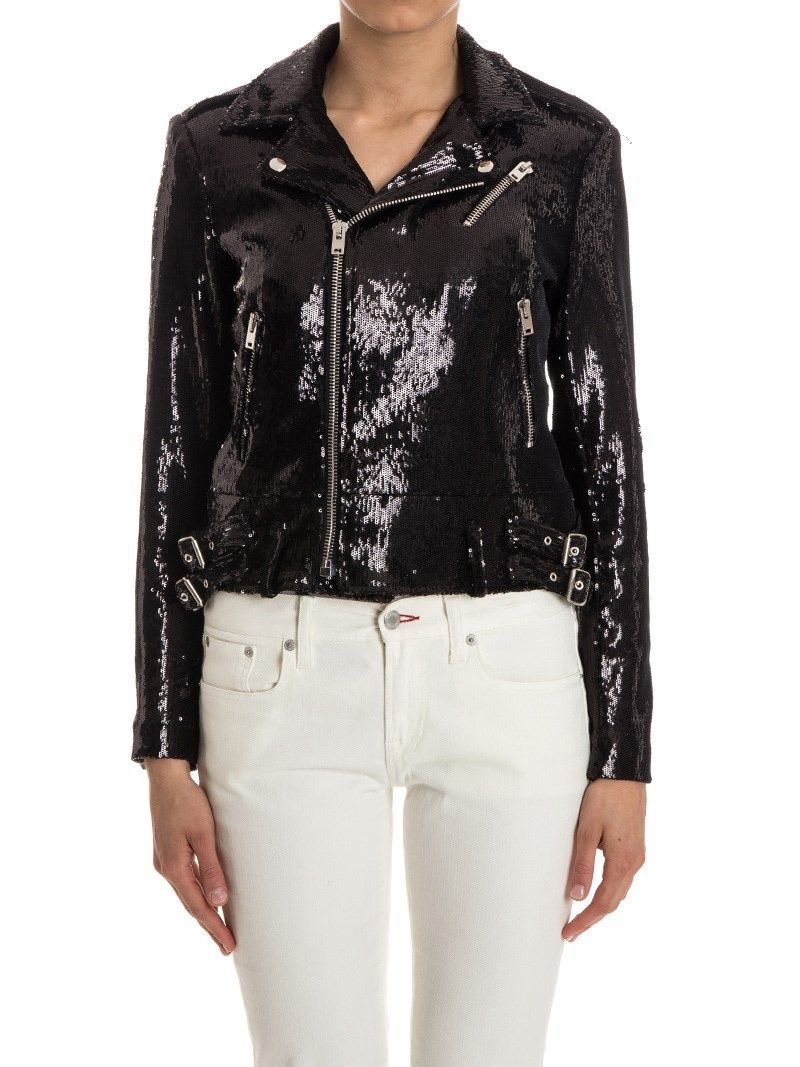 Чорна куртка IRO Jeans, культова байкерська модель у стильному виконанні з паєтками. Має асиметричну застібку-блискавку, срібну фурнітуру, ремінь на талії та класичні лацкани. Ідеальна для вечірніх виходів або акцентного street-look