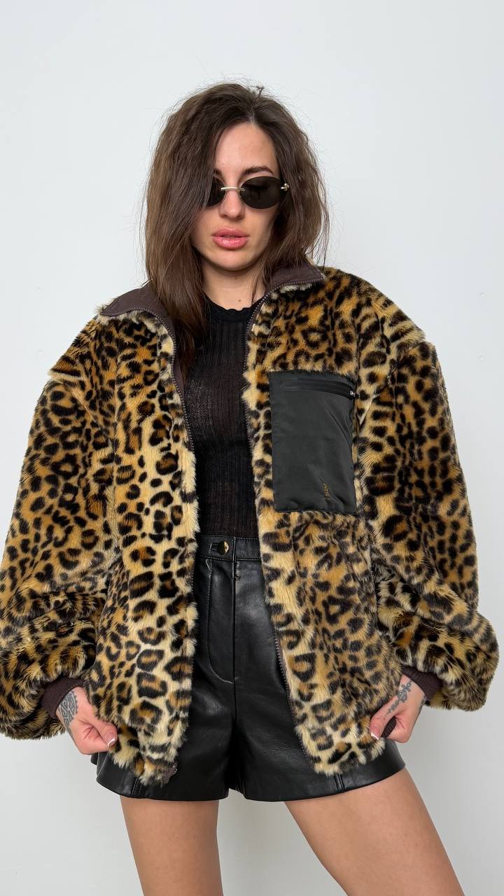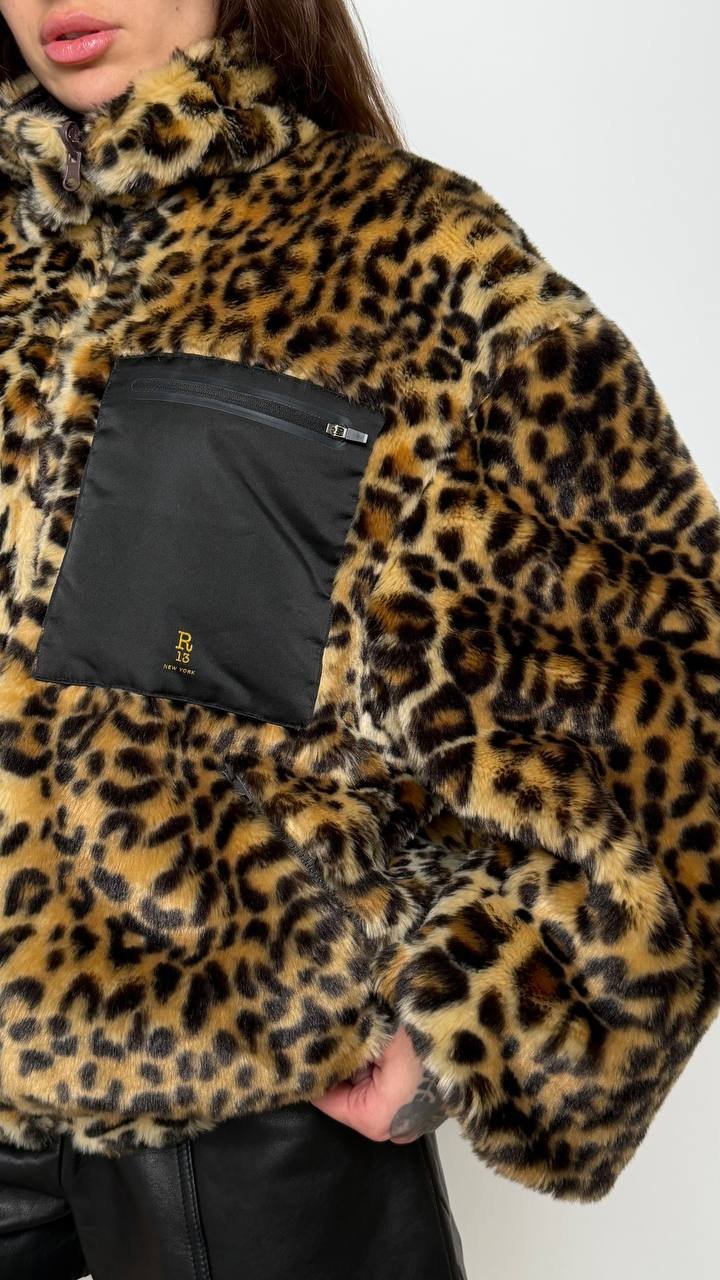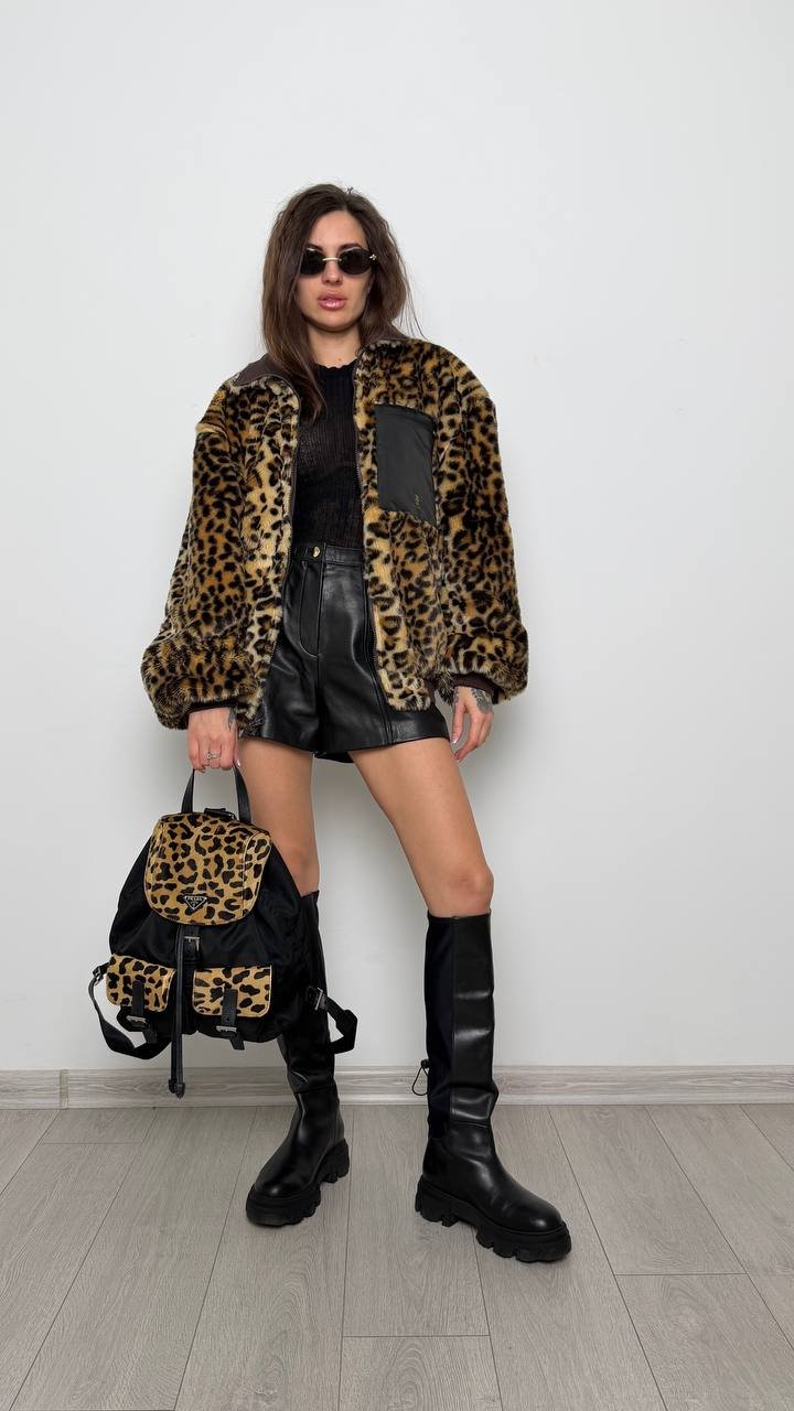 Двостороння куртка R13 — сміливе поєднання леопардового екохутра та класичного нейлону. Легка, тепла і стильна, вона дозволяє створювати два різних образи — від бунтарського до мінімалістичного
