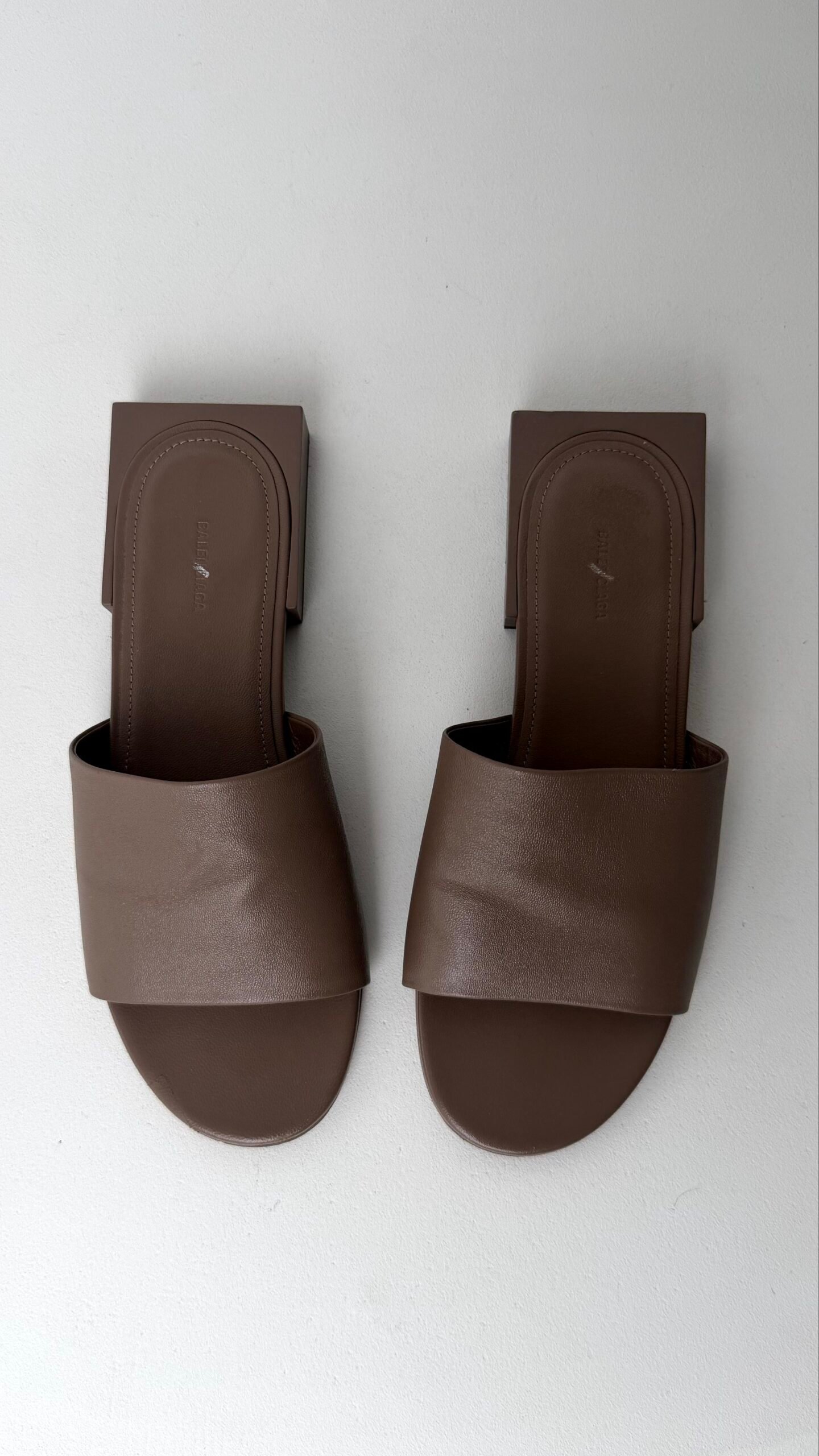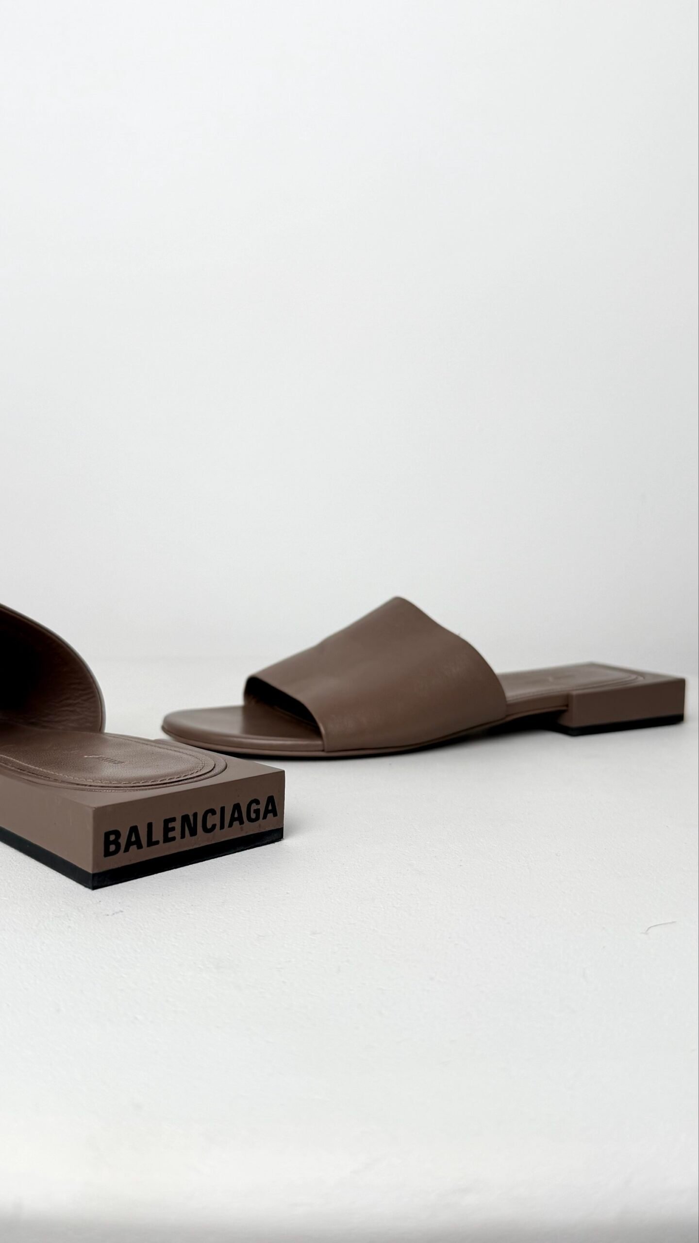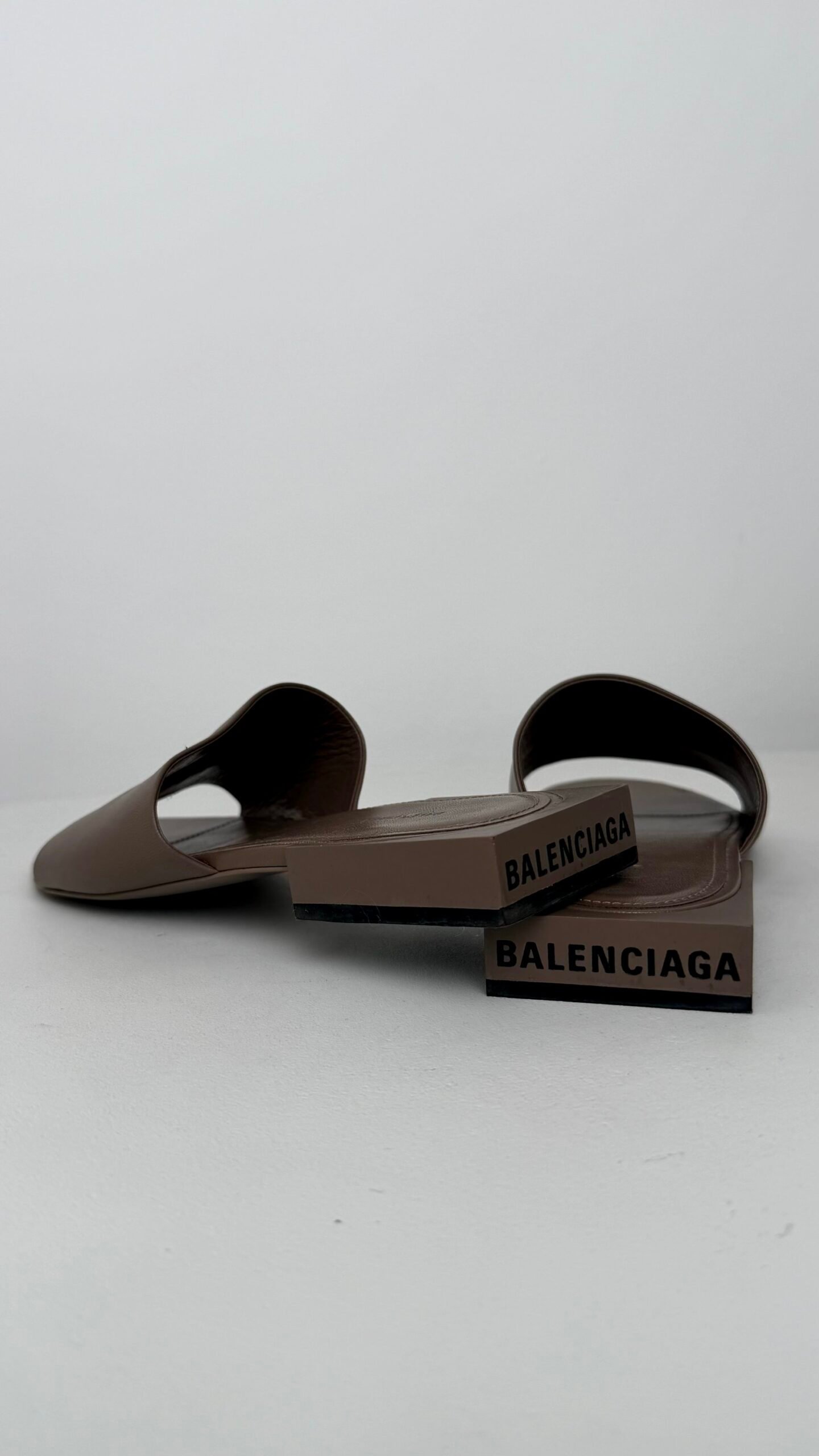 Додайте до свого гардероба нотку високої моди з цими лаконічними мюлями від Balenciaga. Модель виконана у глибокому тауповому (сіро-коричневому) відтінку, що робить їх ідеальною базою для будь-якого літнього образу — від класичних штанів до легких суконь.
