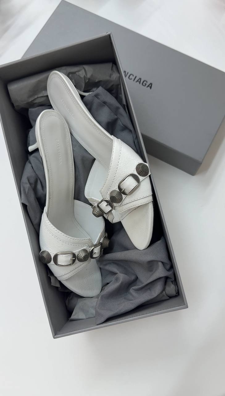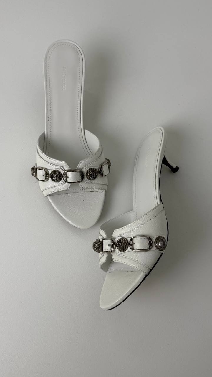 Елегантні білі шльопанці з ремінцями та металевими пряжками, що додають вишуканості