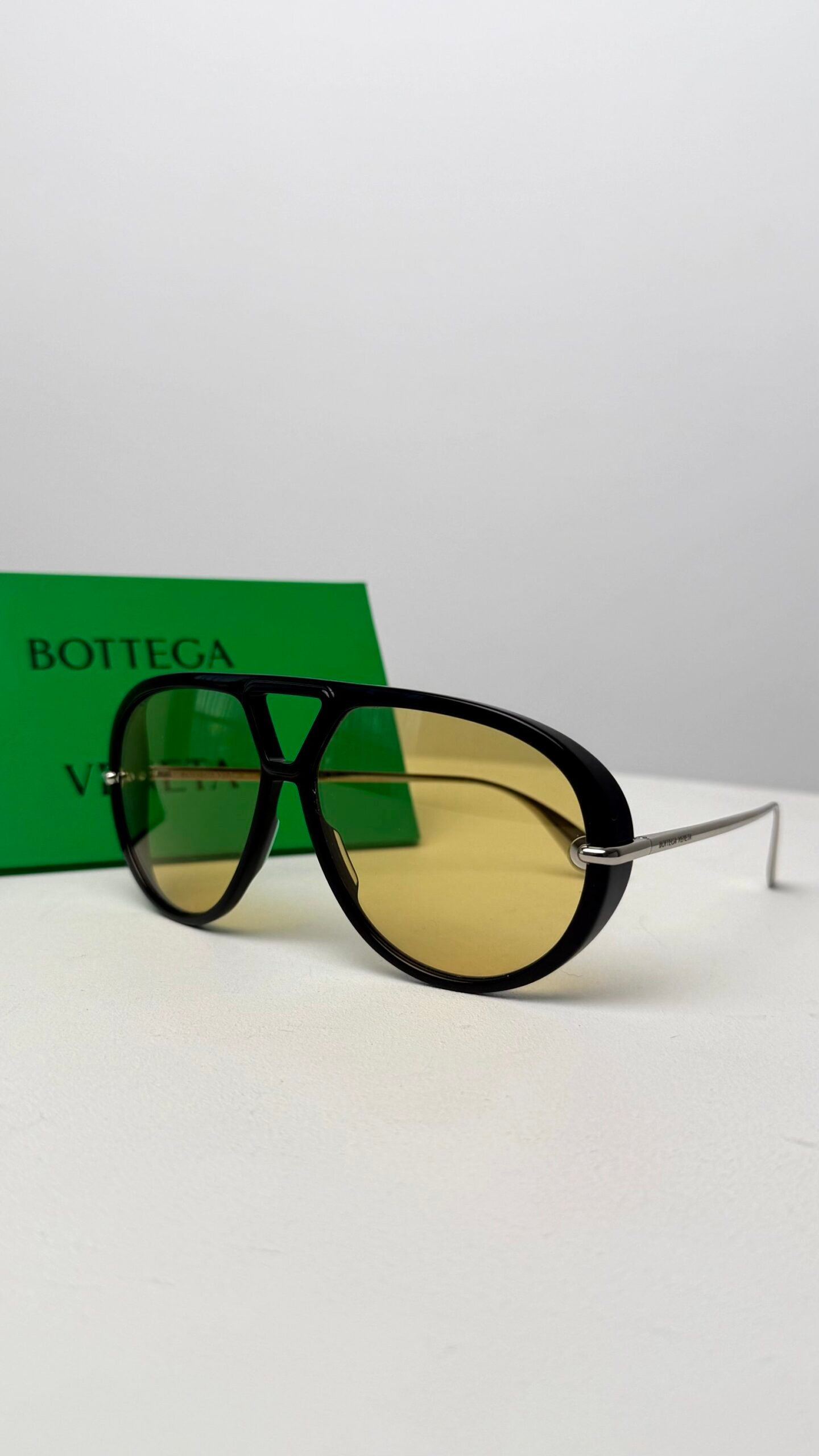 Ця модель — сміливе переосмислення класичної форми “авіатор” у фірмовій естетиці Bottega Veneta. Масивна оправа з чорного глянцевого ацетату в поєднанні з лінзами м’якого жовтого відтінку створює виразний контраст і додає образу ностальгічного шарму 70-х.Unisex. Ідеально підходять як до концептуального street-style, так і до стриманих класичних образів.