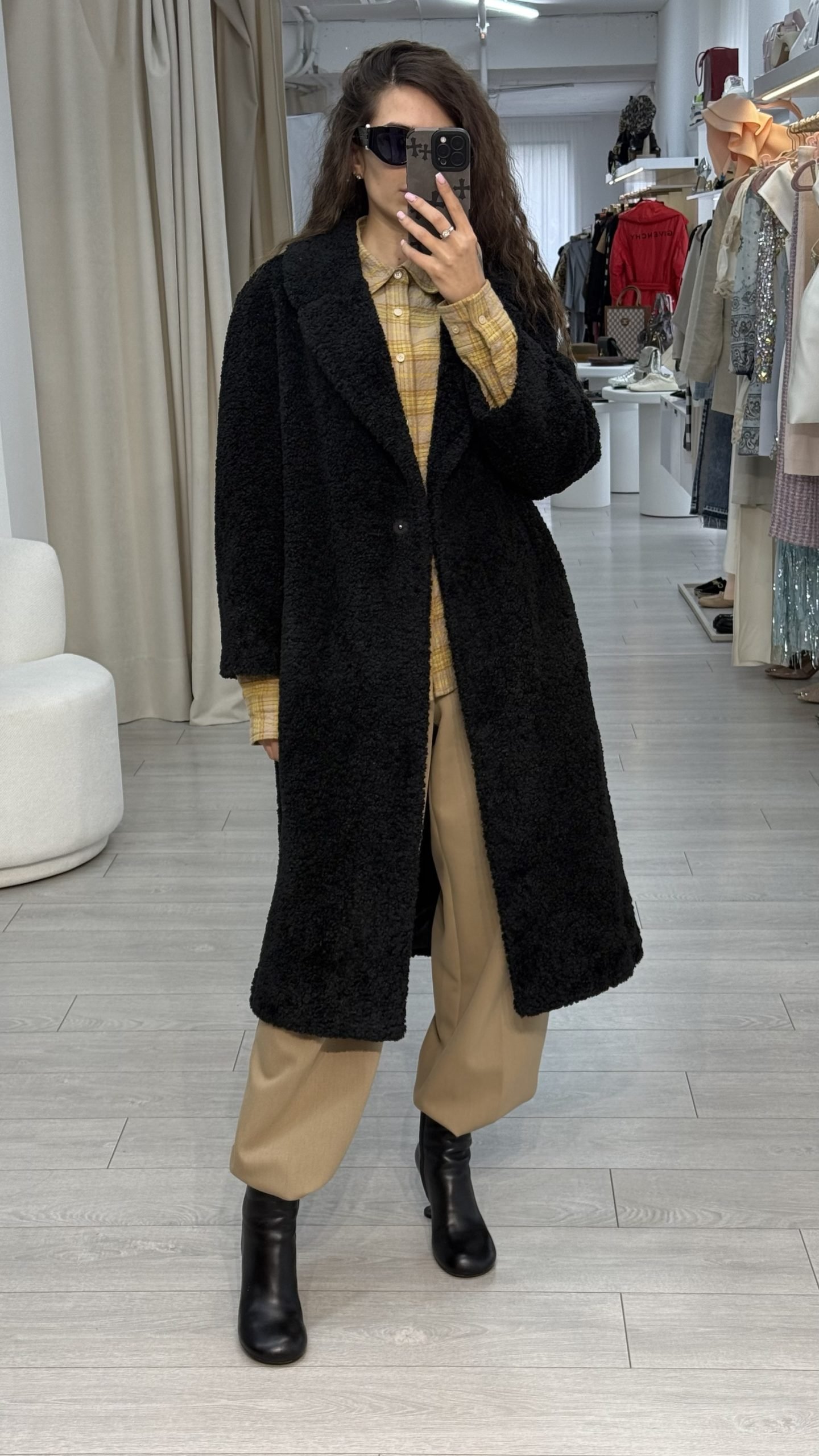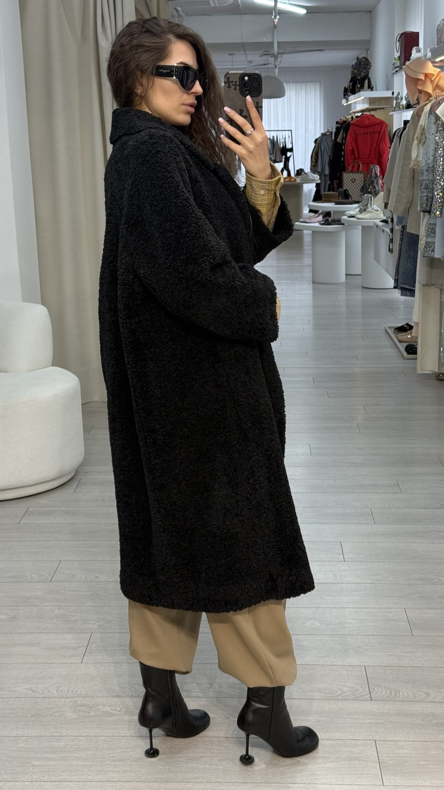 Об’ємне пальто з фактурного букле в насиченому чорному кольорі та укороченим рукавом