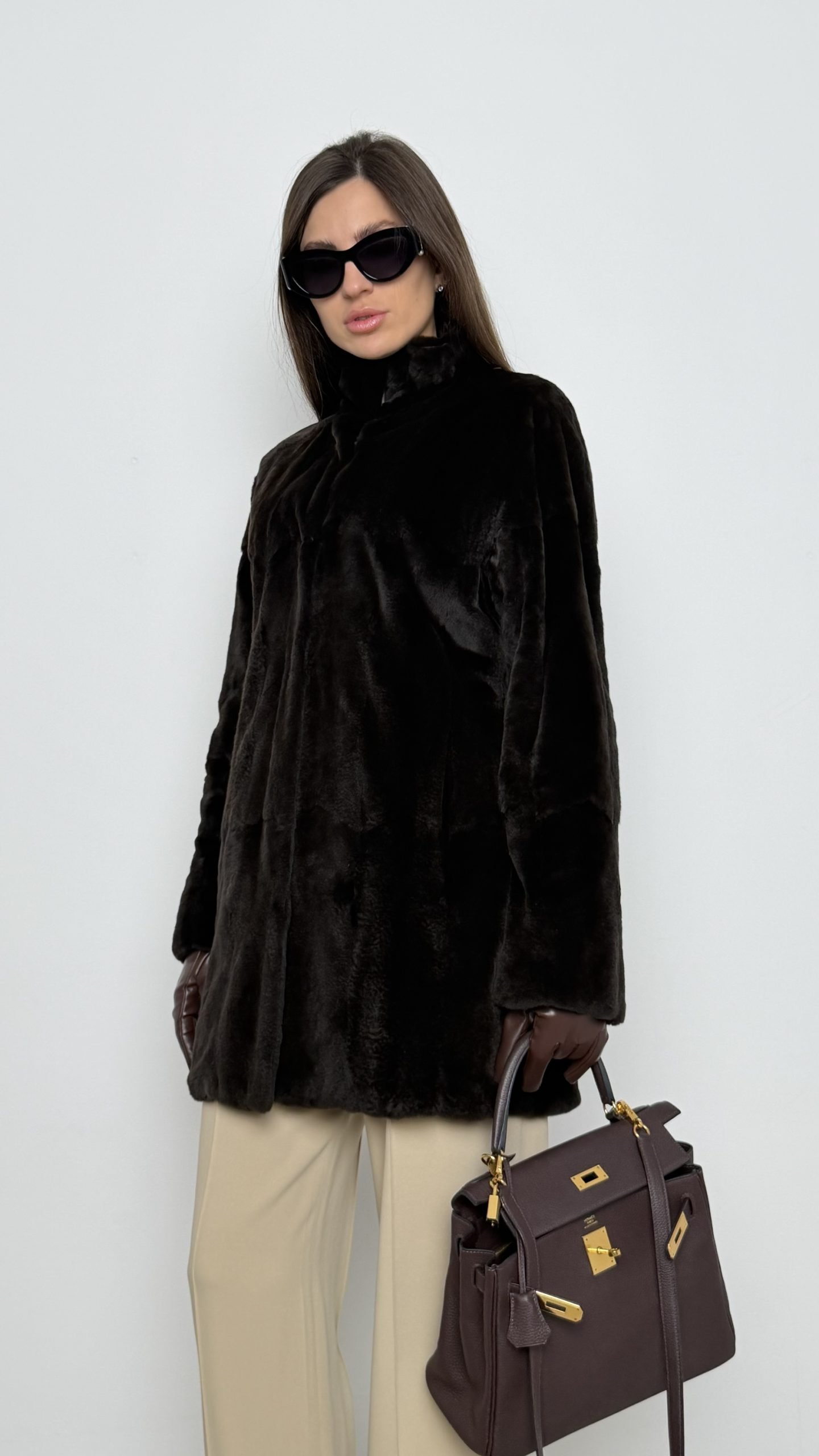 Шуба у глибокому шоколадному кольорі — з 100% хутра ласки.