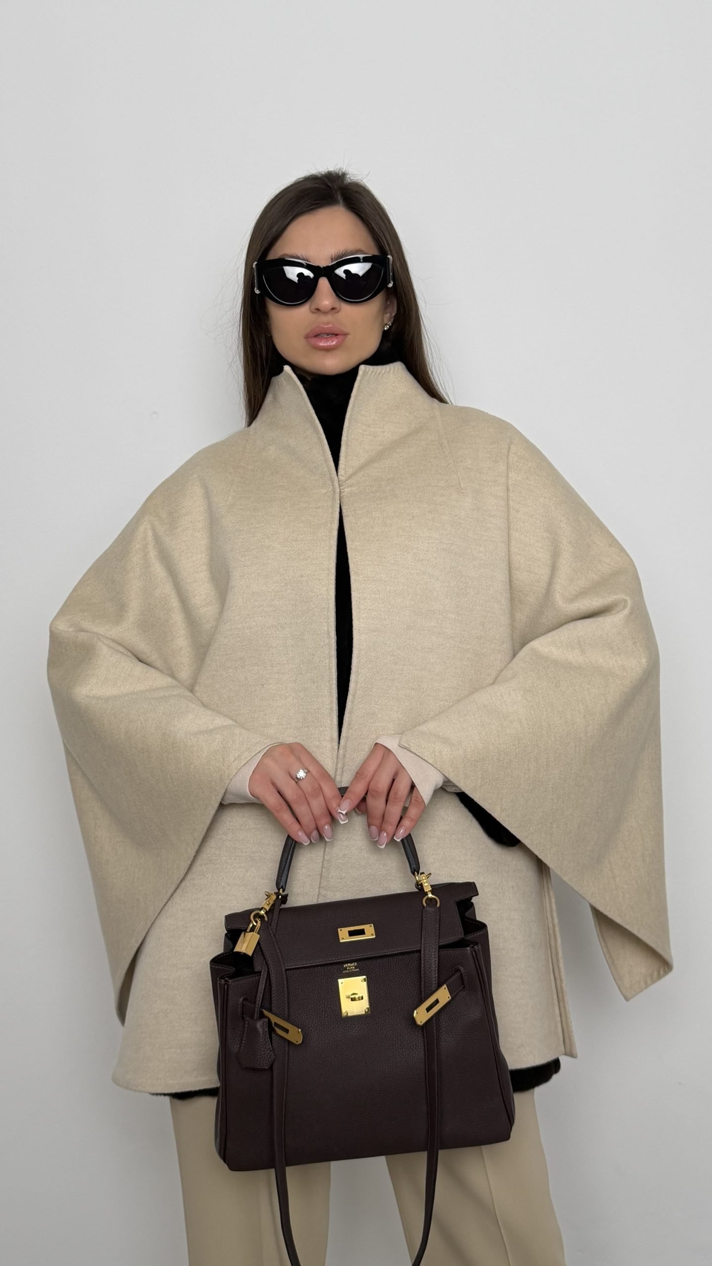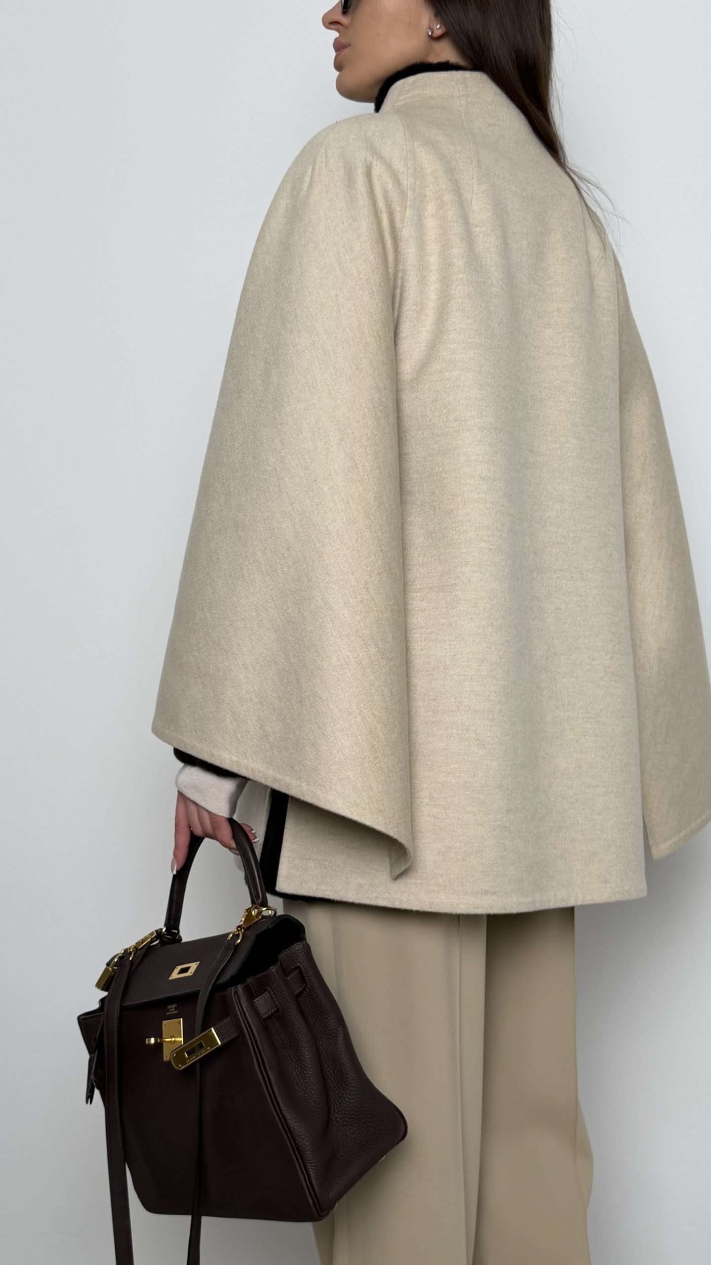 Кейп у молочному відтінку виконаний зі 100% кашеміру.