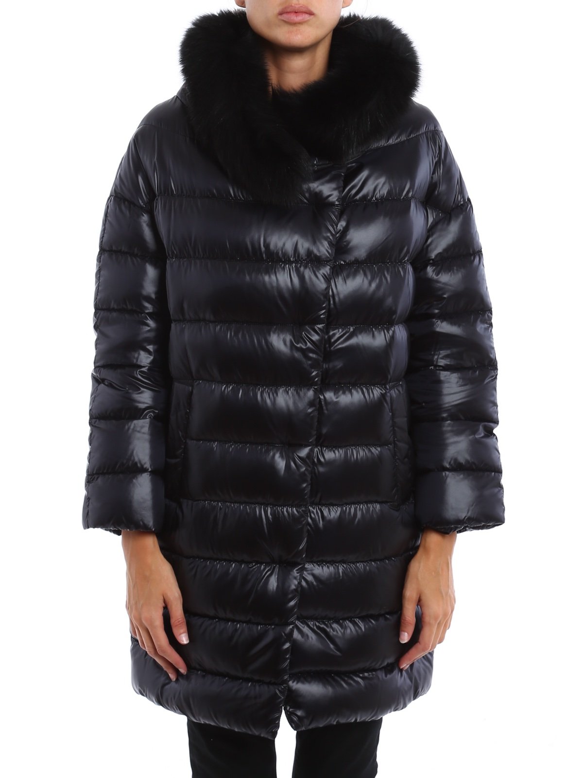 Пуховик HERNO з ефектом глянцю та коміром із натурального хутра — уособлення італійського преміуму. Надлегкий, теплий і стильний — створений для холодного сезону, коли важливо виглядати елегантно