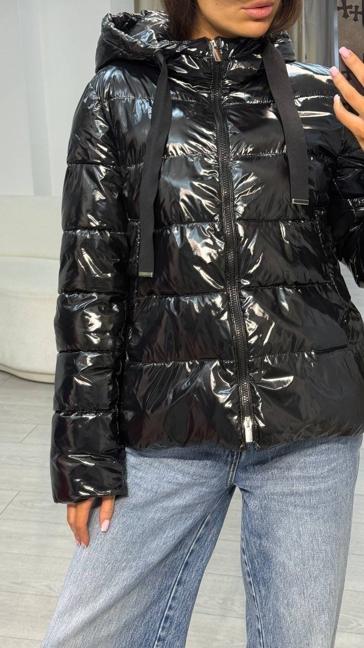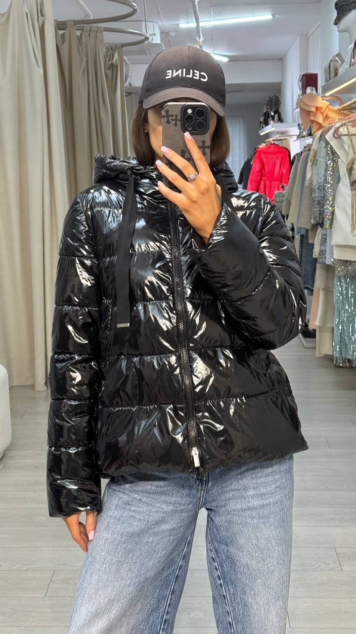 Чорний пуховик Max Mara (Intrend) із блискучої плащової тканини. Модель з капюшоном, обʼємним силуетом та застібкою-блискавкою