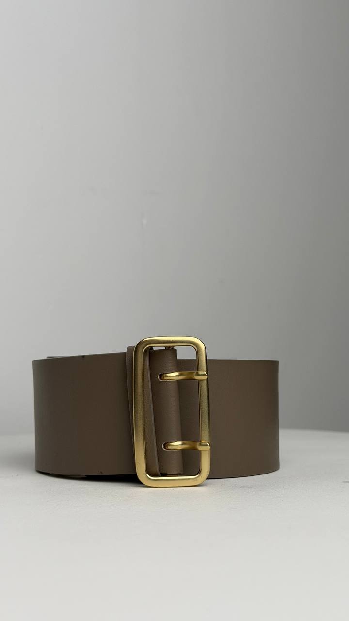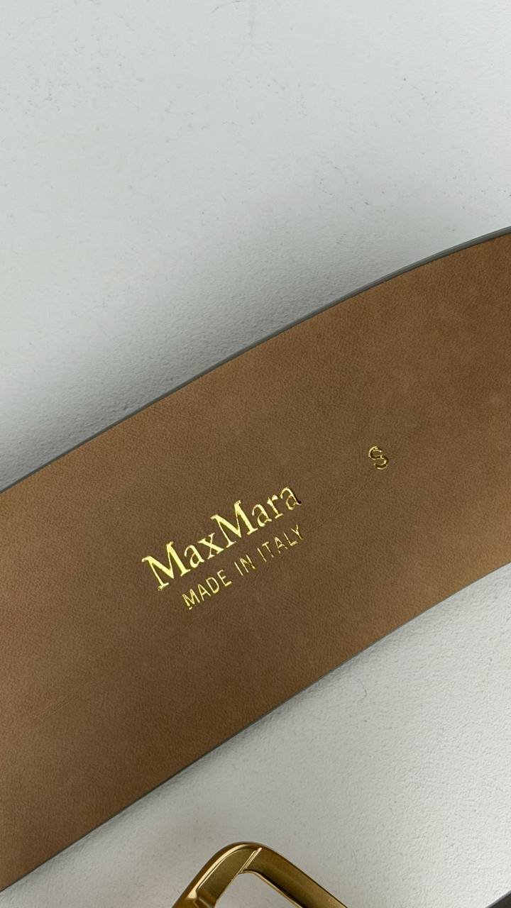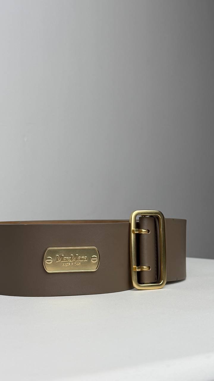 Широкий преміальний пояс Max Mara у благородному taupe-відтінку. Аксесуар виконаний із гладкої натуральної шкіри та доповнений масивною золотою пряжкою й фірмовою табличкою Max Mara Runway. Ідеально акцентує талію та додає образу лаконічного люксового шику