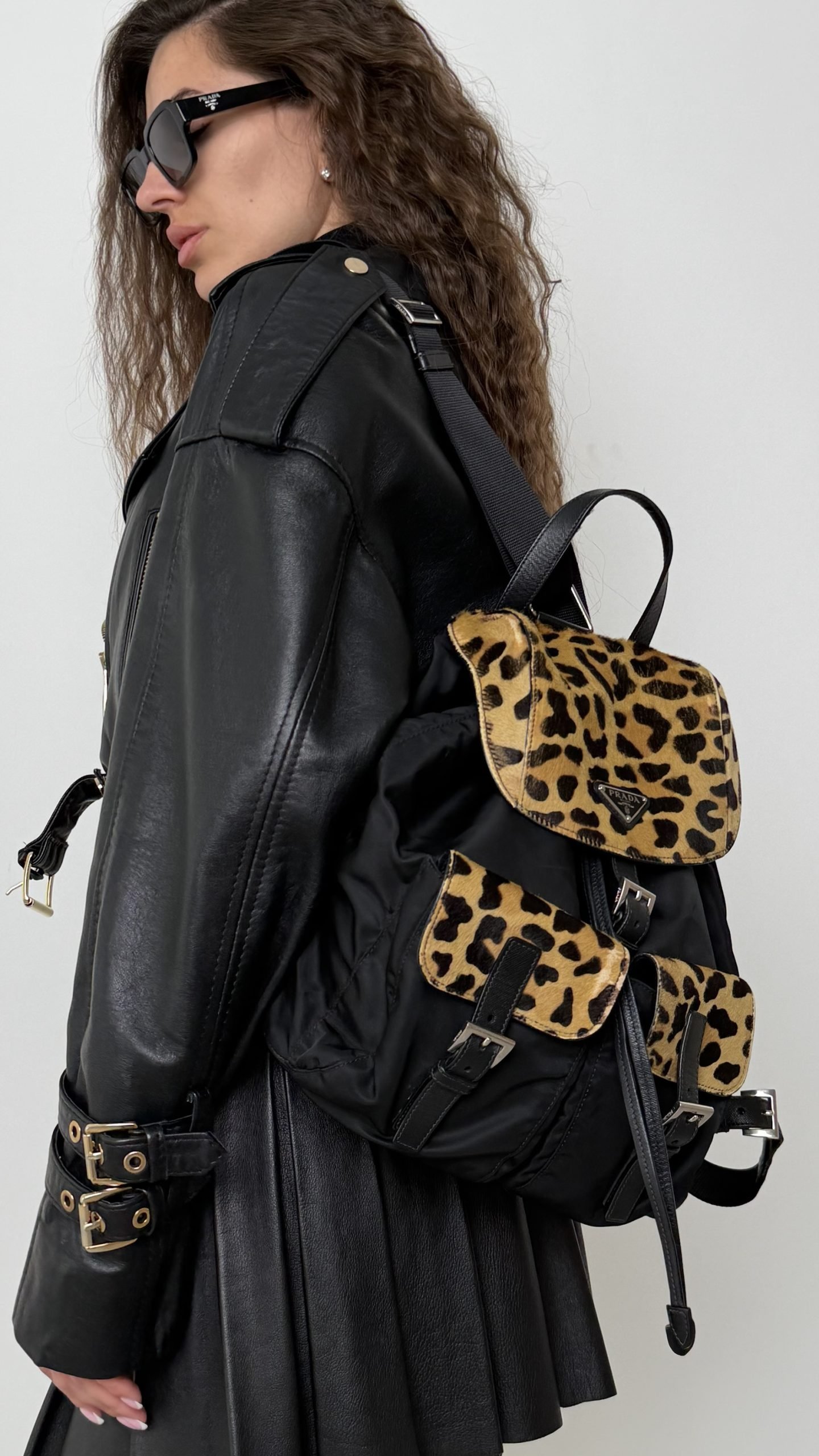 Рюкзак Prada з культової нейлонової серії, доповнений вставками з леопардовим принтом із пони. Має клапан та передні кишені на пряжках, зручні регульовані лямки й фірмовий металевий трикутний логотип
